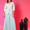 The Aqua Mist Embroidered Jacket Co-ord Set is a picture of serene elegance, blending traditional Indian craftsmanship with a chic, modern silhouette. This stunning two or three-piece ensemble (depending on whether the jacket is a standalone top or worn over a crop top/cami) is rendered in a refreshing light aqua blue or pastel mint green hue, reminiscent of cool seawater or a gentle spring sky.