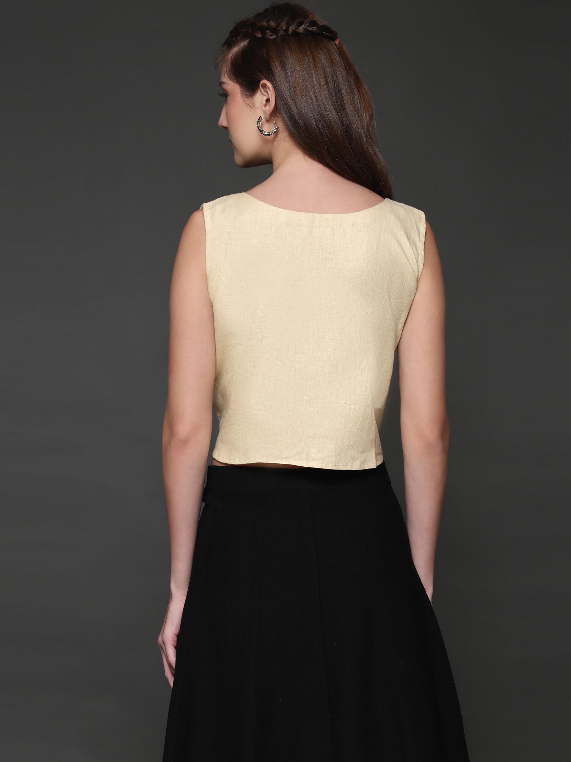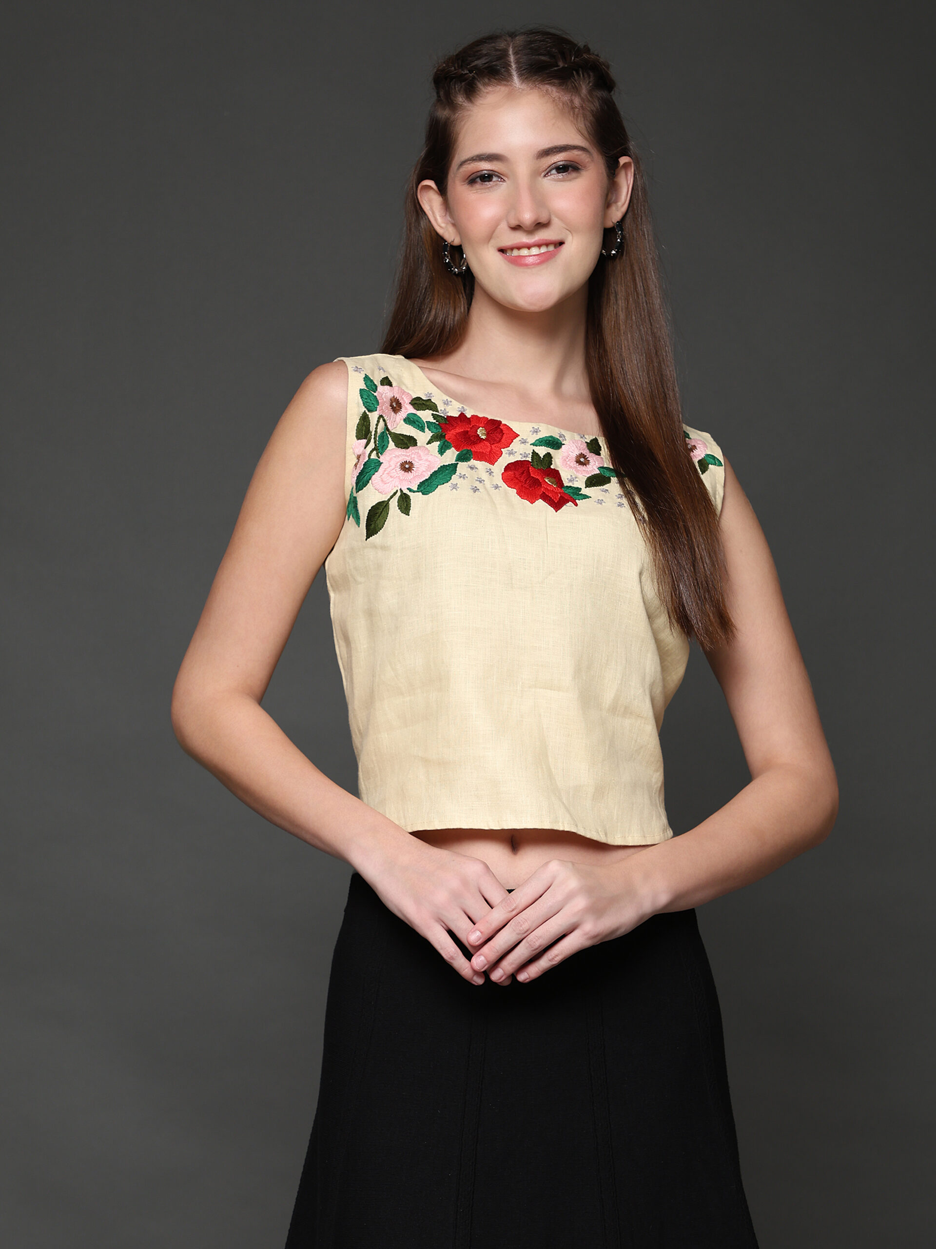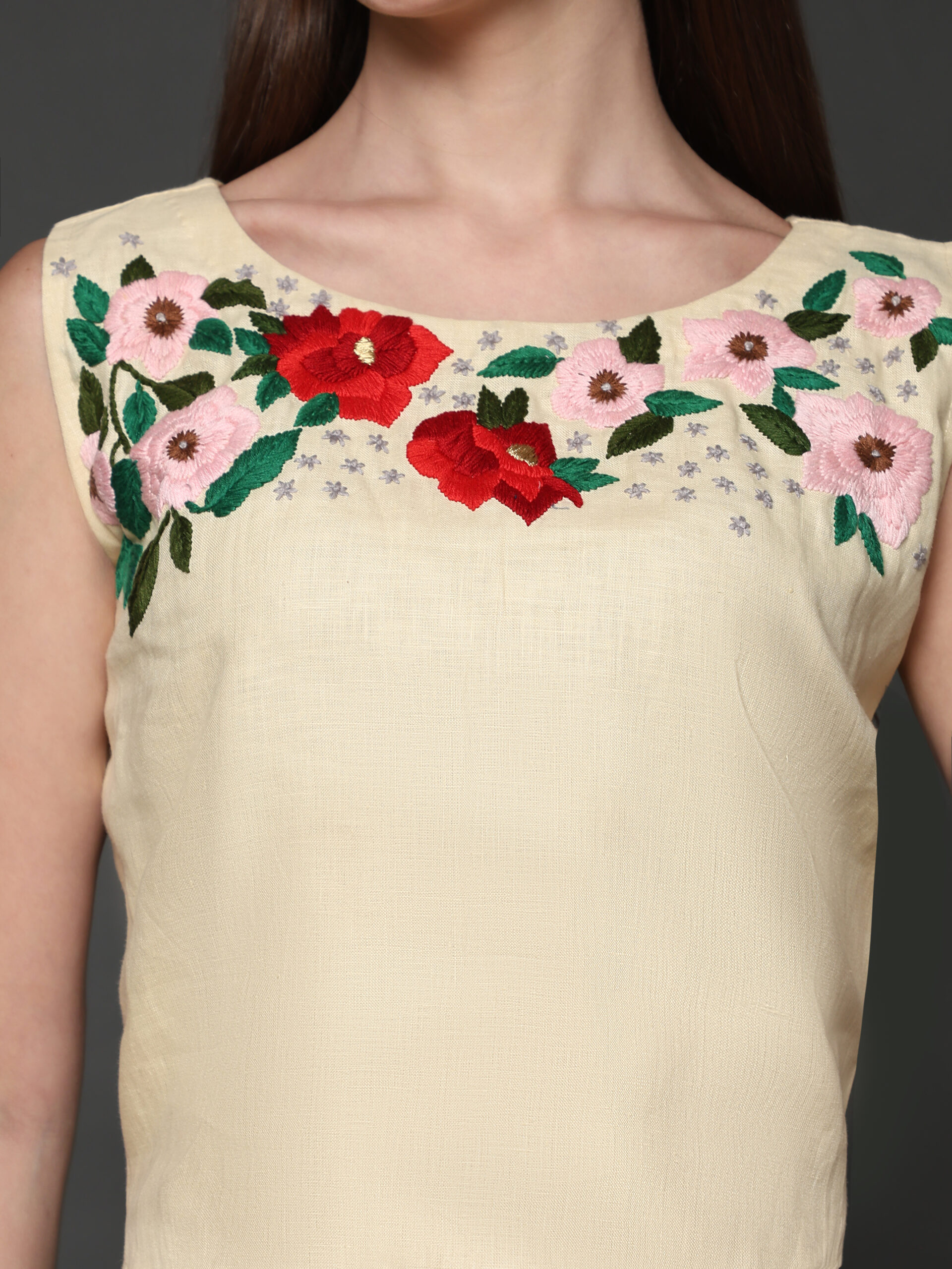 Beige Pure Hemp Embroidered Top with Relax Fit Silhouette, premium breathable fabric, designer embroidery, perfect for smart casual and daily wear.