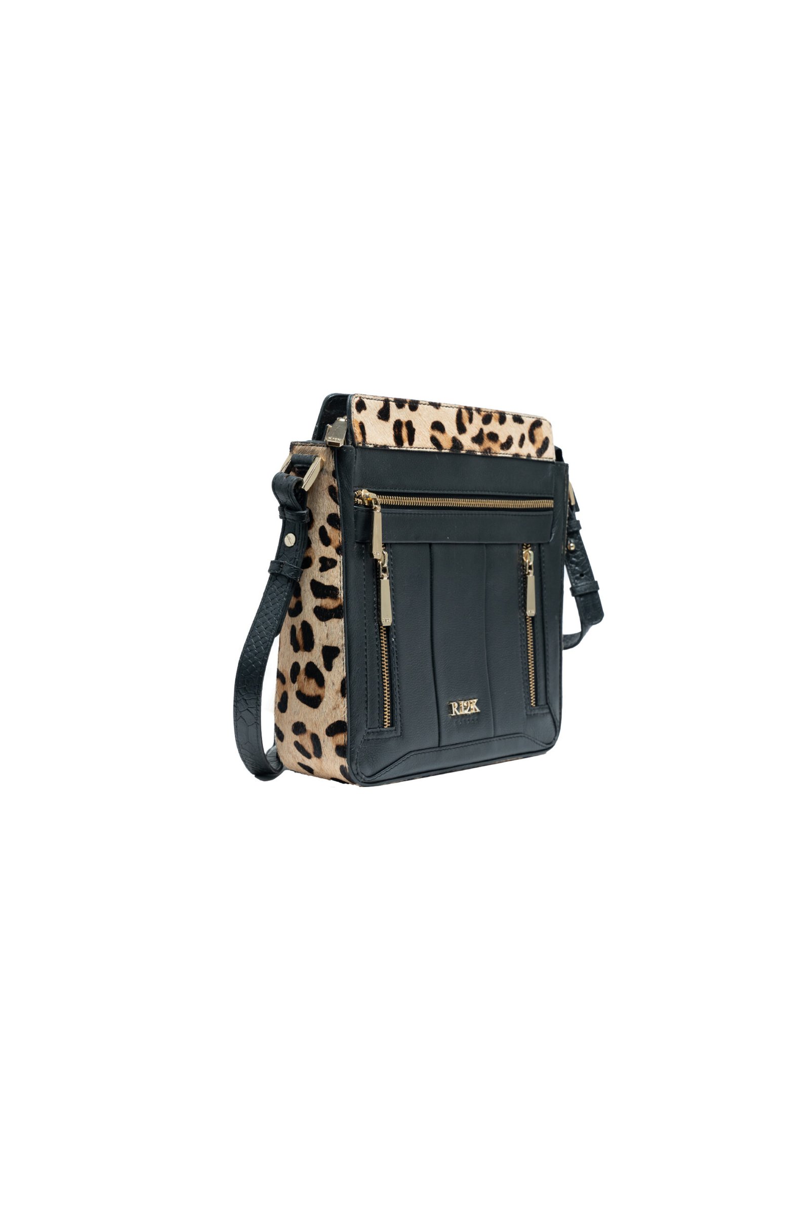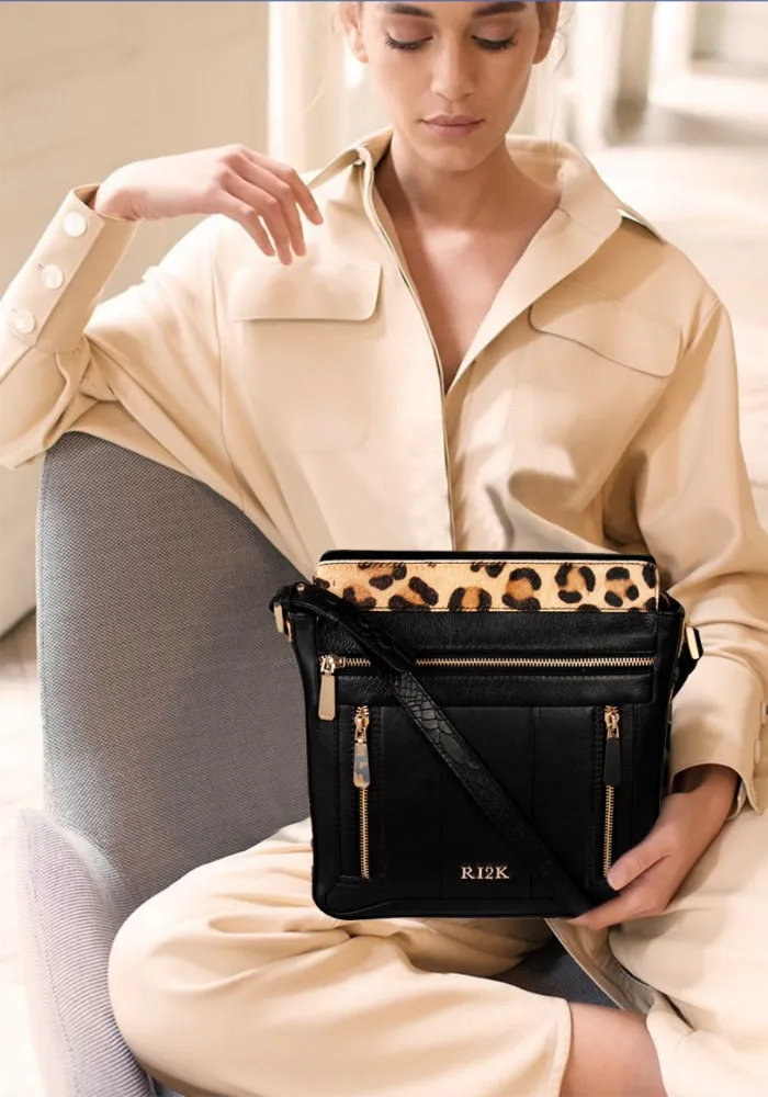 RI2K contemporary sling bag in soft leather is available in two colourways, classic black with leopard hair on and soft grey. Distinctive zip details and a cross body strap makes this the perfect bag