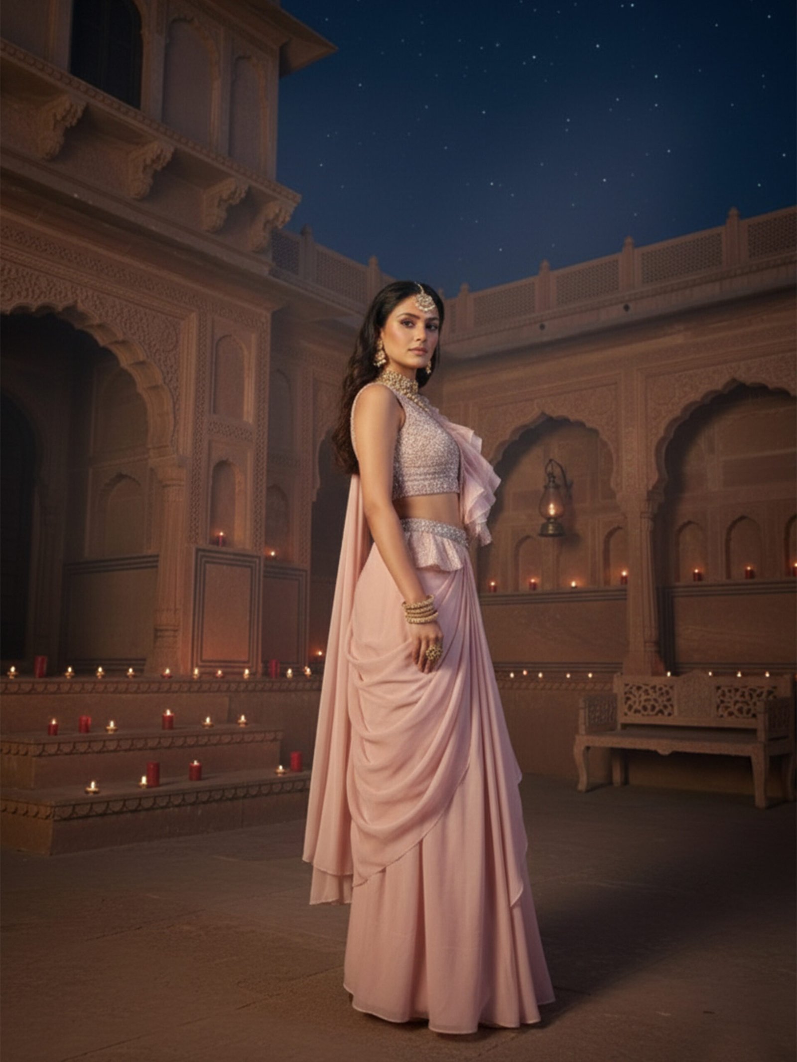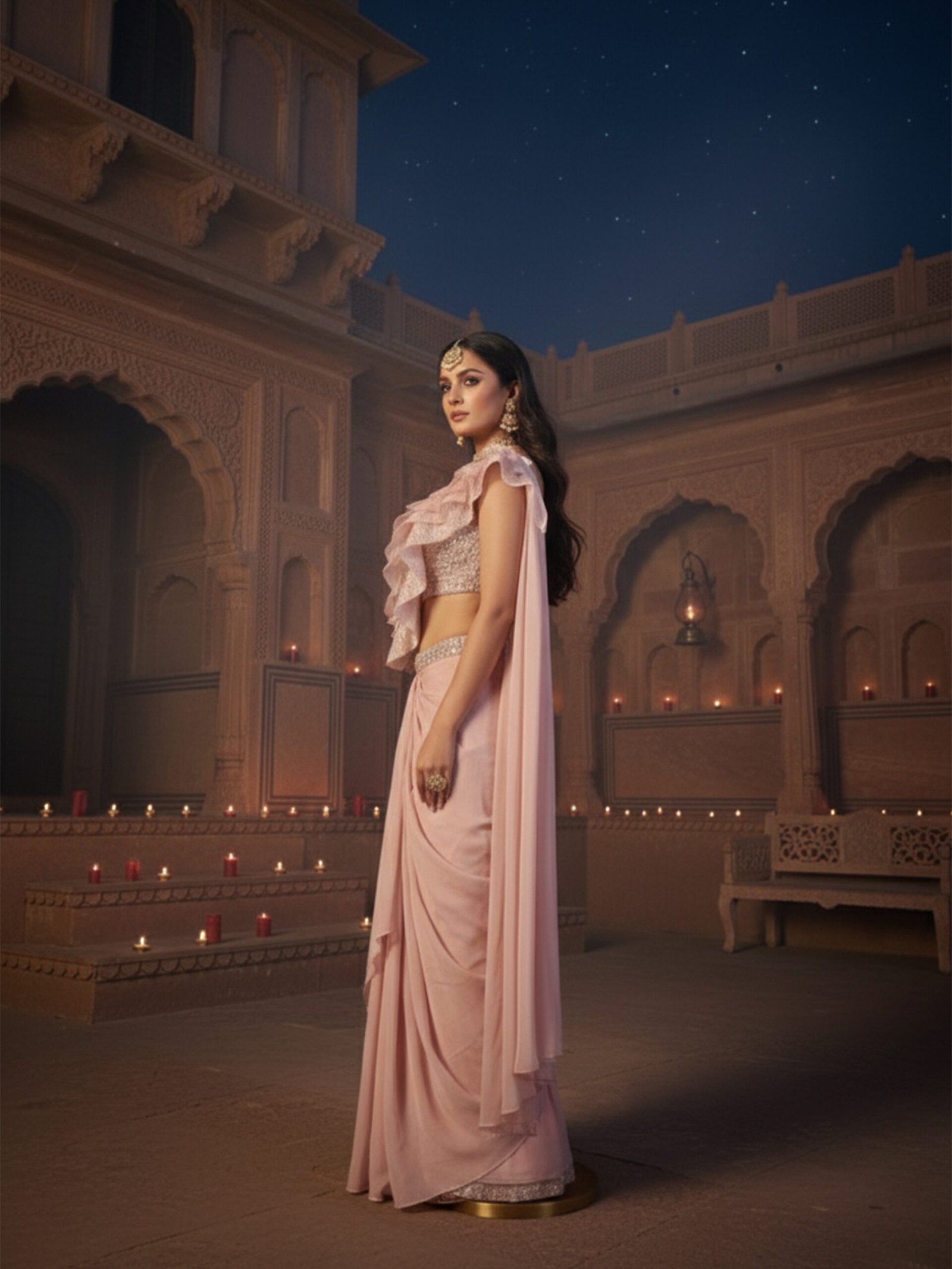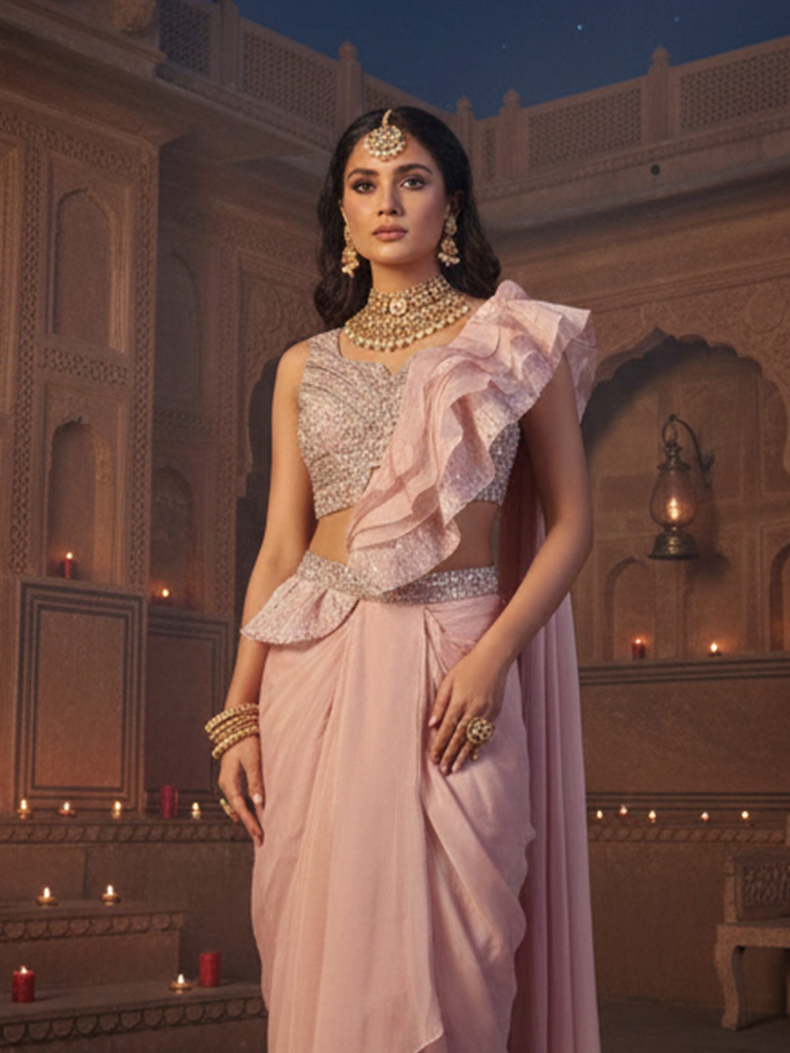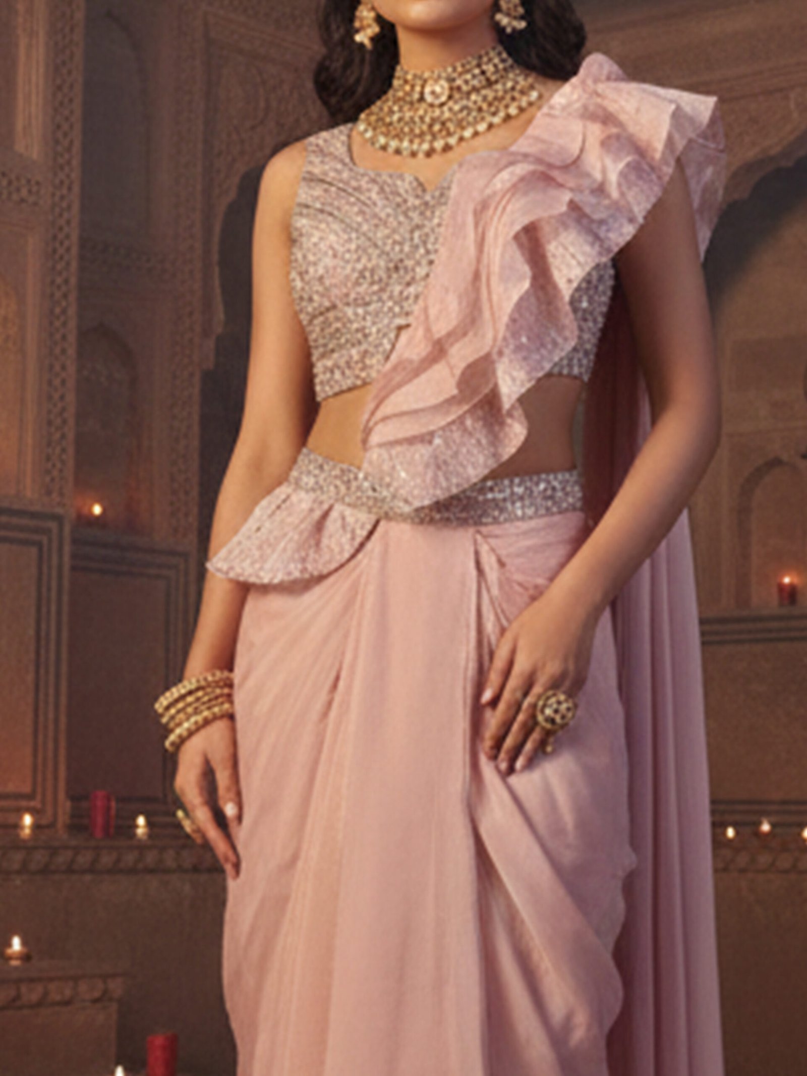 Exude timeless elegance with this Blush Rose Embellished Draped Saree, designed to capture soft glamour and festive charm. Crafted in a ready-to-wear draped silhouette, this saree features delicate ruffle detailing paired with a finely embellished blouse, making it a perfect choice for evening celebrations and wedding occasions.