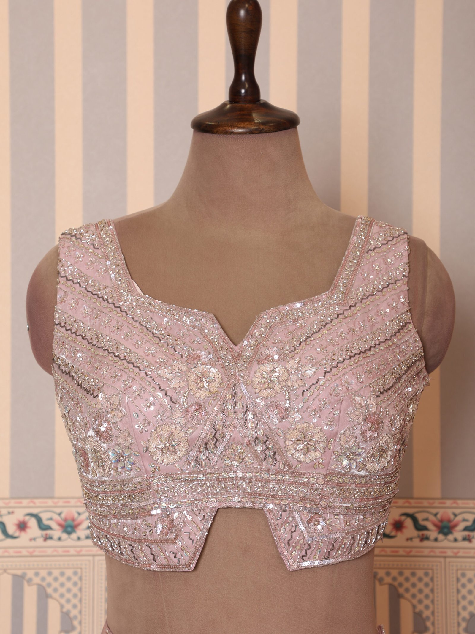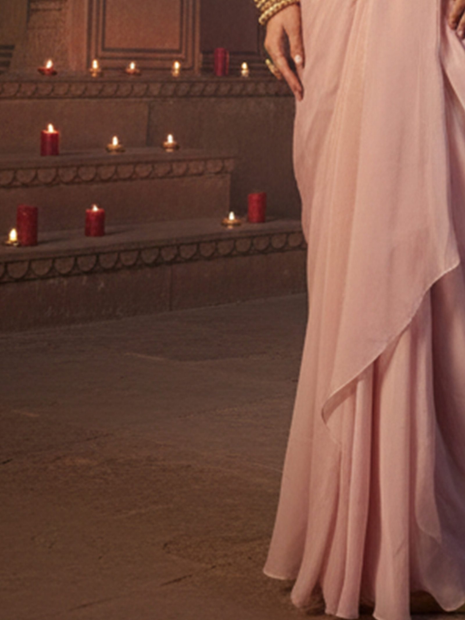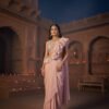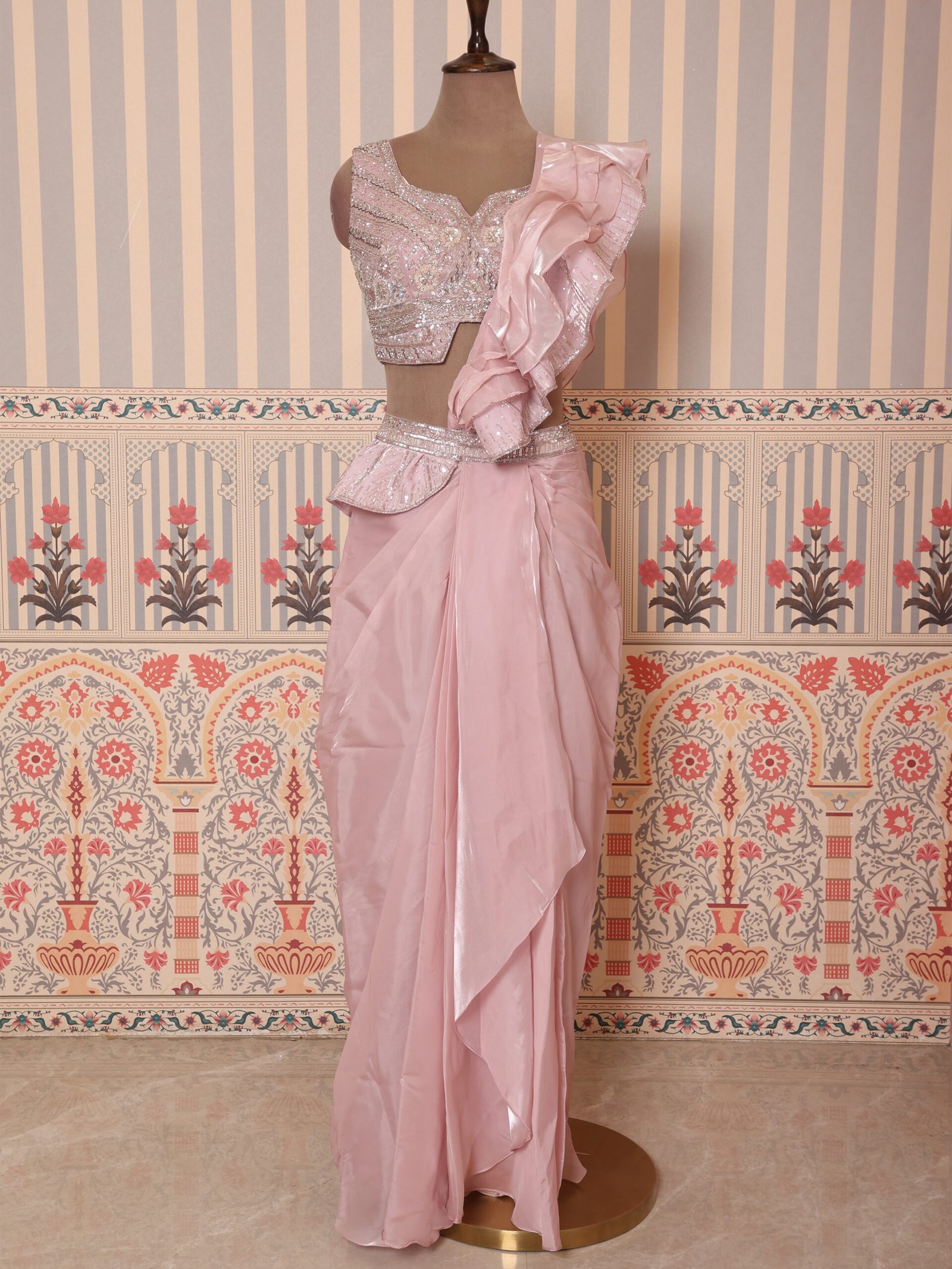 Exude timeless elegance with this Blush Rose Embellished Draped Saree, designed to capture soft glamour and festive charm. Crafted in a ready-to-wear draped silhouette, this saree features delicate ruffle detailing paired with a finely embellished blouse, making it a perfect choice for evening celebrations and wedding occasions.