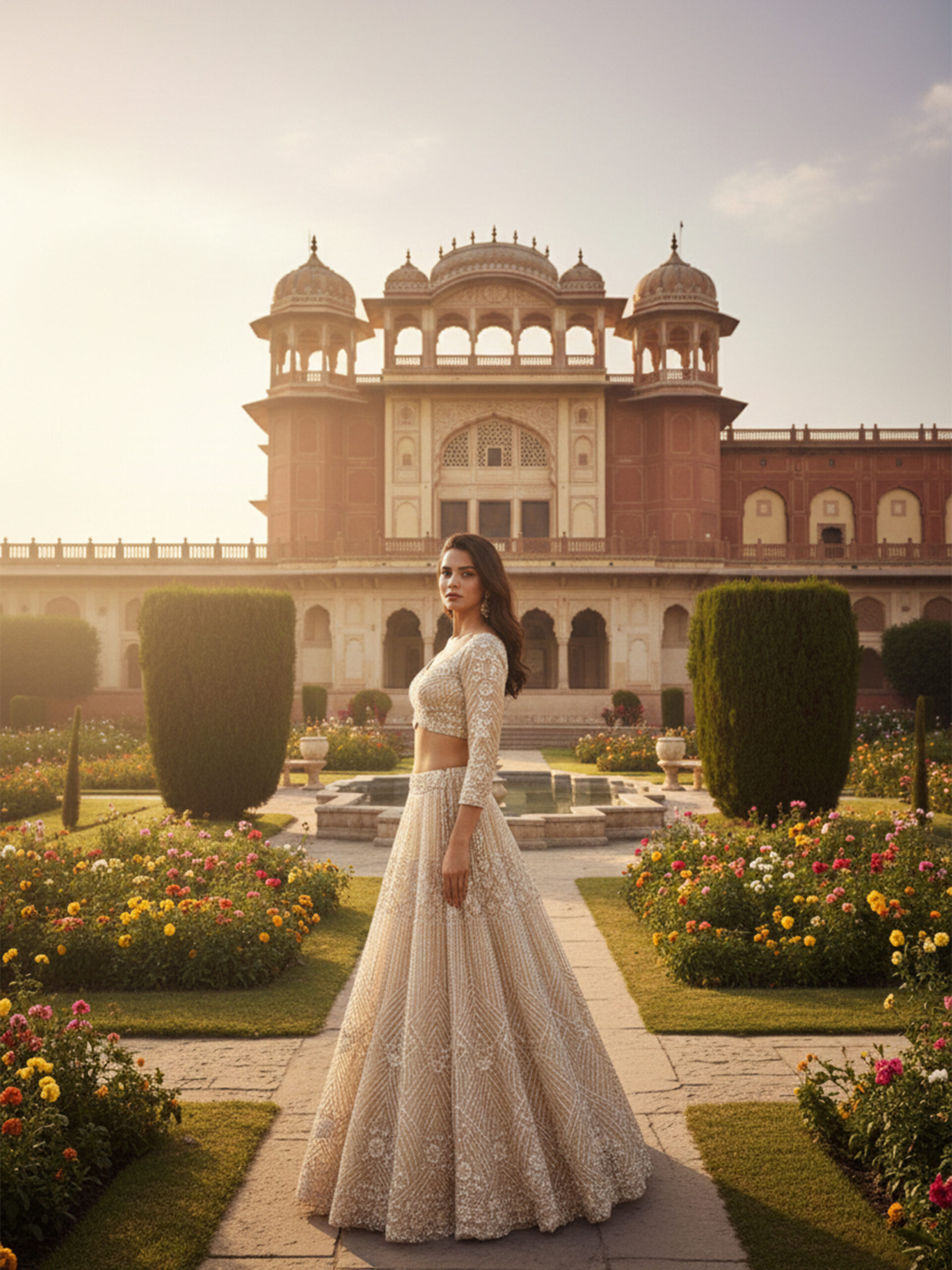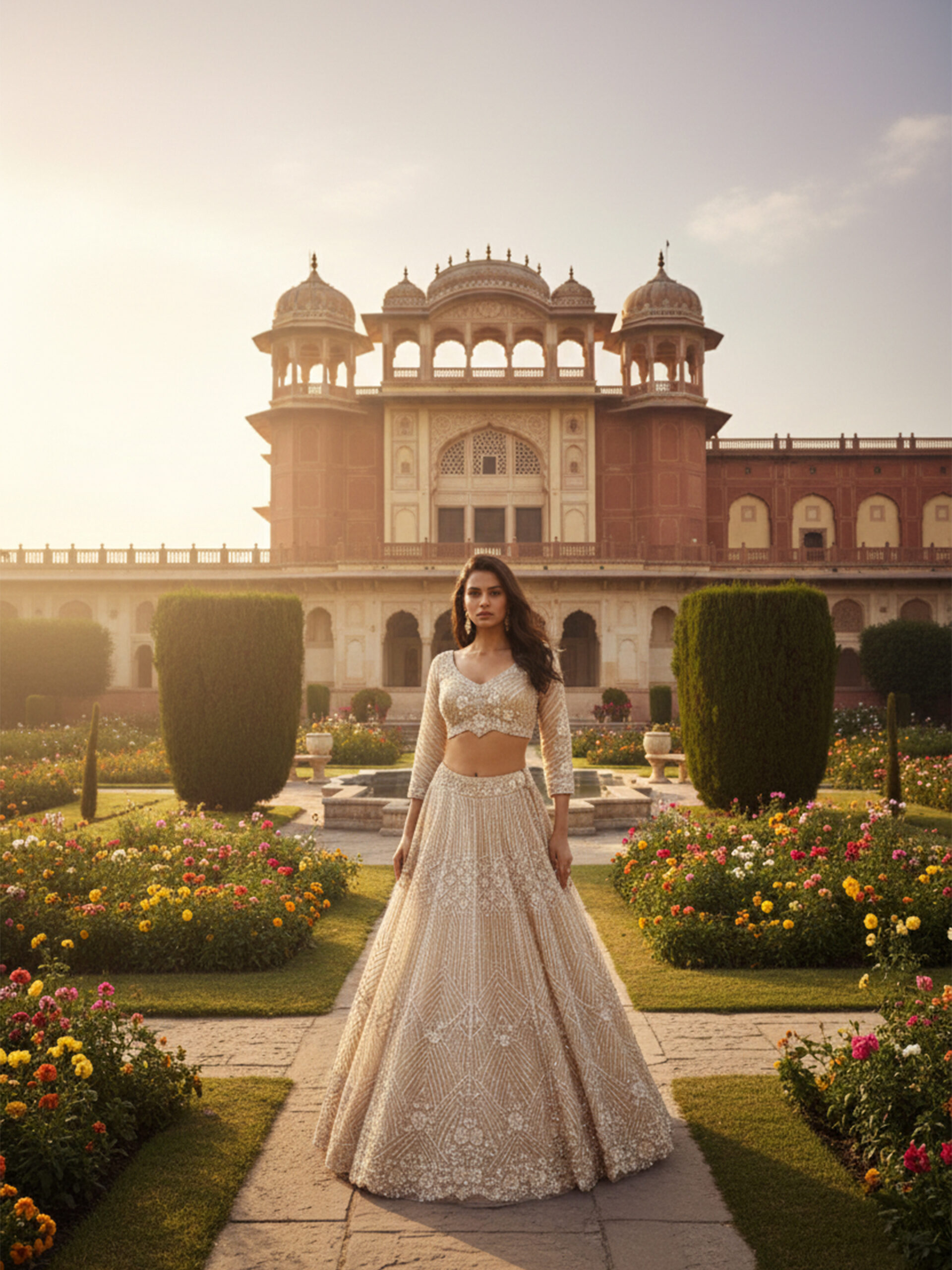 The matching blouse is meticulously embellished to enhance the lehenga’s craftsmanship, while the flowing dupatta adds elegance and balance to the ensemble. Styled against a heritage palace backdrop, this lehenga captures the essence of timeless Indian bridal fashion with a modern, refined touch.