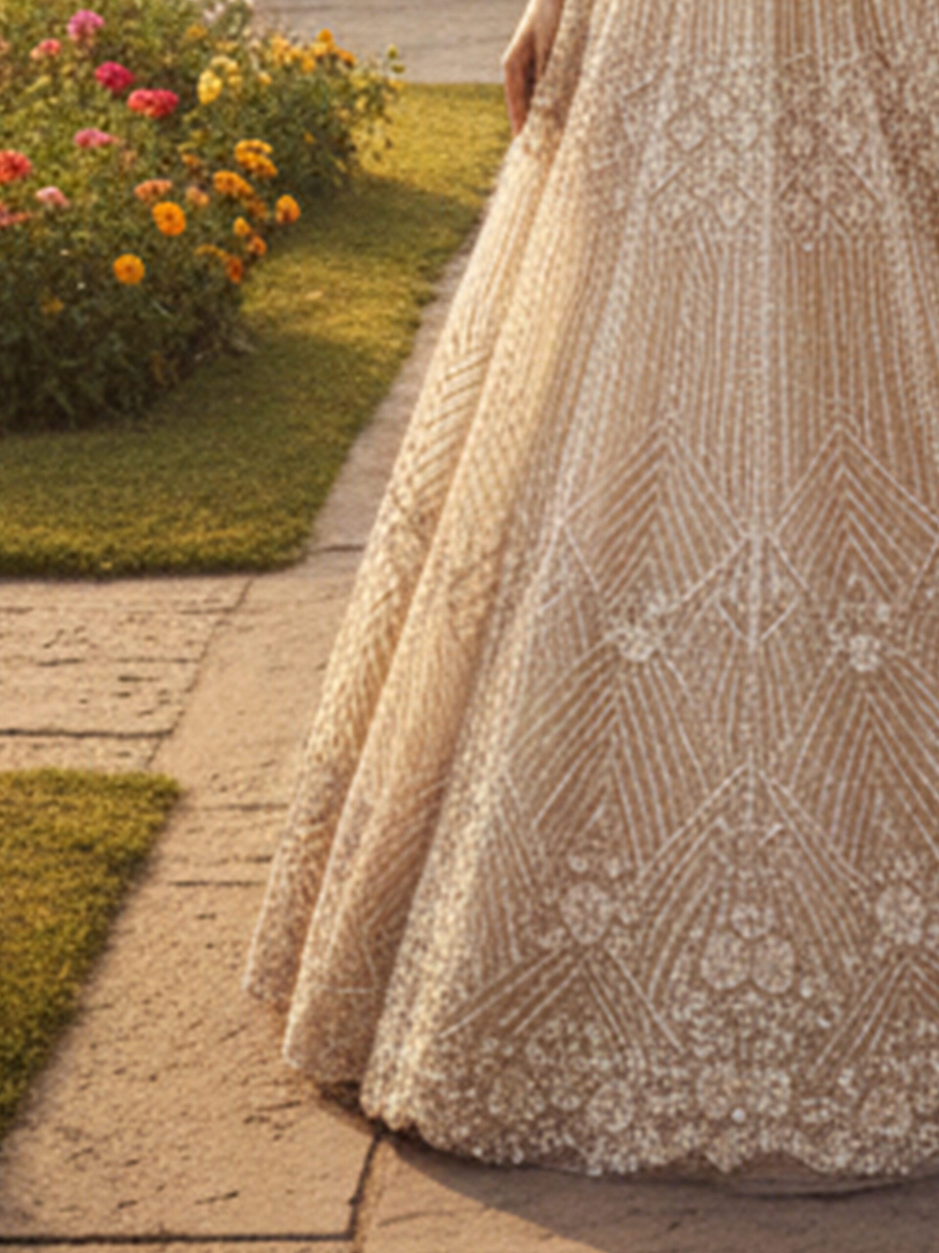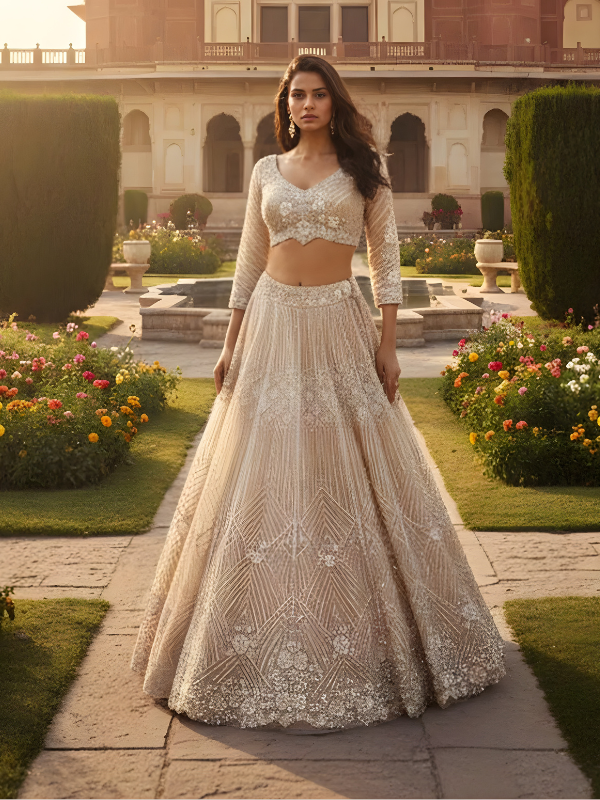 The Champagne Noor Hand-Embroidered Bridal Lehenga Set embodies understated luxury and royal sophistication. Crafted in a soft champagne hue, the lehenga features intricate hand embroidery with geometric and traditional motifs that shimmer beautifully under natural light, creating a graceful and refined silhouette.