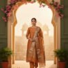 Graceful and earthy, this copper brown suit set reflects traditional charm with a luxurious touch. The warm metallic tone offers a distinctive festive appeal.