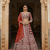 The Crimson Darbar Hand-Embroidered Bridal Lehenga Set is a tribute to classic royal bridal elegance. Crafted in a deep crimson hue, this lehenga showcases elaborate hand embroidery with traditional architectural and floral motifs, highlighted by finely detailed borders that create a grand, regal silhouette.