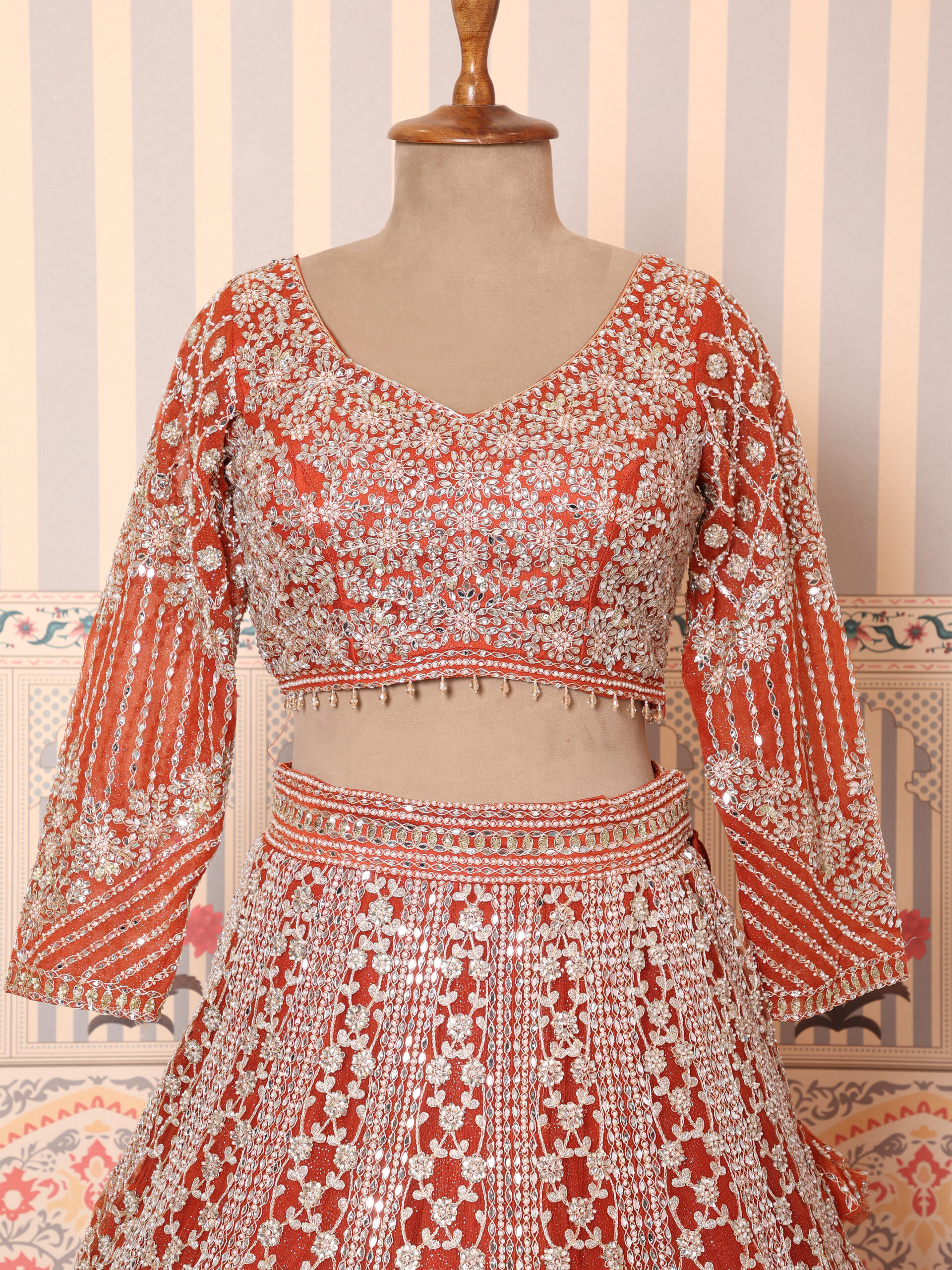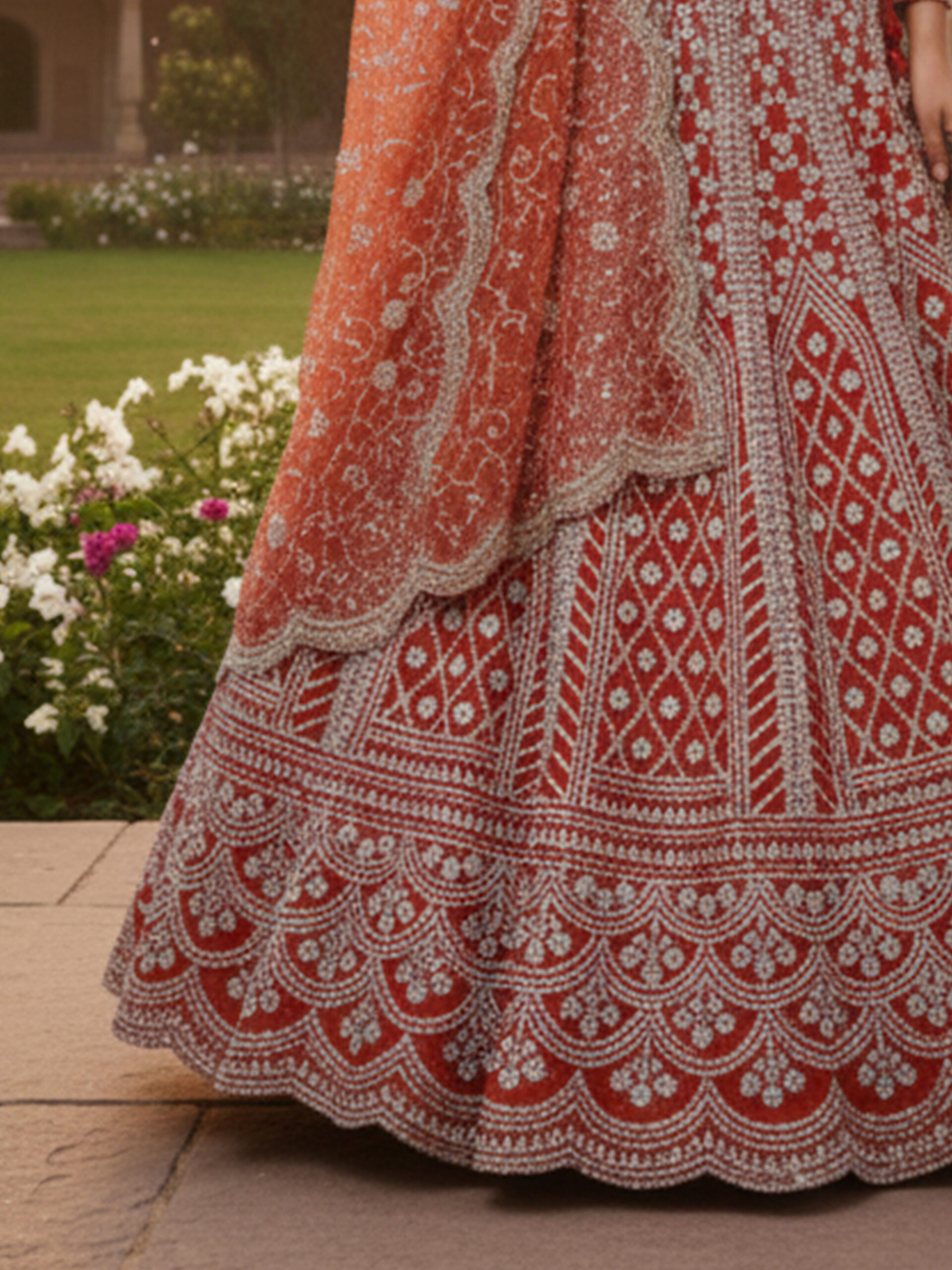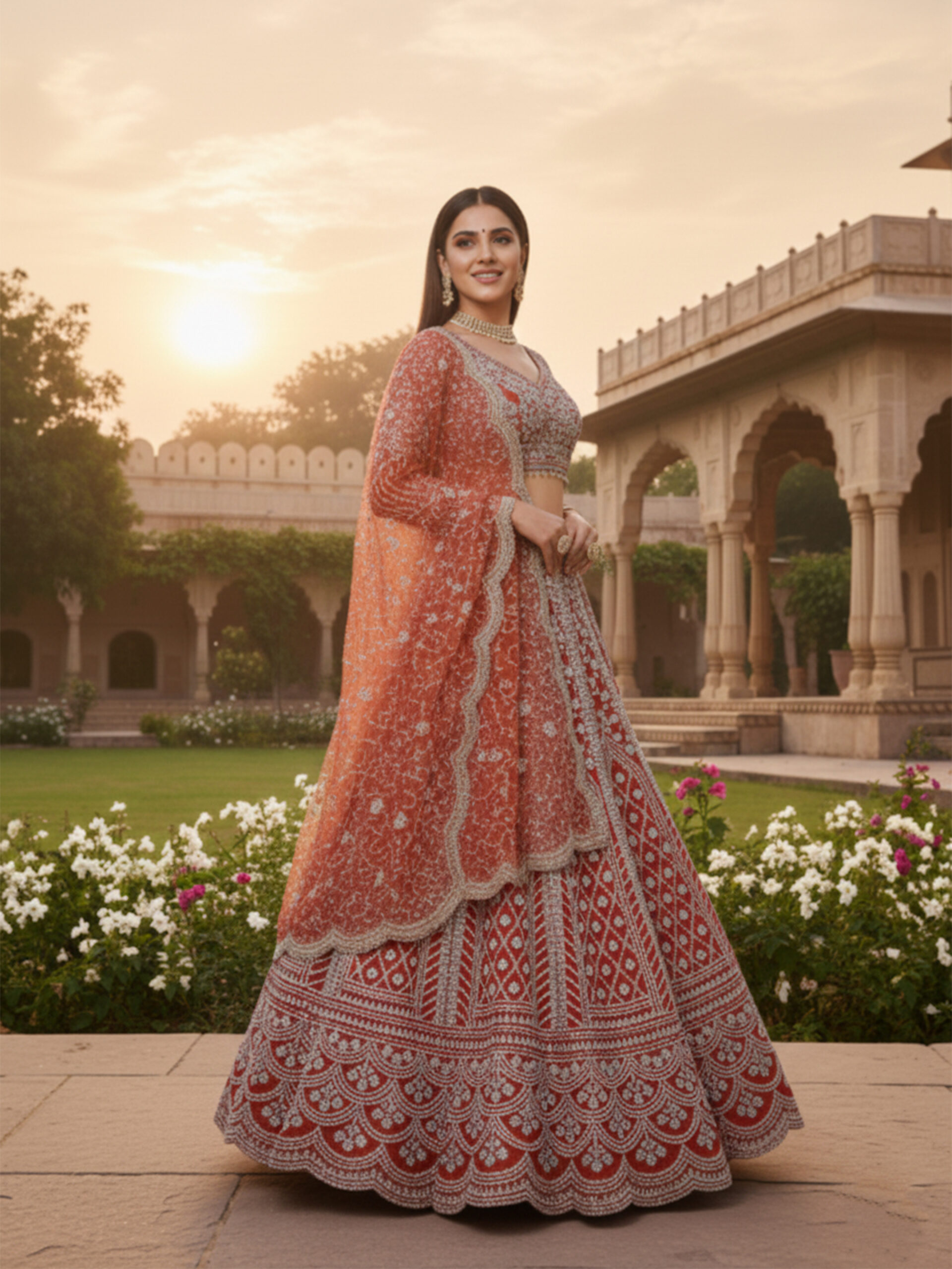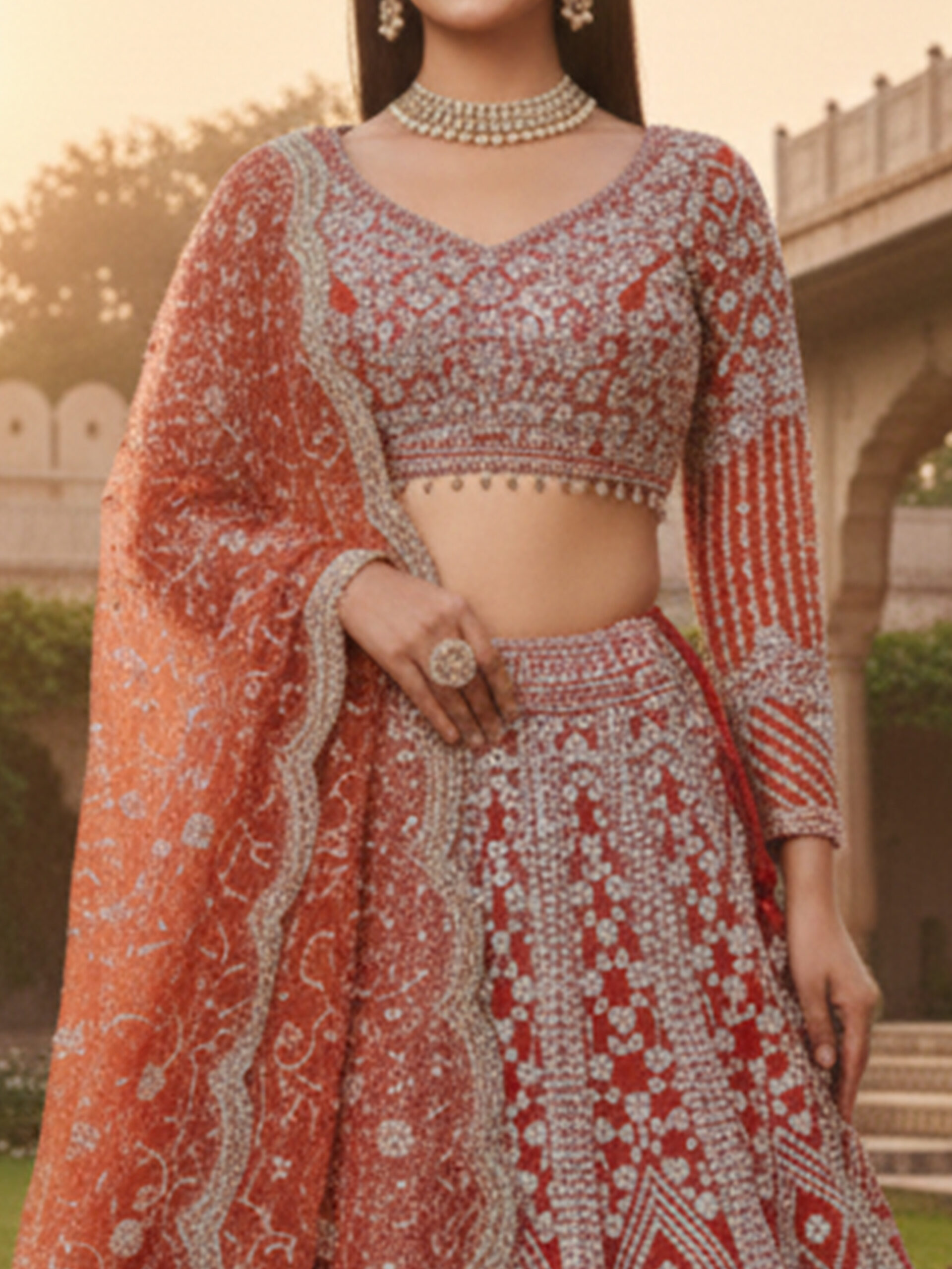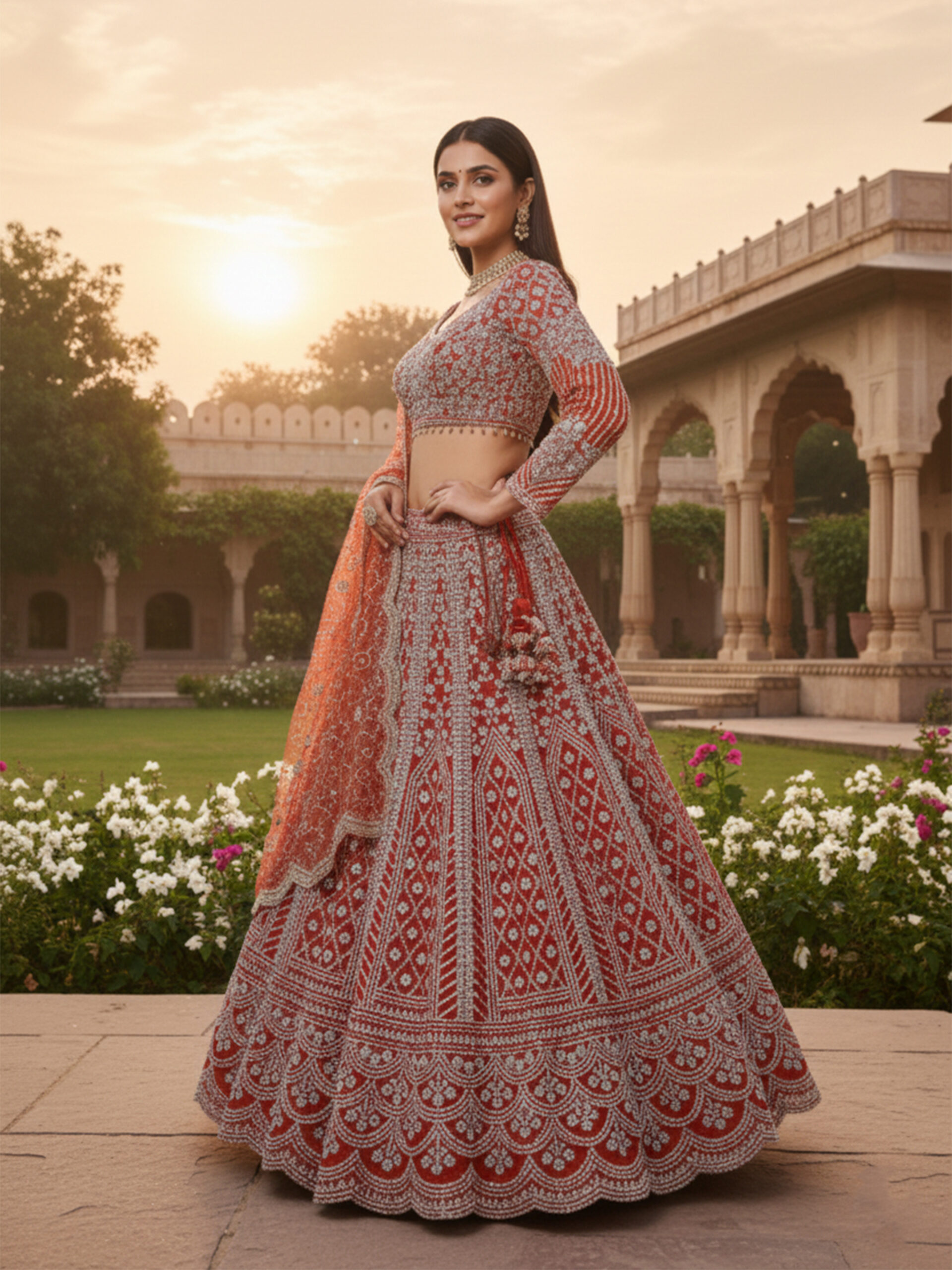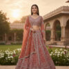 The matching blouse is intricately embellished to complement the richness of the lehenga, while the embroidered dupatta adds grace and balance to the overall look. Styled against a heritage courtyard backdrop, this ensemble reflects timeless craftsmanship and regal charm.
