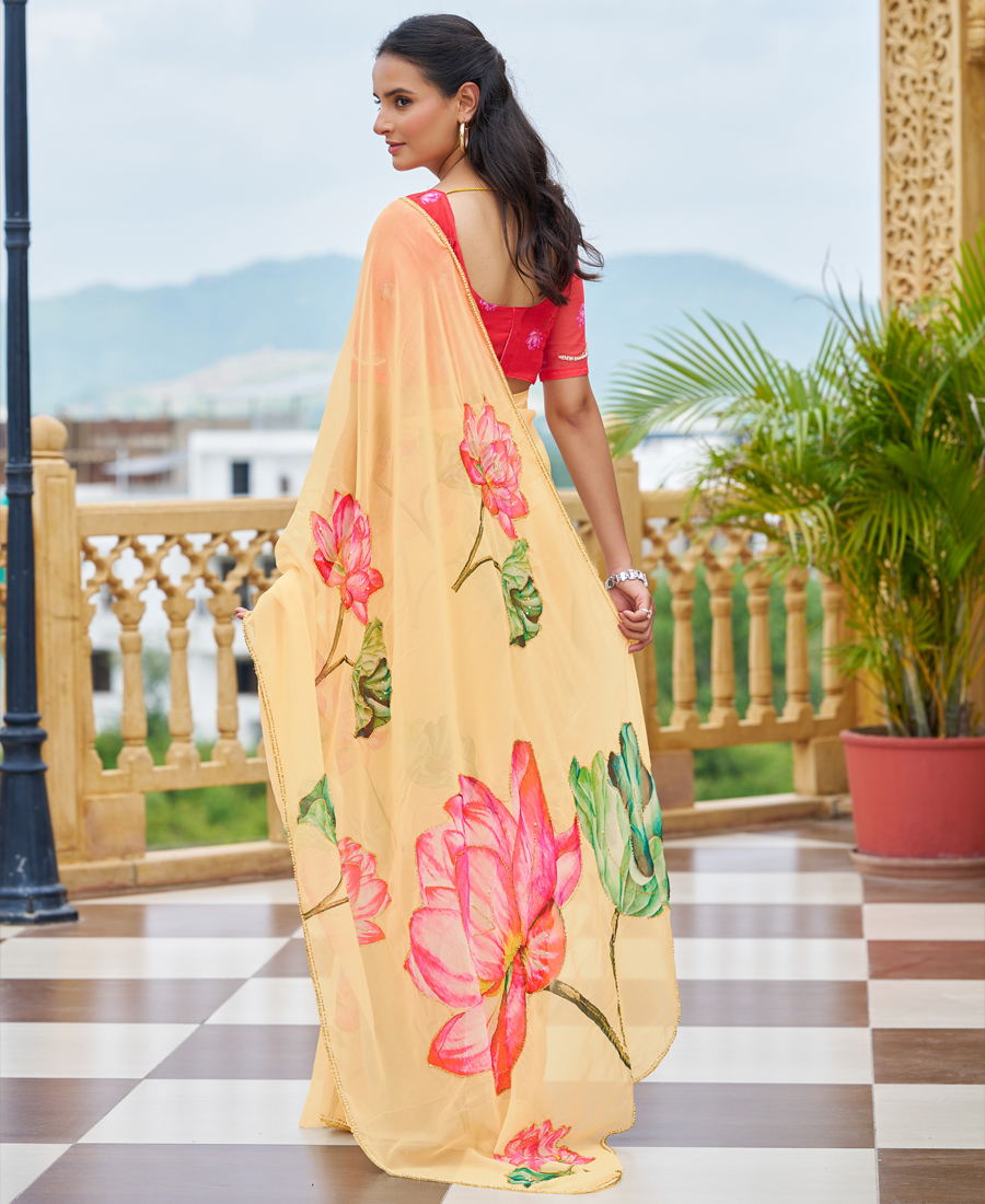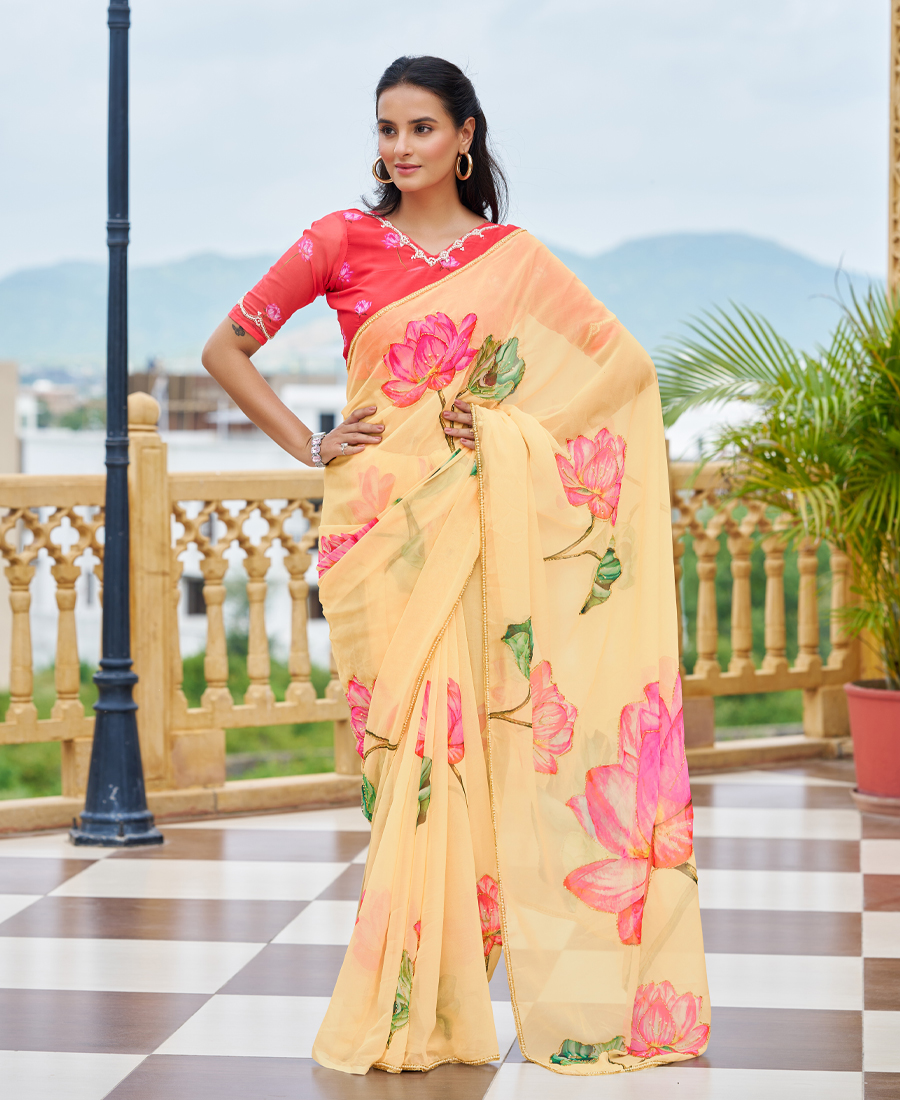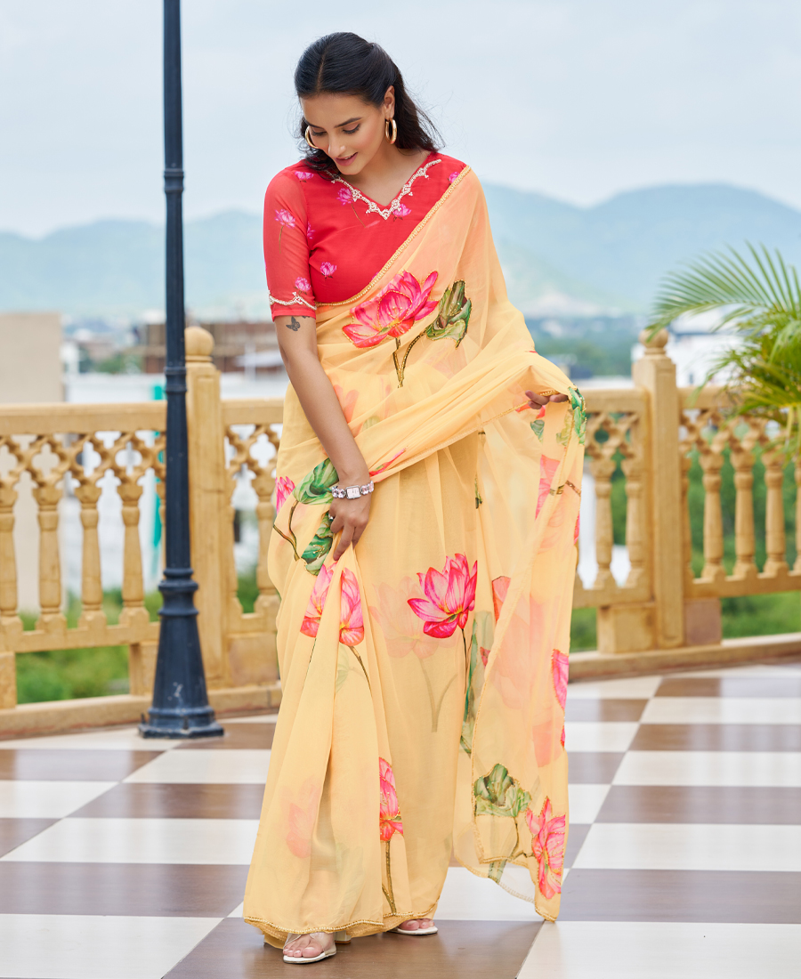 Designer Light Yellow Floral Printed Saree For Women Tabby Silk