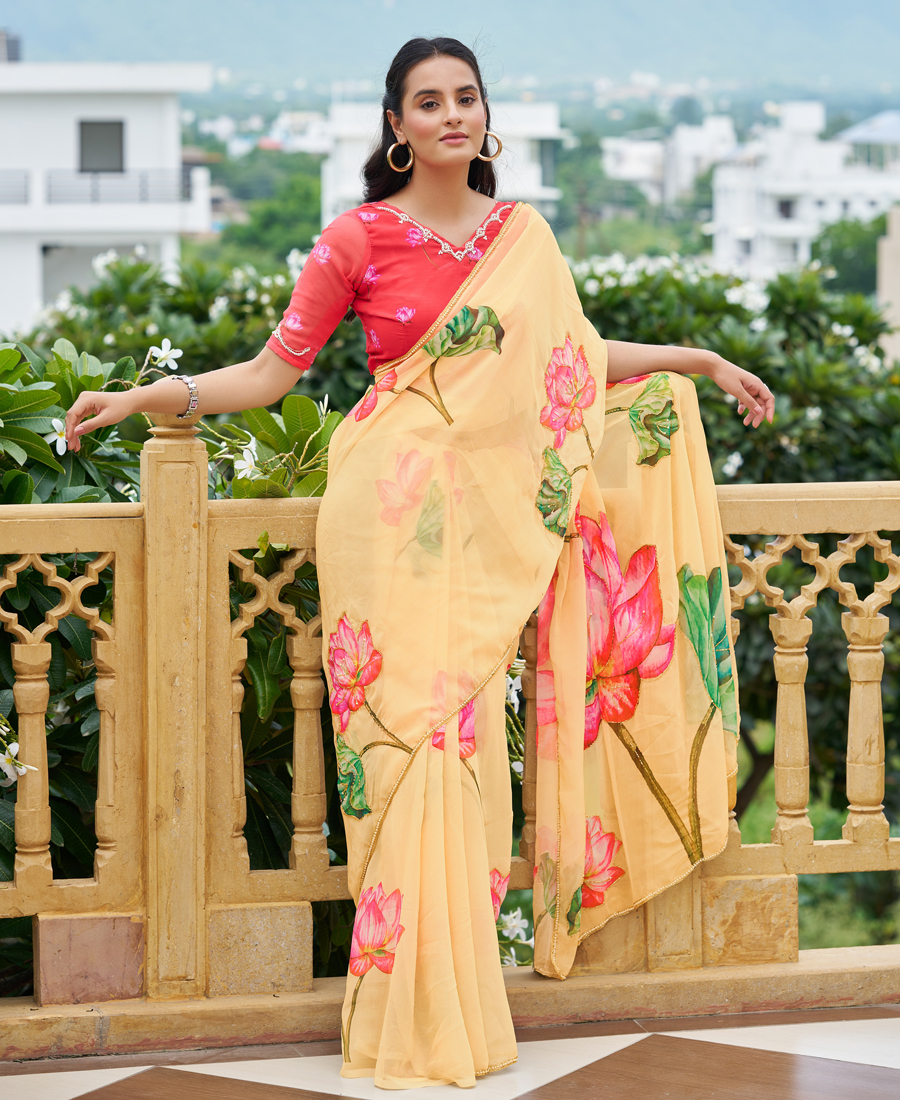 Be the first to review “Designer Light Yellow Floral Printed Saree For Women Tabby Silk”