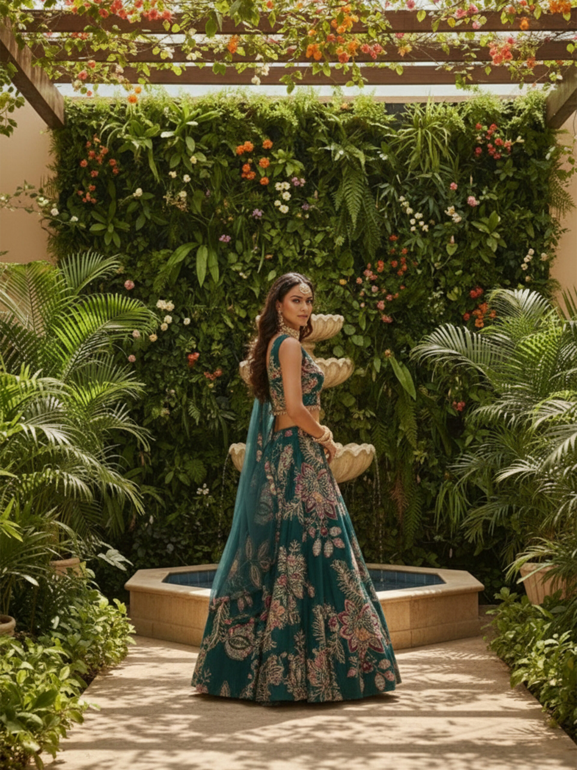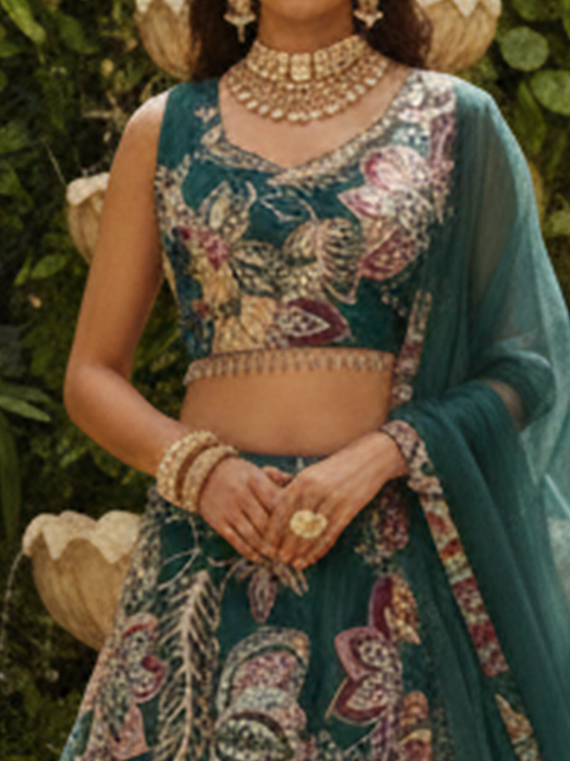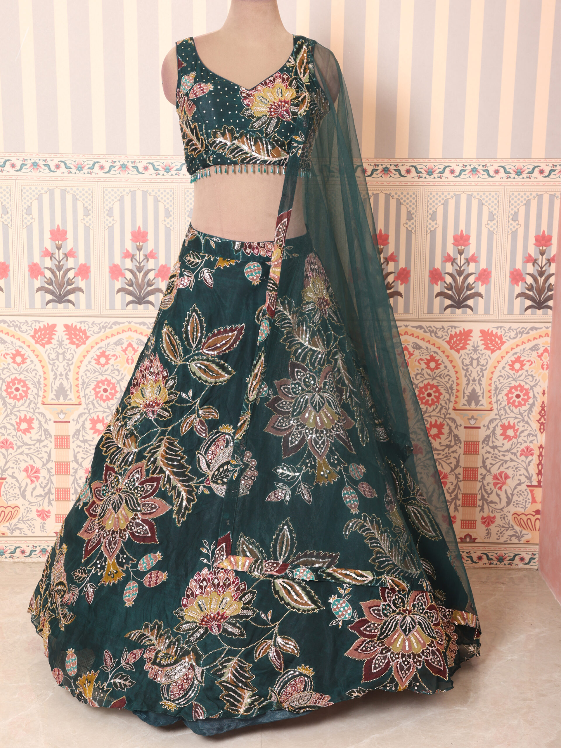 Emerald Garden Floral Embroidered Lehenga Set with Sheer Dupatta