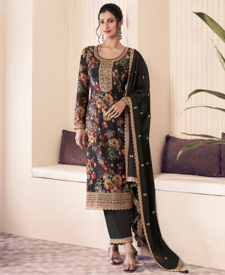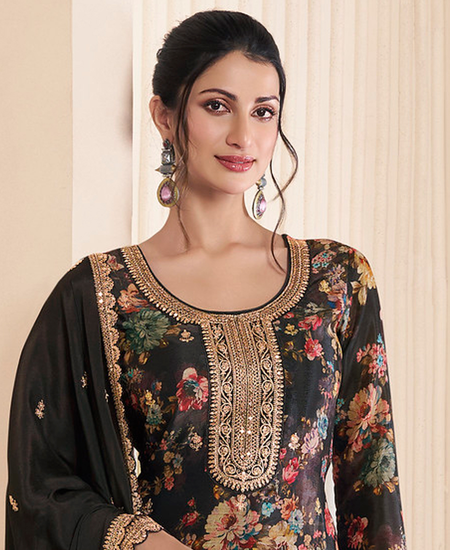 Be the first to review “Floral Printed Black Long Suit For Women Chinon Fabric”