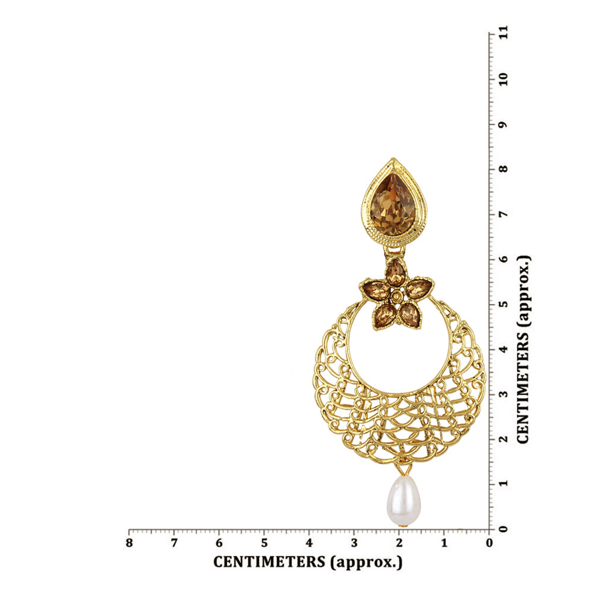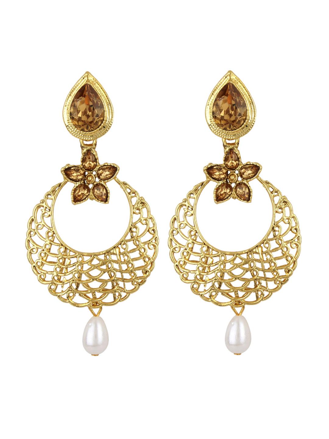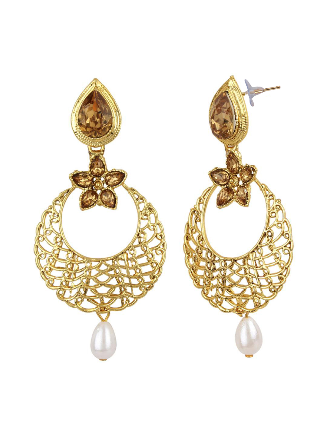 Gold stones studded Gold plated Enamelled chandbaali earring with pearl drops, secured with post and back closure
