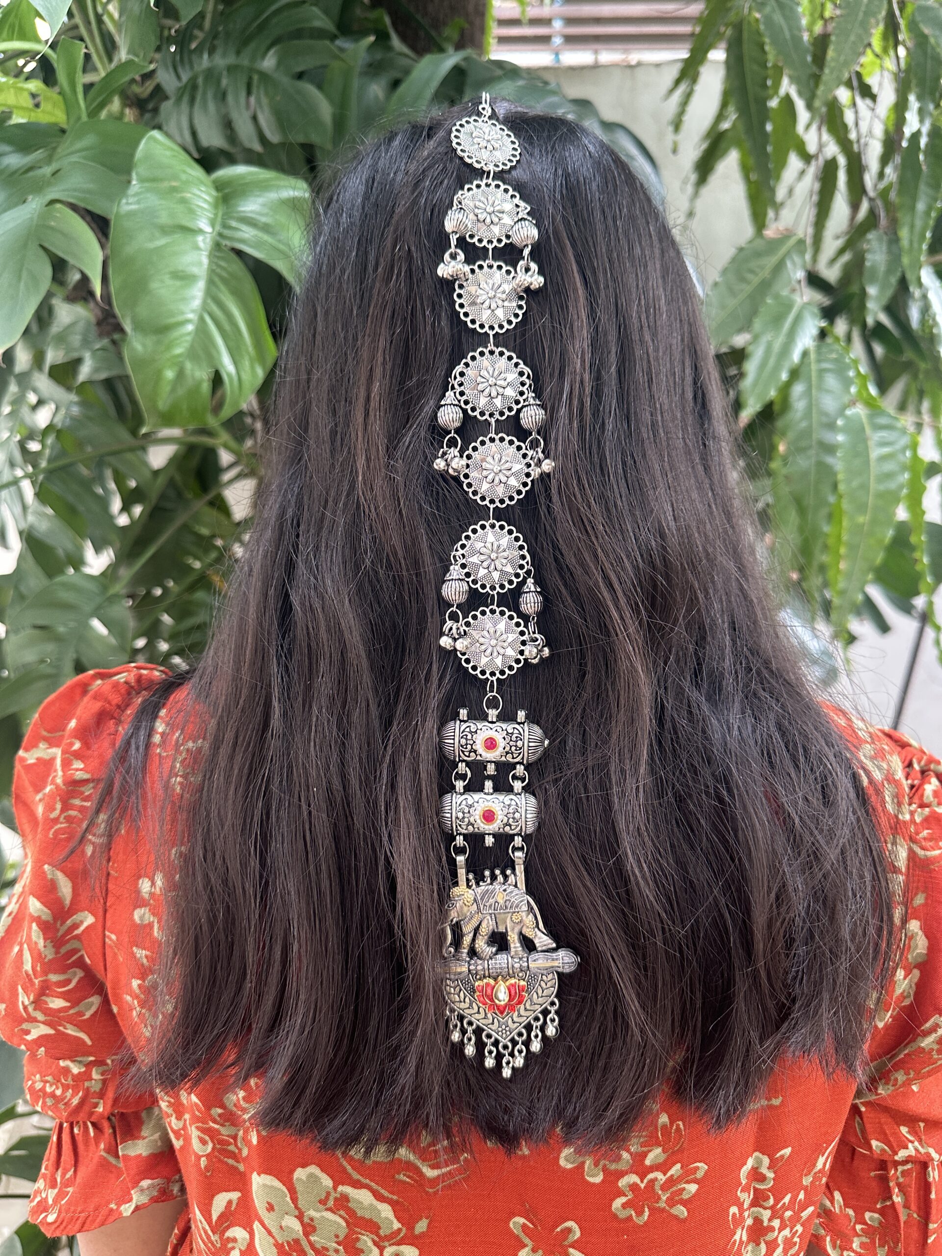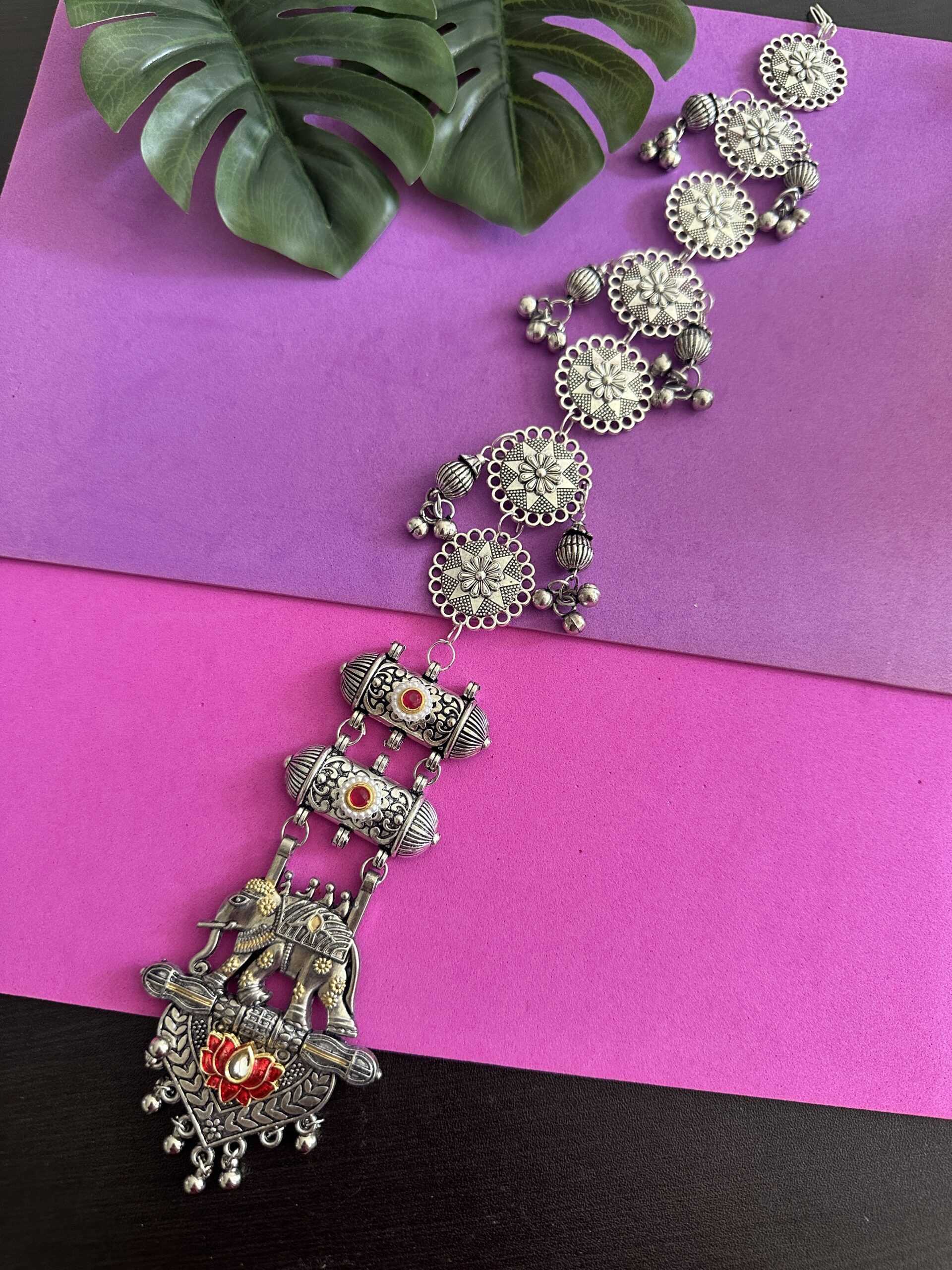 Add a touch of tribal elegance to your look with our Afghani hair accessory featuring a stunning elephant pendant. Inspired by traditional Afghan craftsmanship, this statement piece is designed for the free-spirited soul who loves to blend culture with style.Handcrafted with antique silver-toned metal and intricate motifs, this hair accessory adds drama and depth to braids, buns, or open hair. The elephant charm symbolizes strength, grace, and good luck – making it a meaningful piece for every occasion.Whether you’re dressing up for a festive function, a mehendi ceremony, or a boho-themed shoot, this accessory is sure to turn heads.