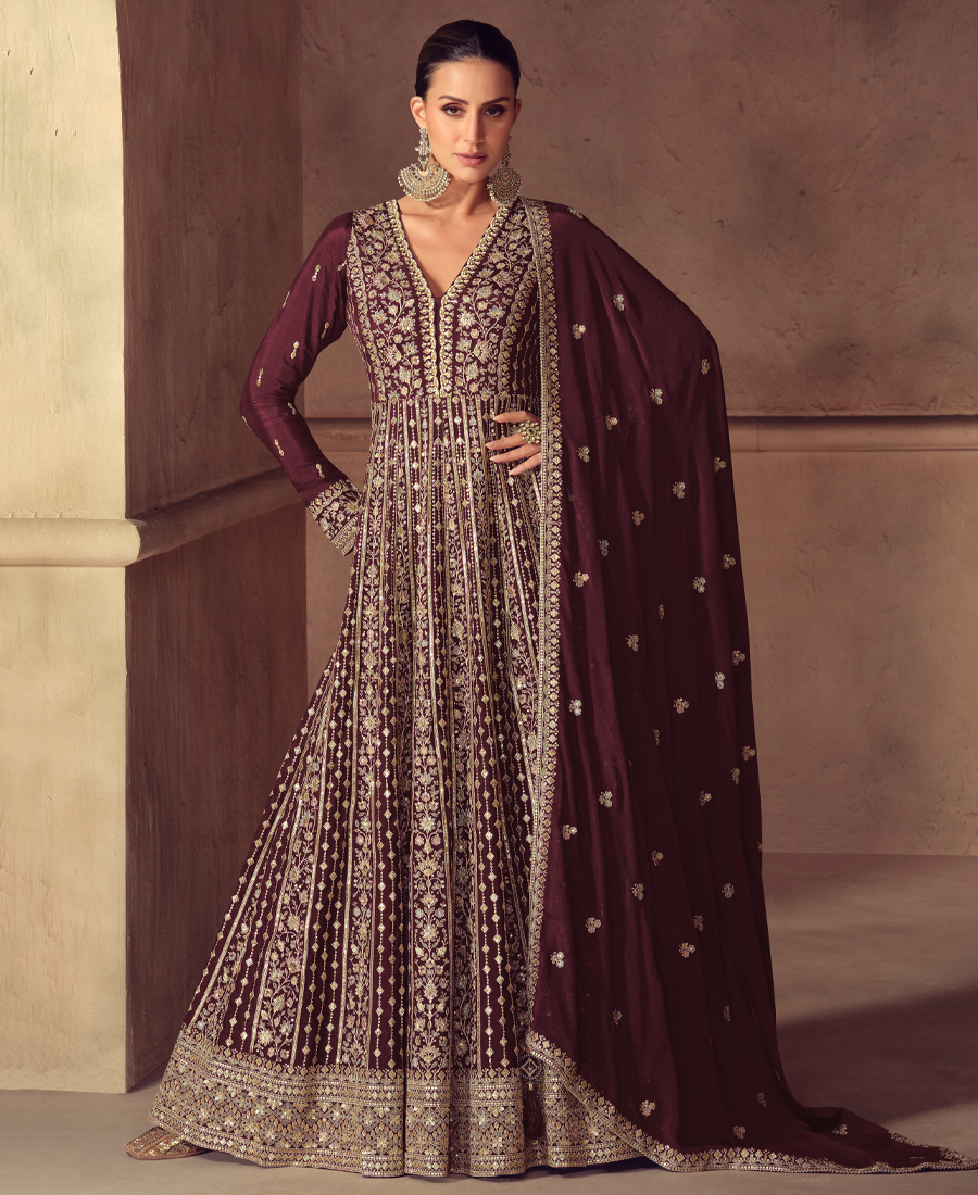 Heavy Chinon Dark Brown Anarkali For Women Wedding Wear