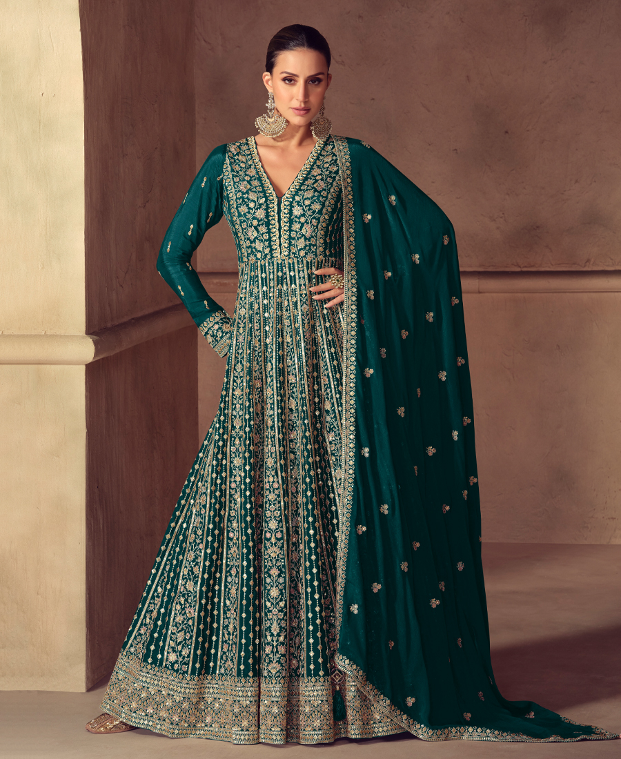Heavy Chinon Teal Blue Anarkali For Women Wedding Wear