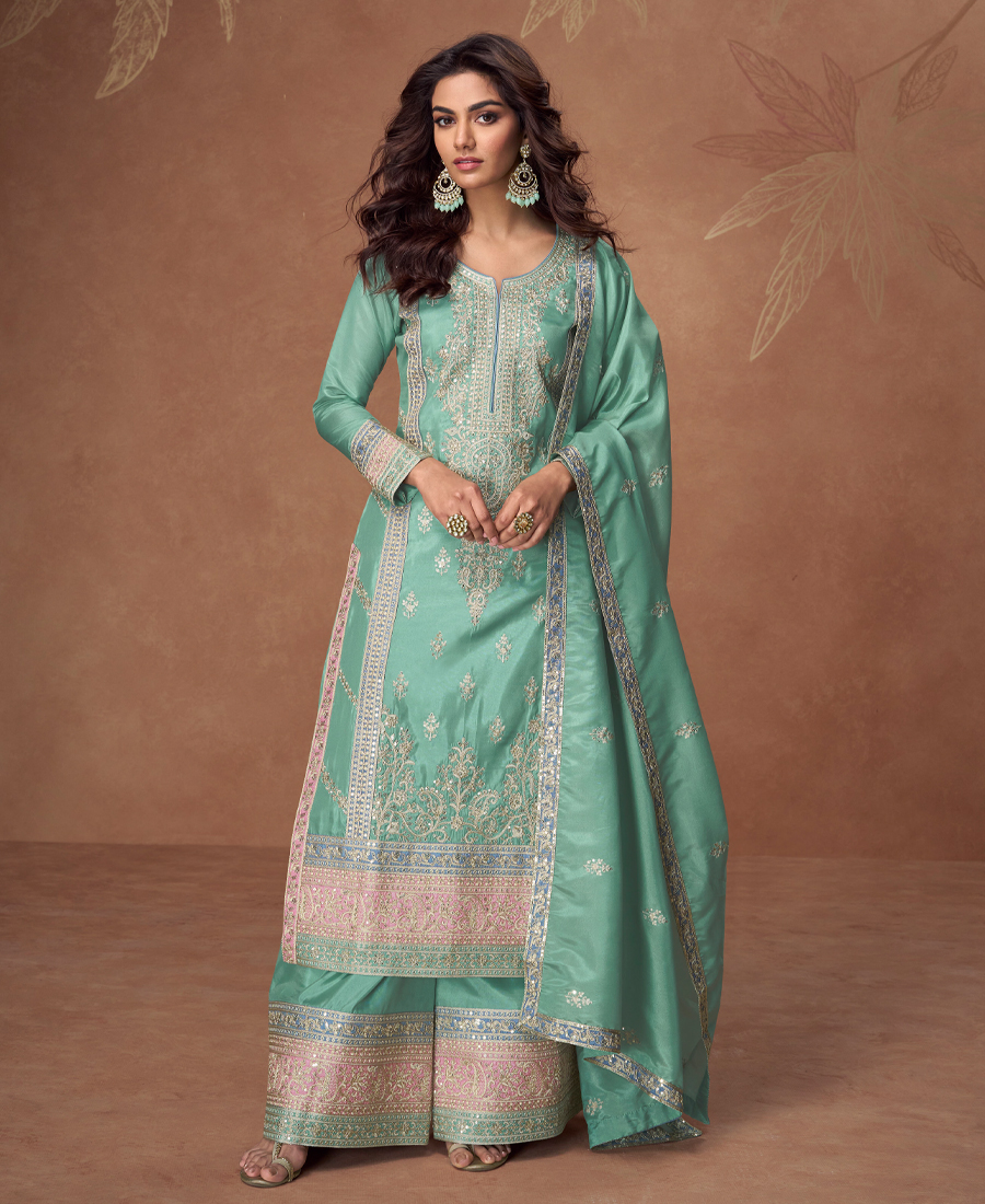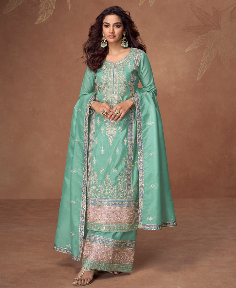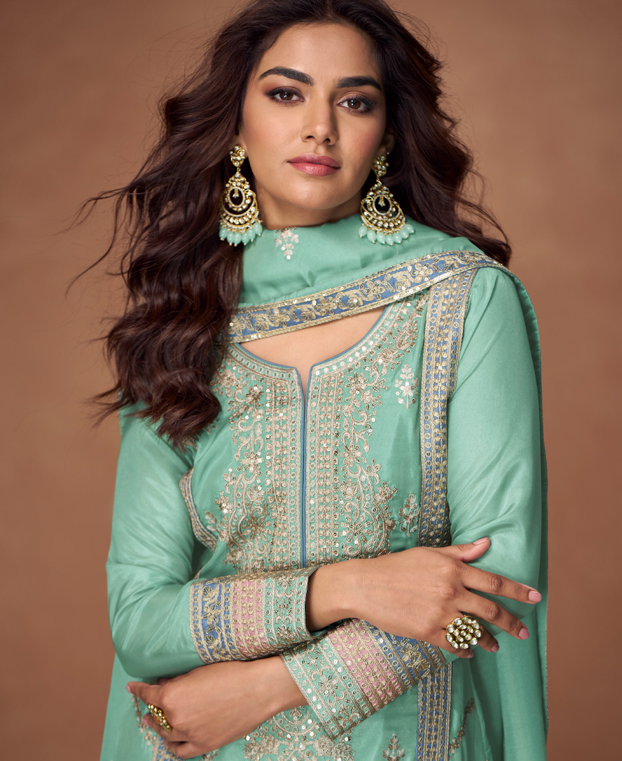 Heavy Embroidery Worked Pista Green Long Salwar Suit Set For Women Wedding Wear