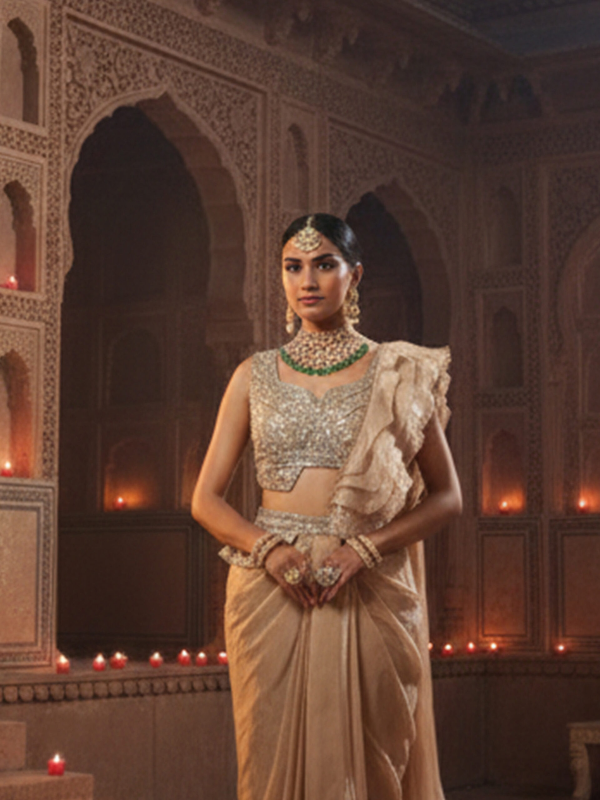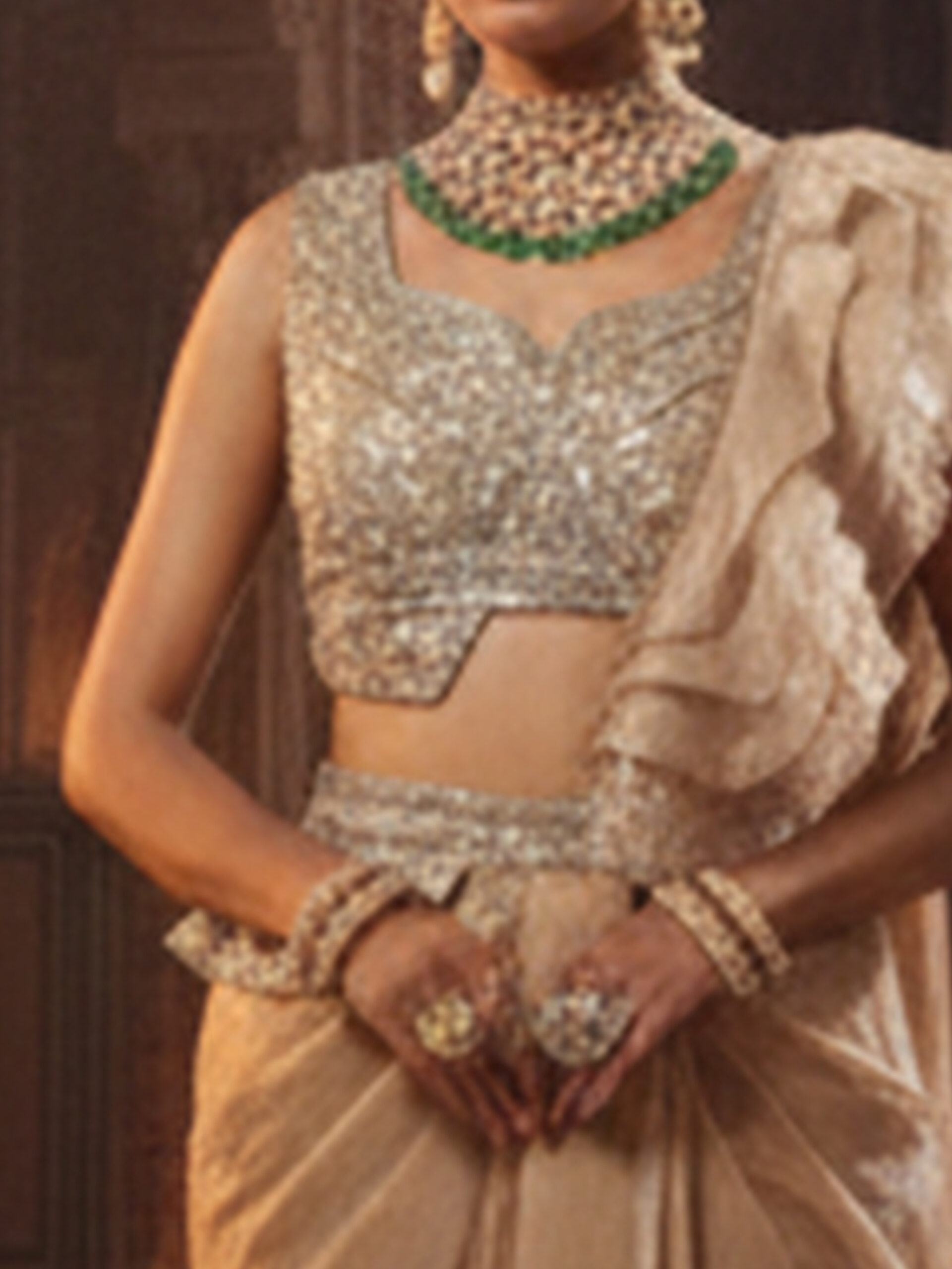 Elevate your festive wardrobe with this Ivory Gold Embellished Draped Saree, designed to embody regal elegance and modern sophistication. Crafted in a ready-to-wear draped silhouette, this saree features a soft, graceful fall paired with a richly embellished blouse, making it an exquisite choice for weddings and grand evening occasions.