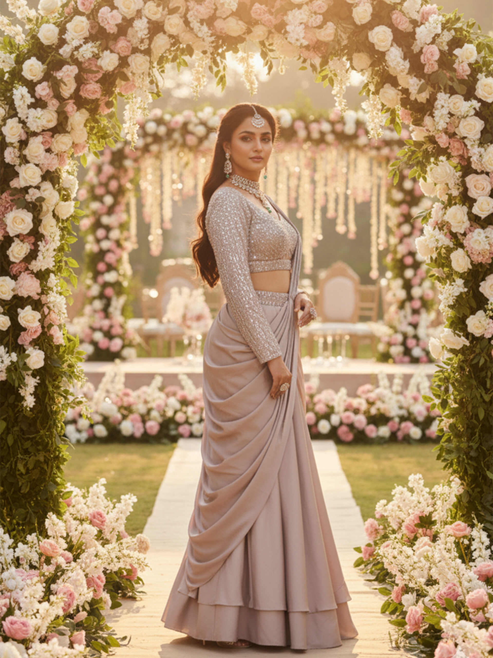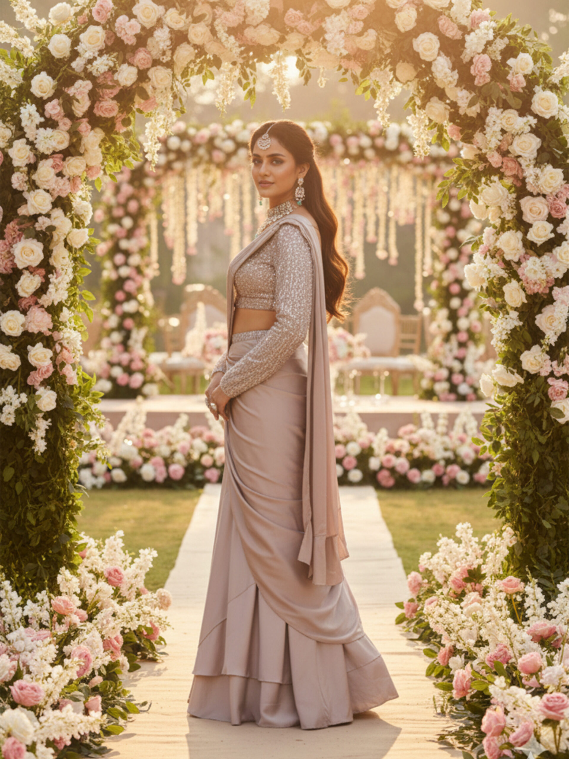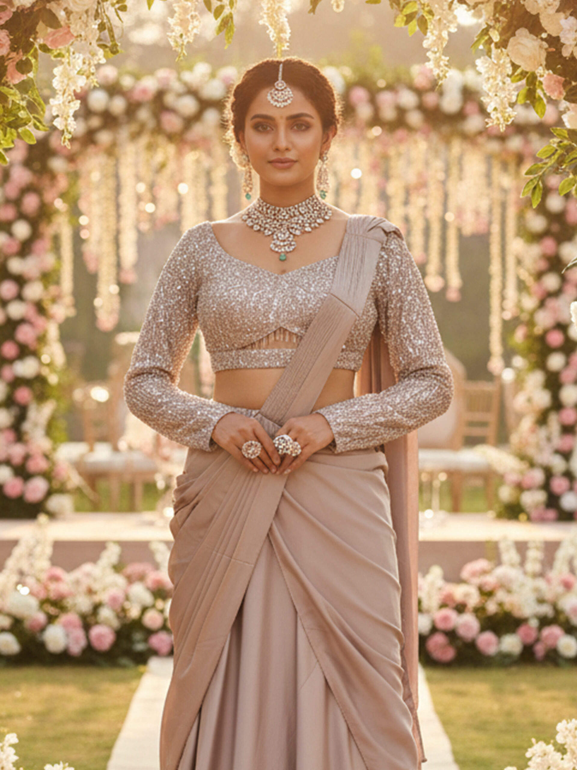 Pair this saree with diamond or polki jewelry, a sleek bun or soft low ponytail, and metallic heels for an ultra-luxurious bridal look.