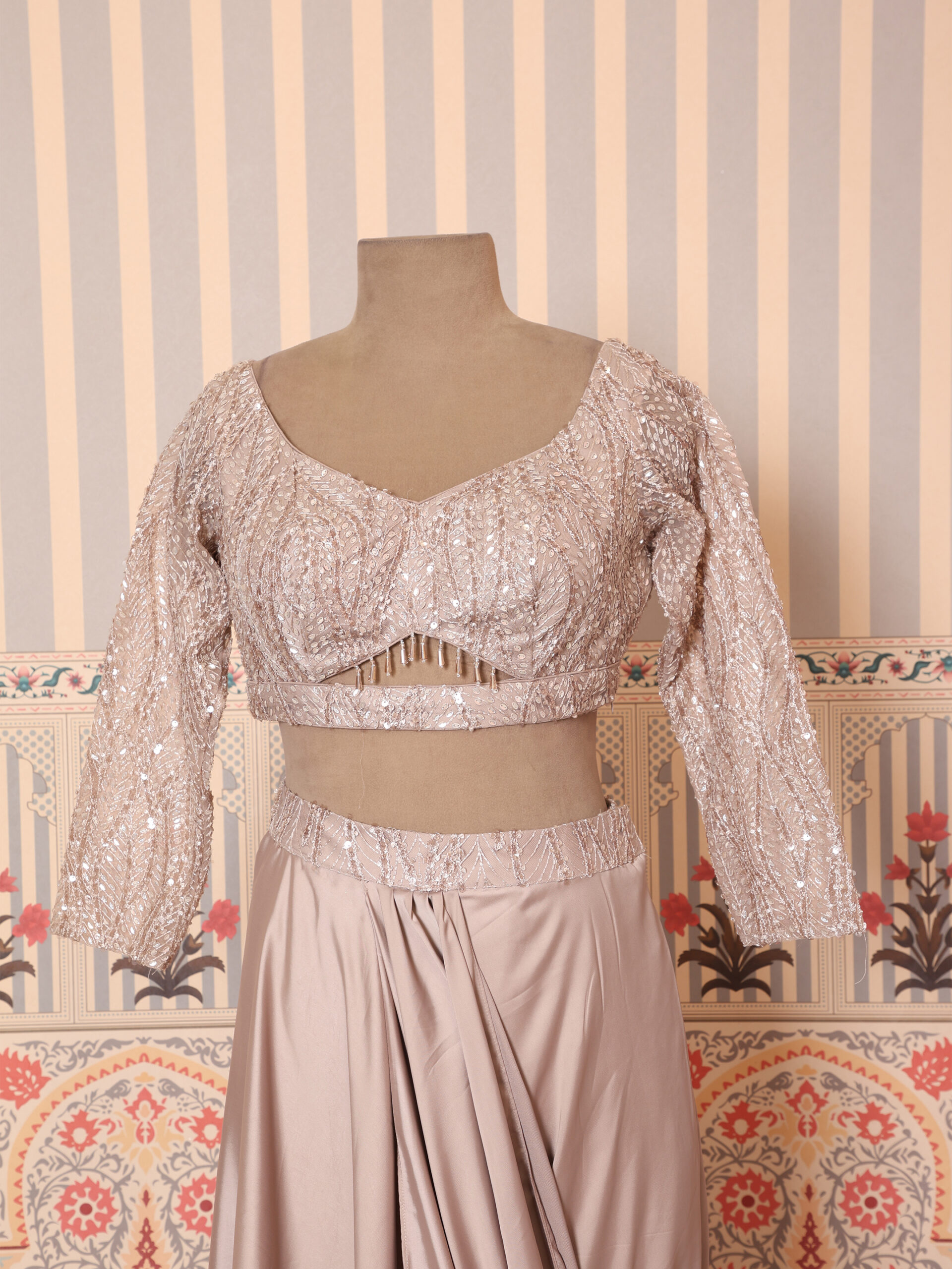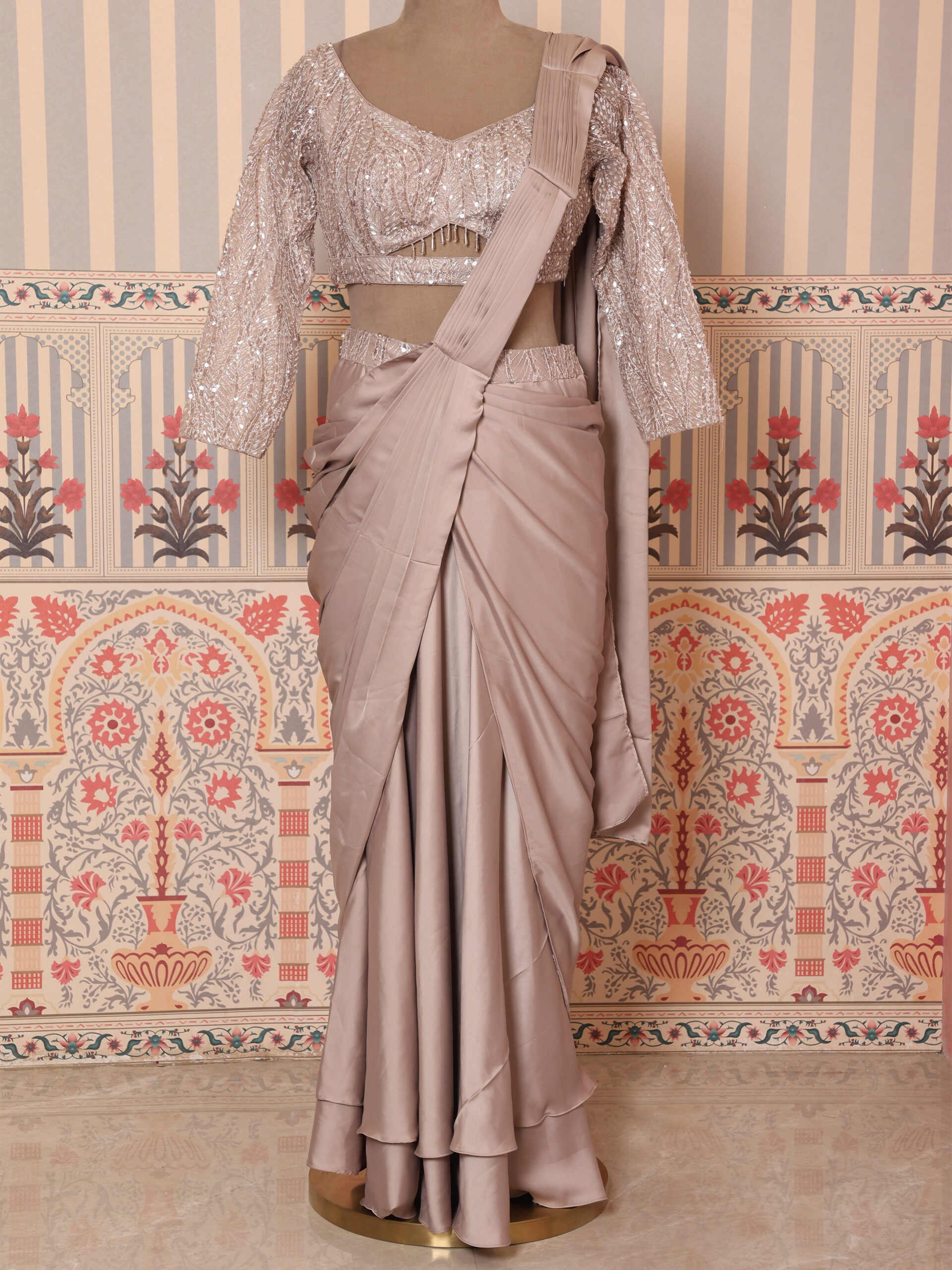 Design Highlight: Pre-stitched drape paired with a glamorous full-sleeve blouse
