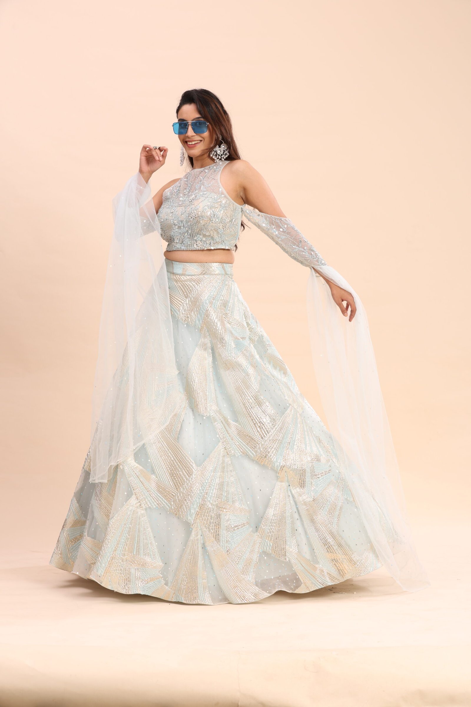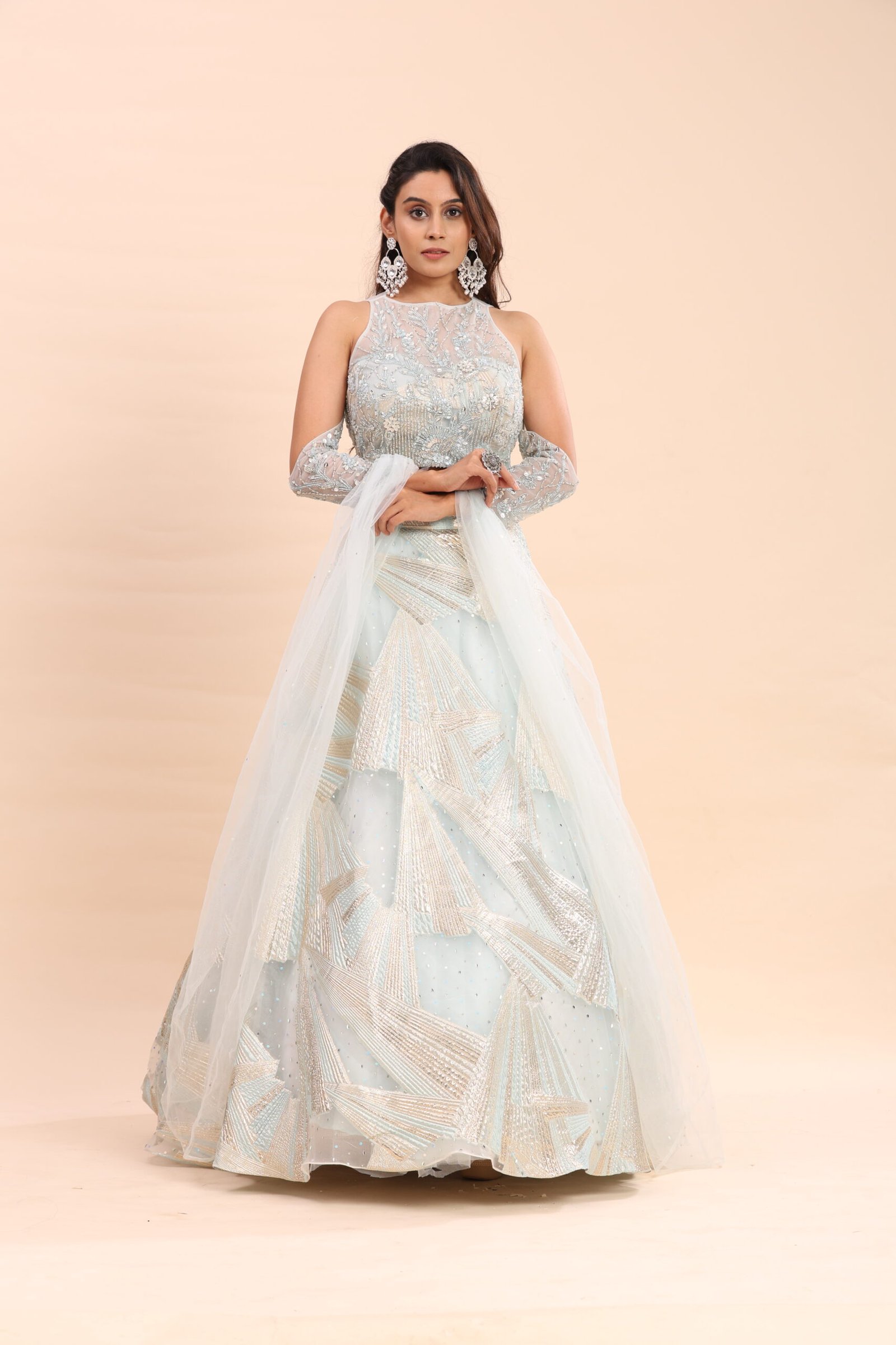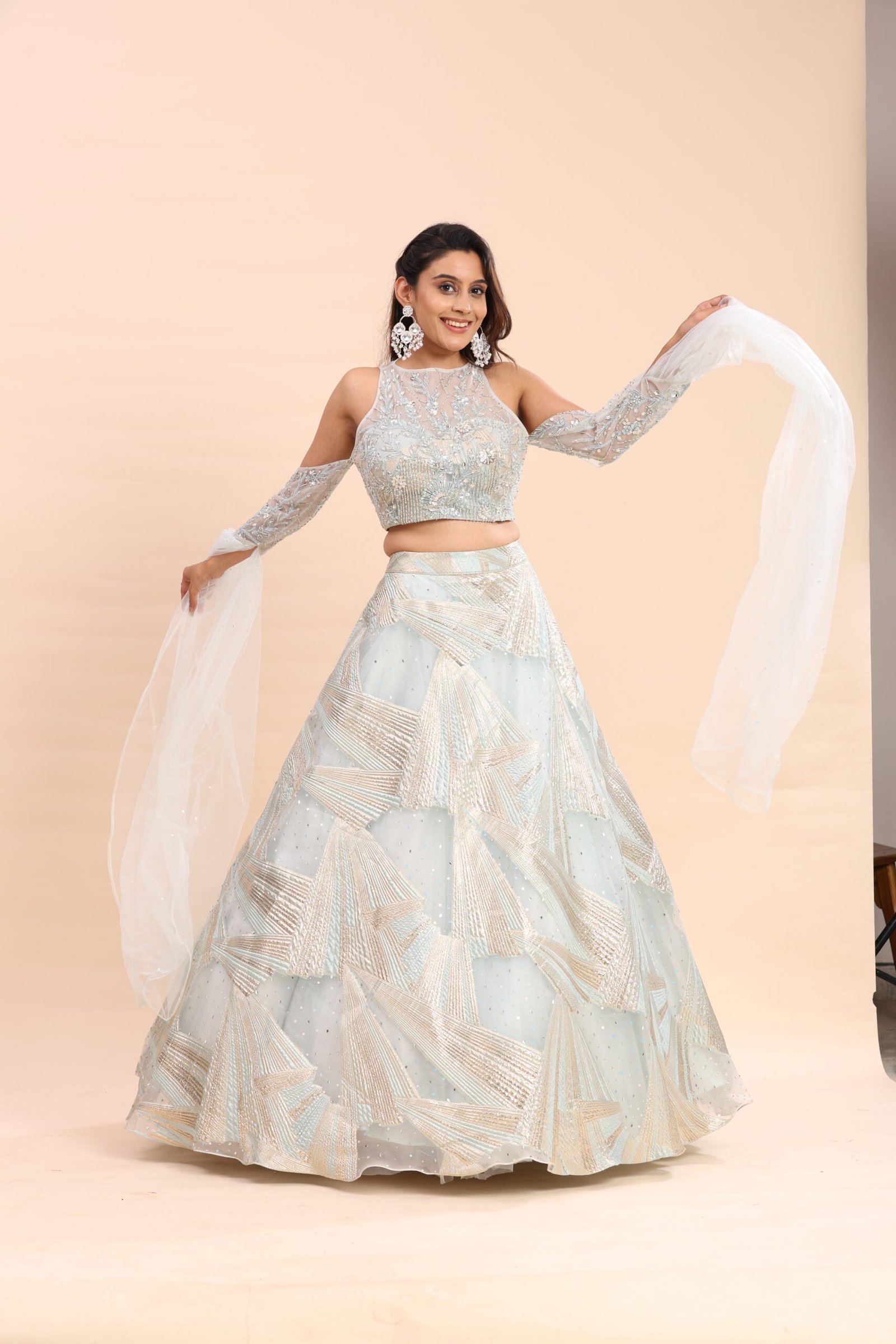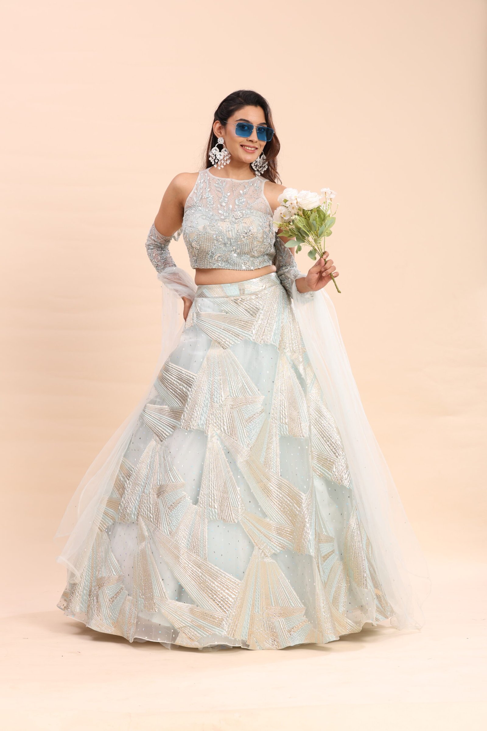 Radiate ethereal charm in our Silver Frost Bridal Ensemble, a modern fairytale brought to life in shimmering hues of icy blue and silver. Designed for the contemporary bride who adores understated luxury, this lehenga captures the magic of frost-kissed mornings and celestial sparkle.