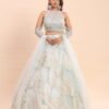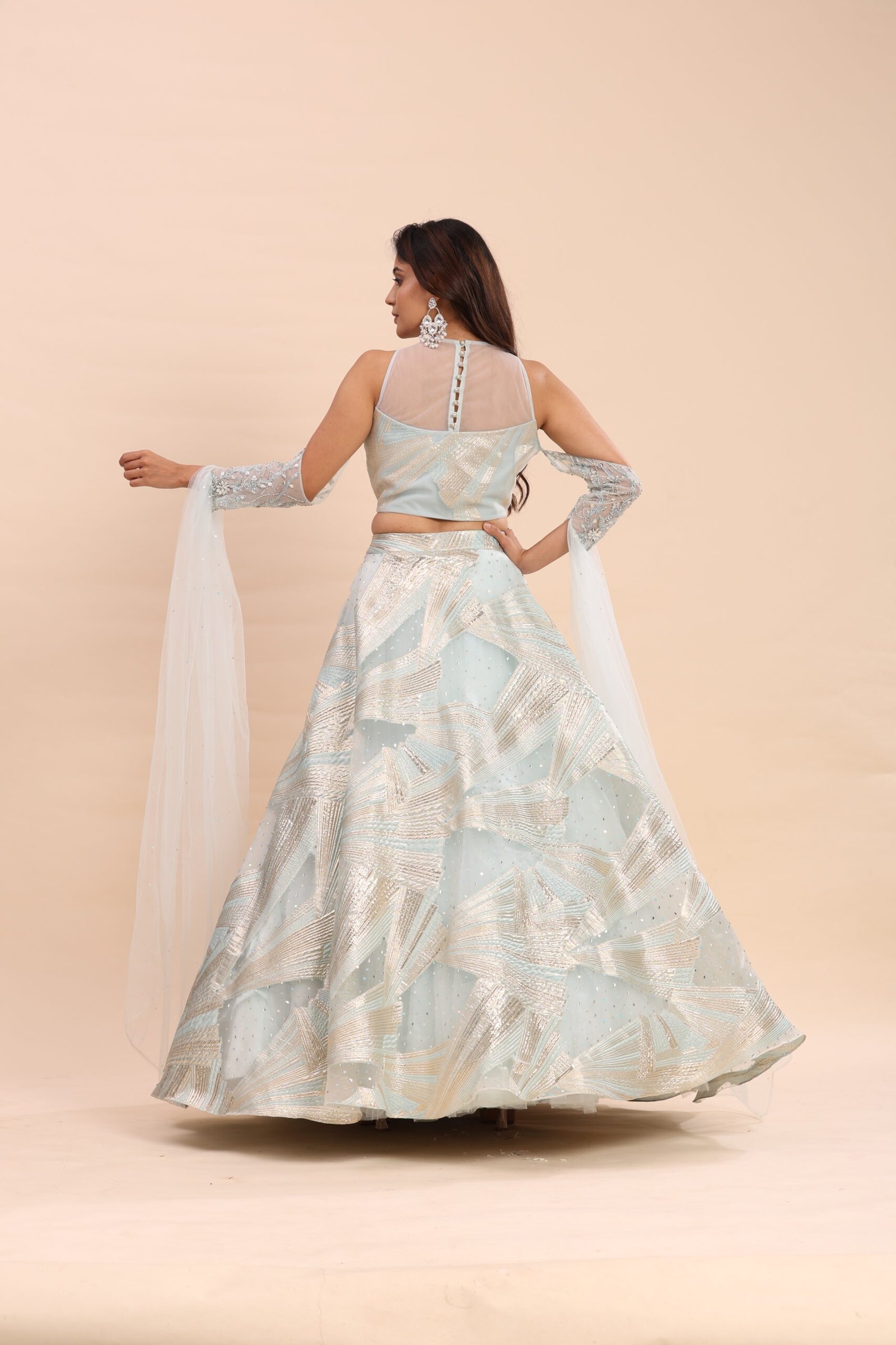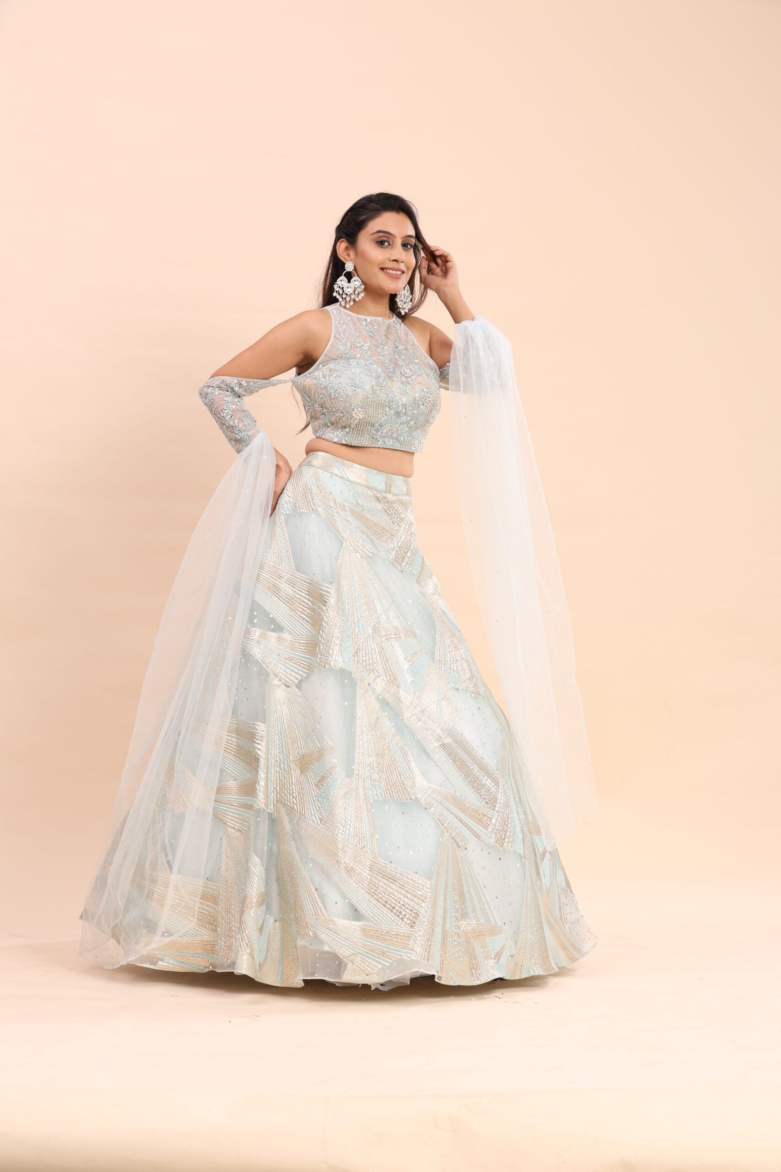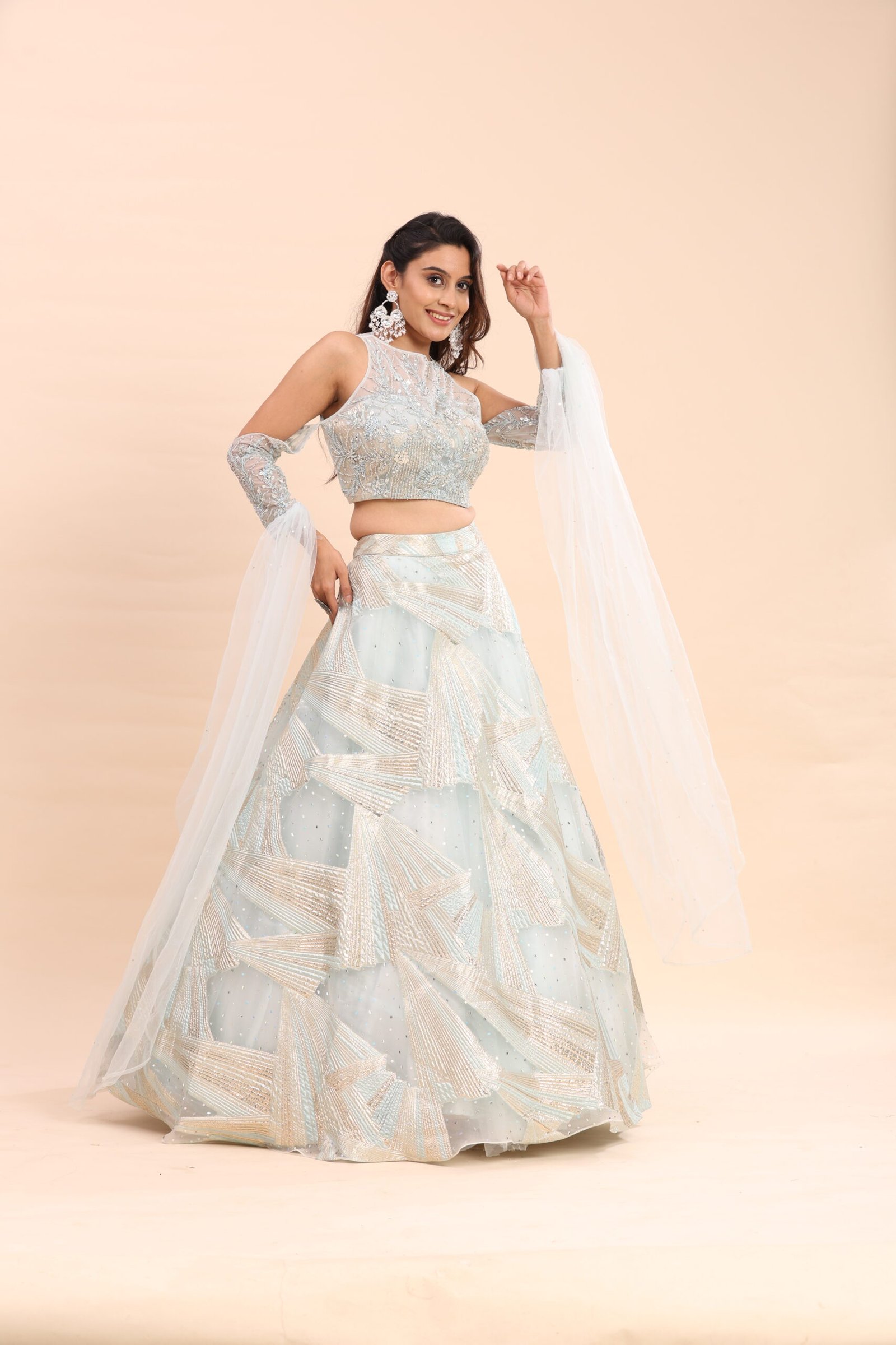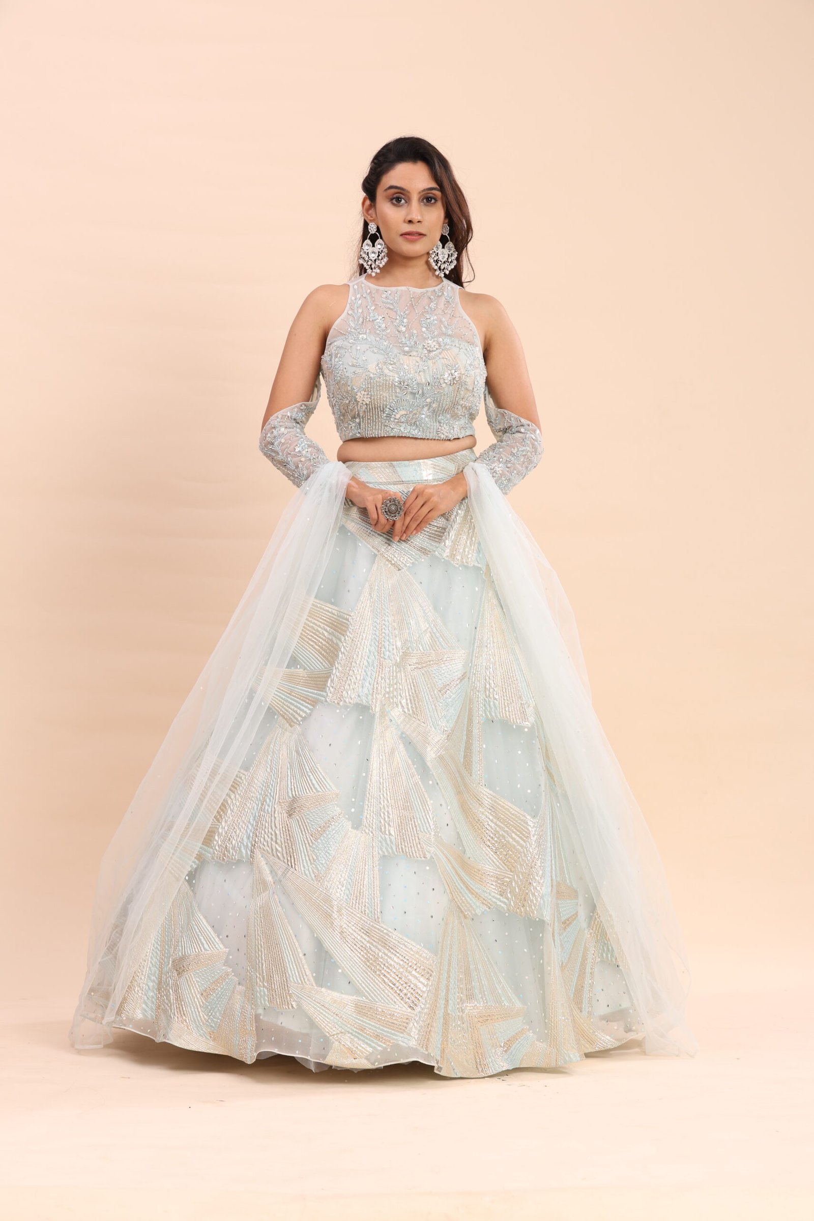 Radiate ethereal charm in our Silver Frost Bridal Ensemble, a modern fairytale brought to life in shimmering hues of icy blue and silver. Designed for the contemporary bride who adores understated luxury, this lehenga captures the magic of frost-kissed mornings and celestial sparkle.