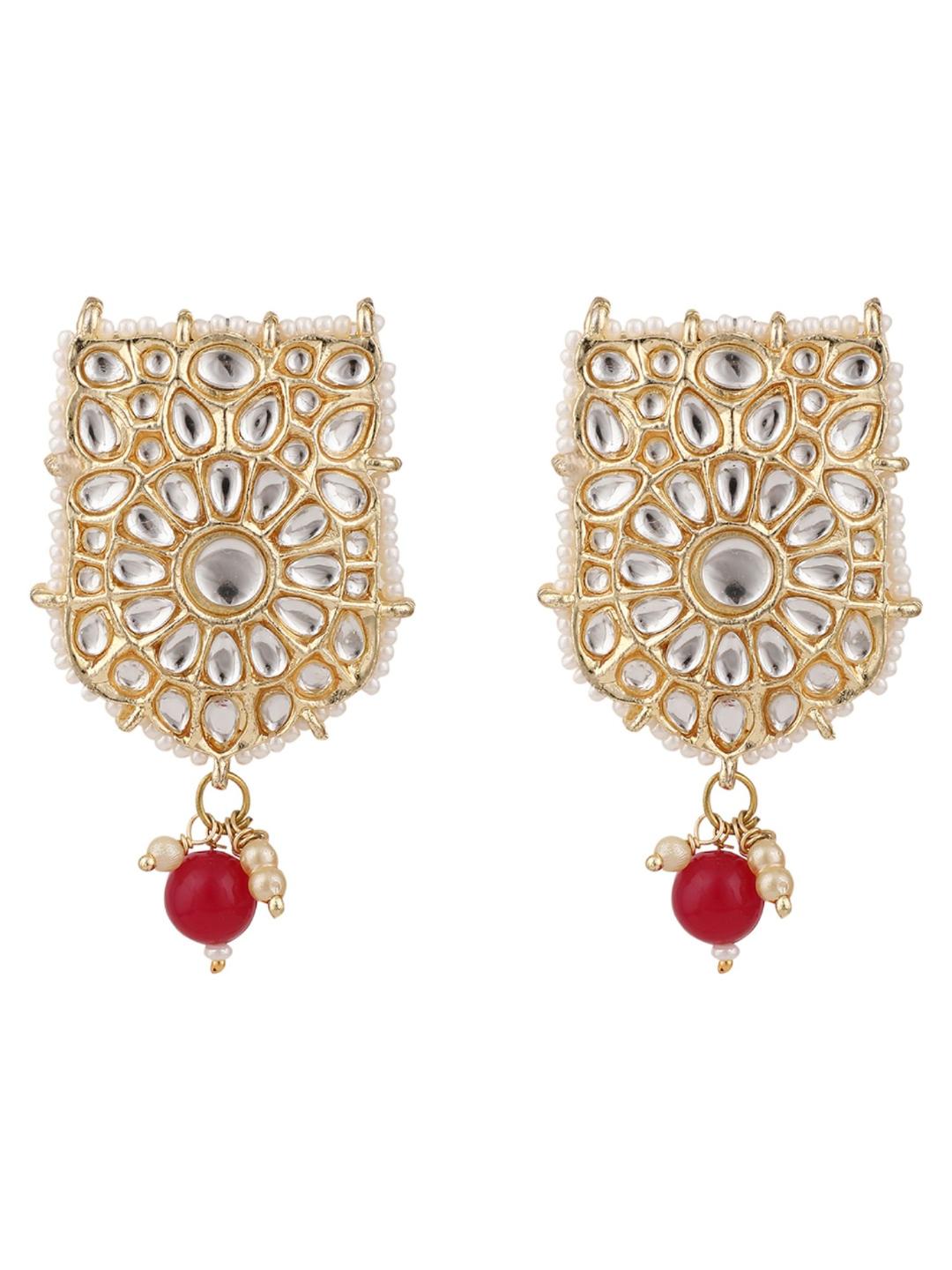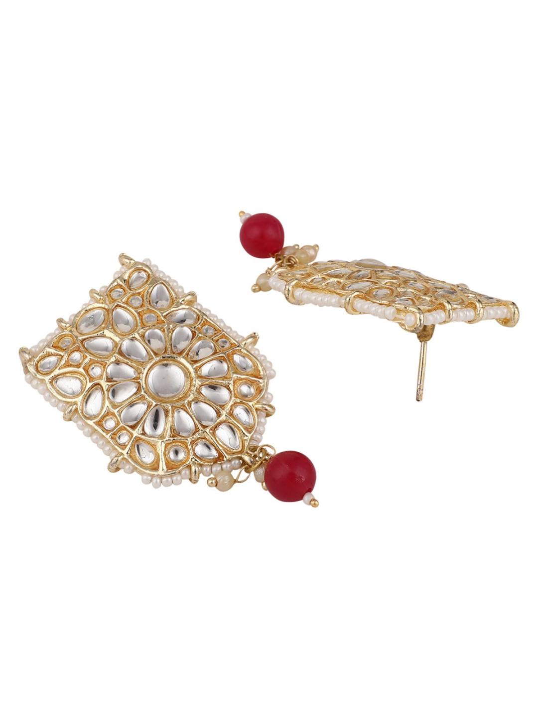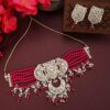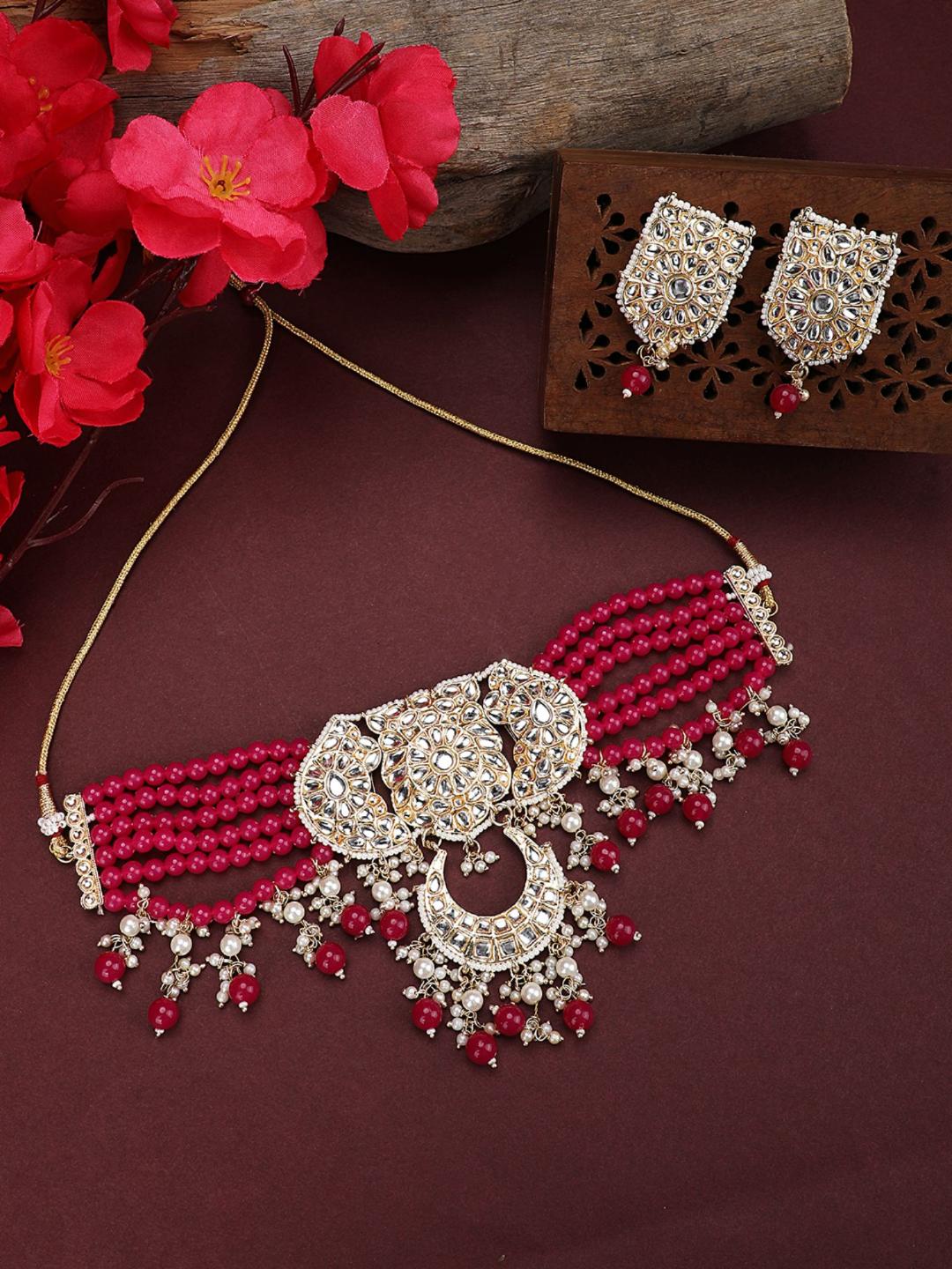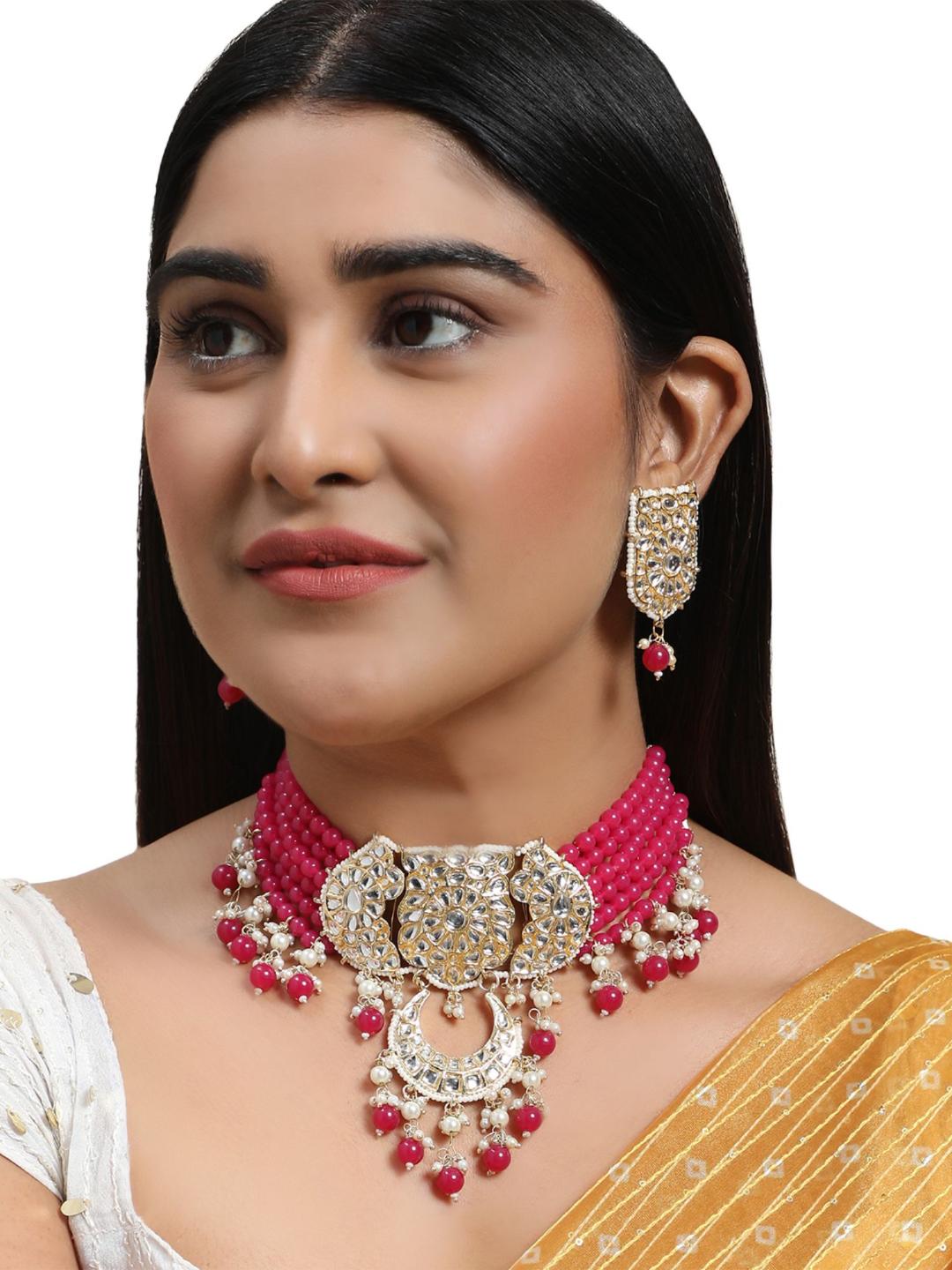 Magenta Beads String Kundan Stone Studded Choker Brass Necklace With Earring Maangtika