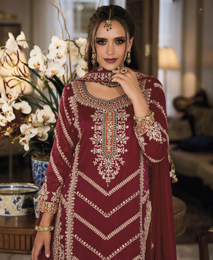 Maroon Chinon Straight Suit For Women Wear