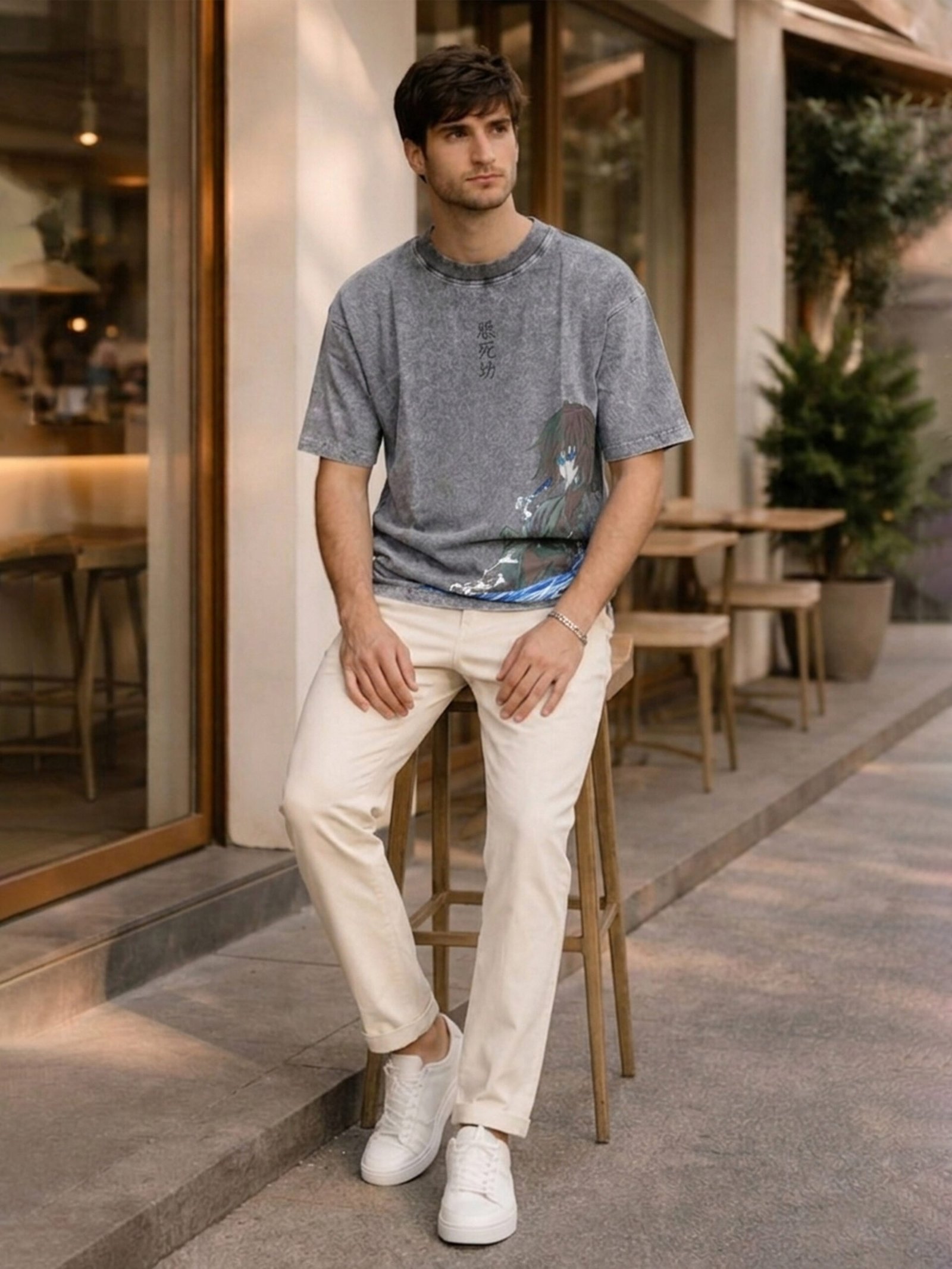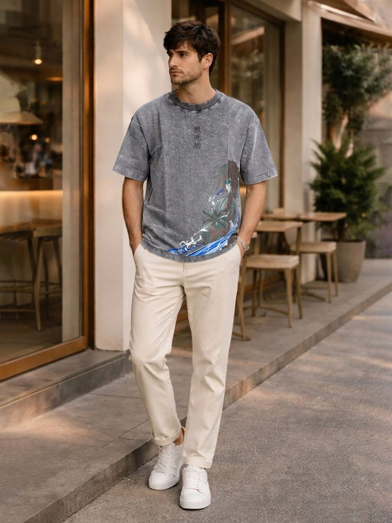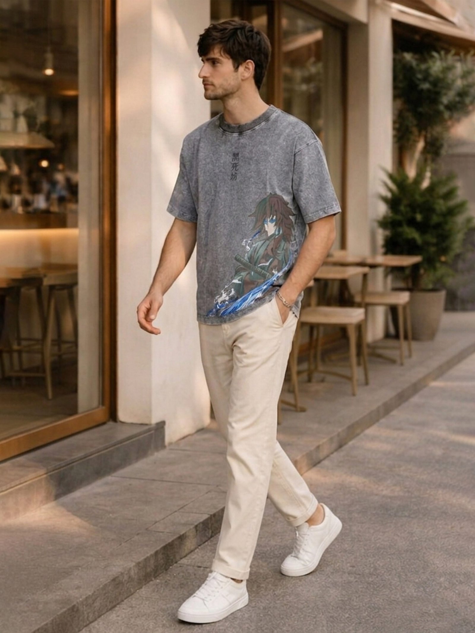 Channel your inner warrior with this standout streetwear tee. Featuring a bold anime swordsman graphic accented by fluid, vibrant blue water elements, this shirt is an instant conversation starter. The fabric boasts a custom acid wash treatment for that authentic grunge look.