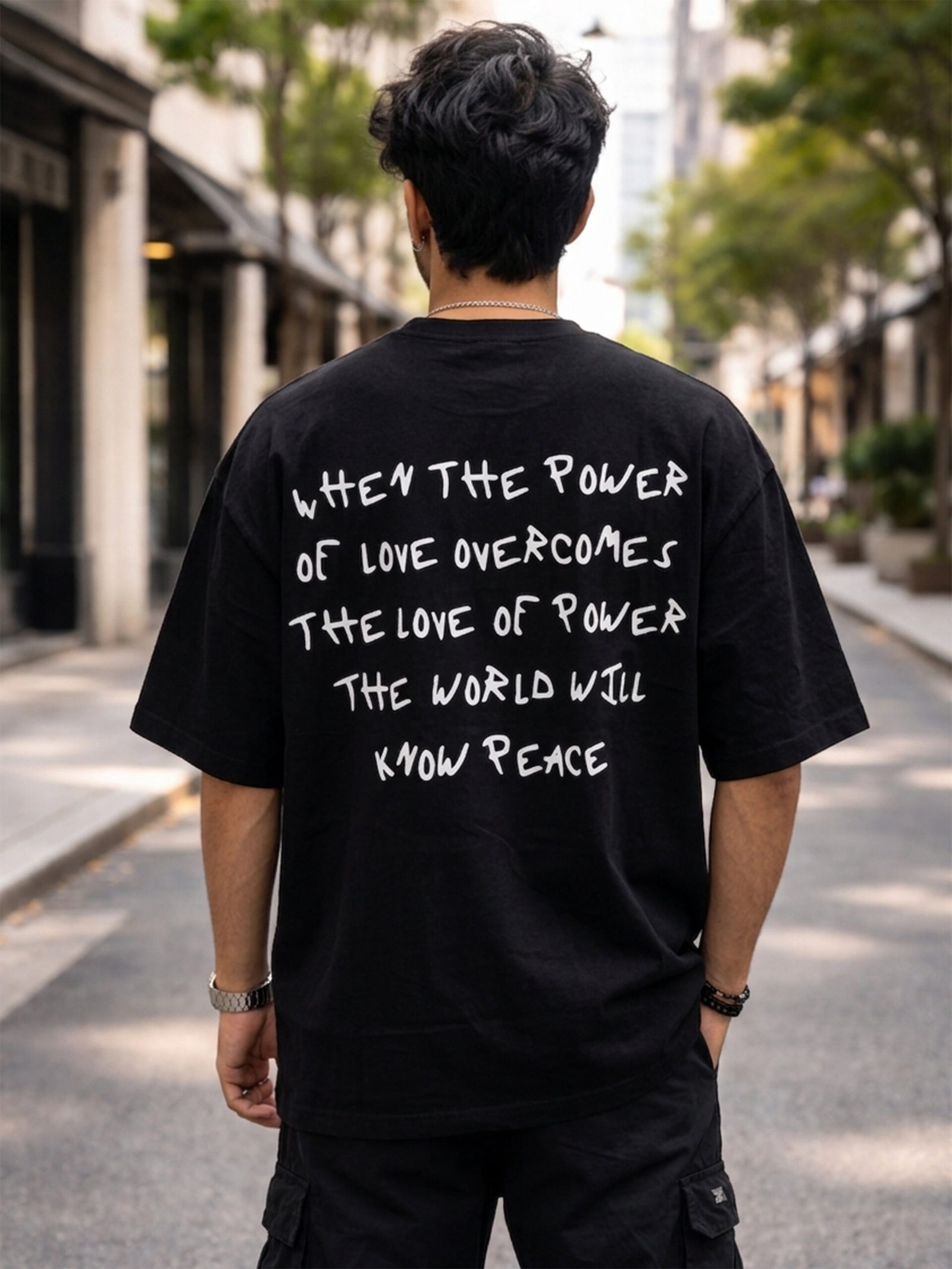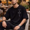 A sleek black oversized streetwear tee featuring contrasting minimal front branding and a powerful back quote.