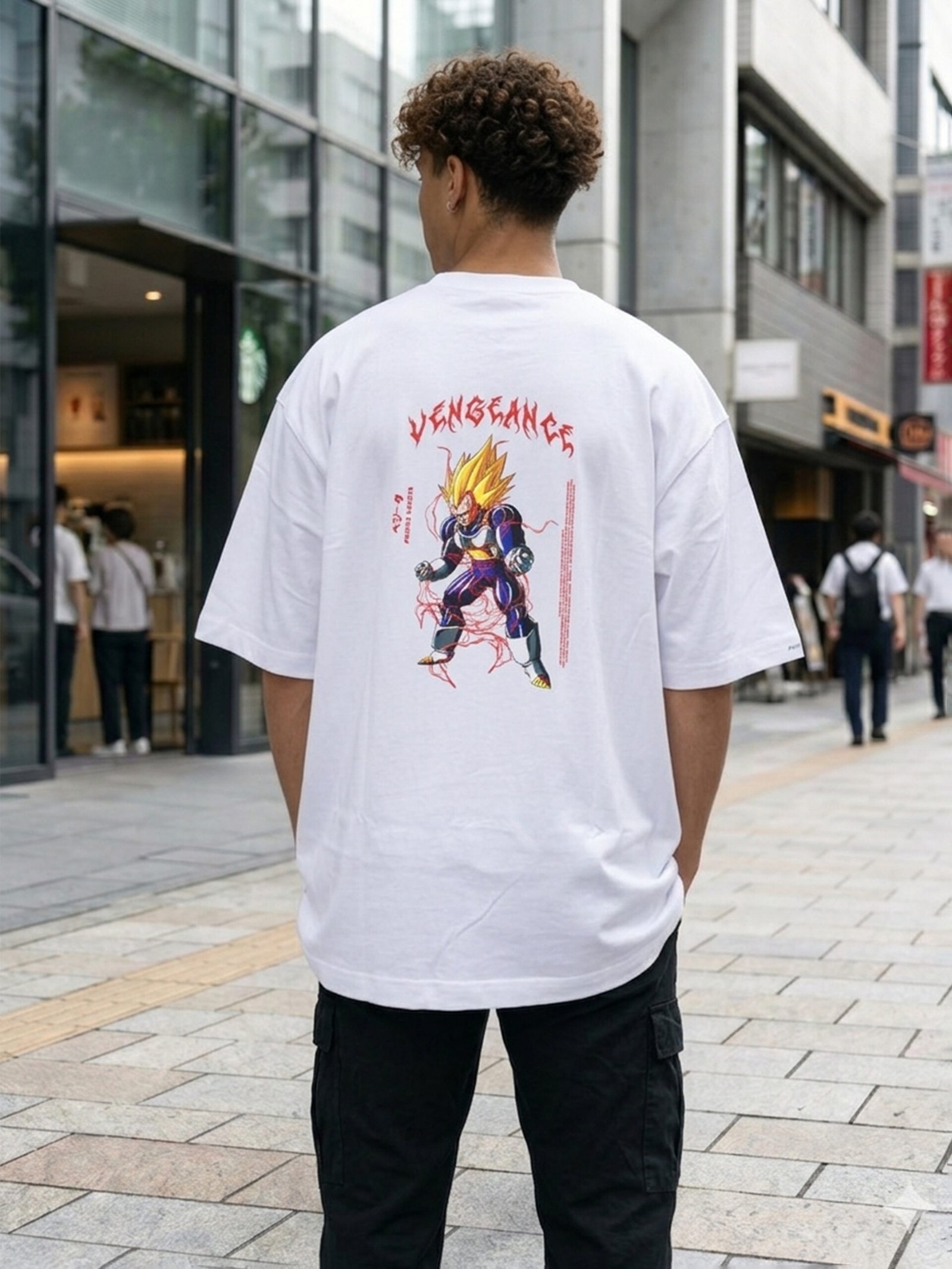 Men’s White Oversized ‘Vengeance’ Vegeta Anime Graphic T-Shirt