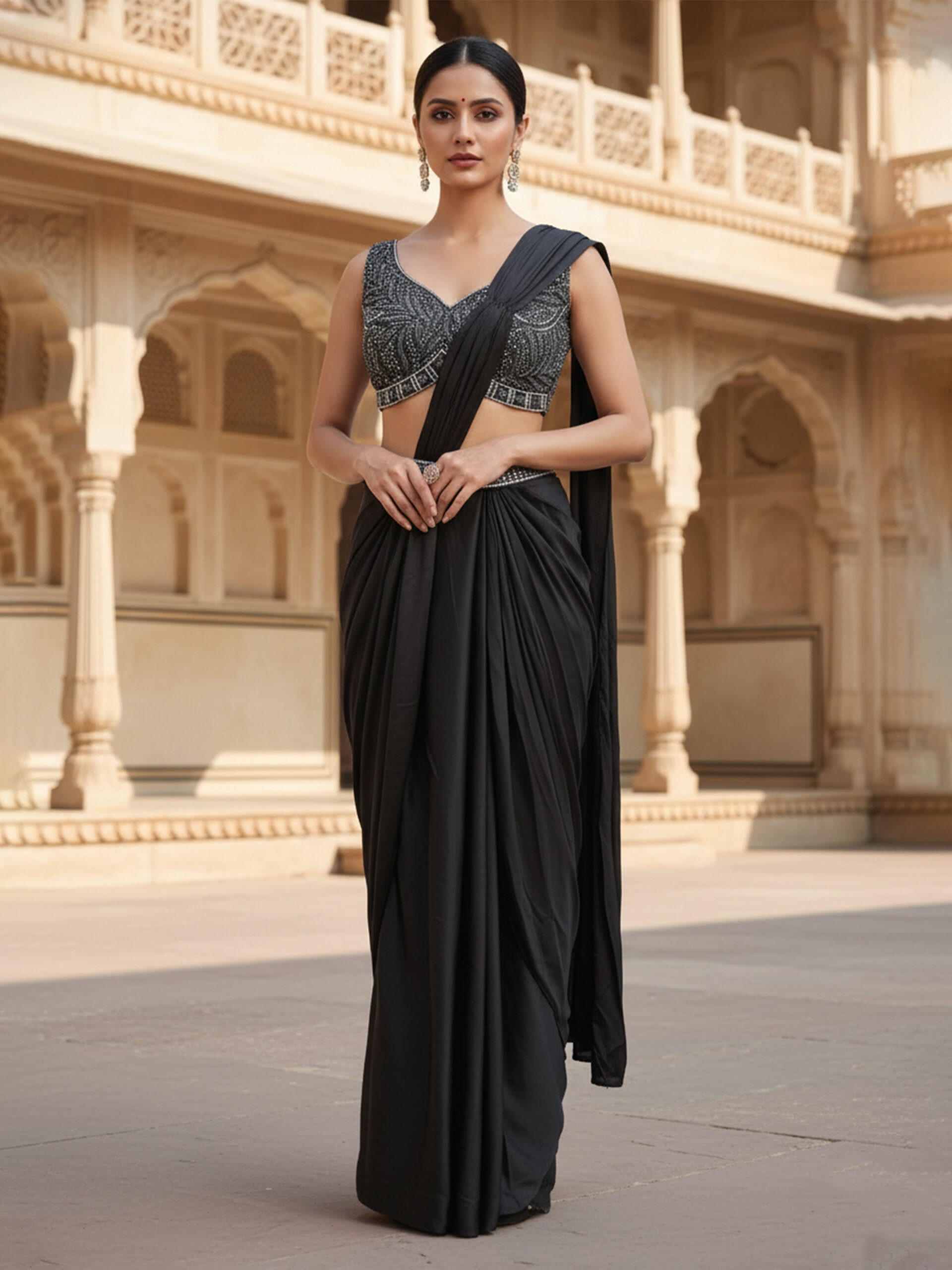Step into timeless sophistication with the Midnight Noir Embellished Draped Saree, designed to embody bold elegance and refined glamour. Featuring a fluid ready-to-wear drape paired with a strikingly embellished blouse, this saree delivers a powerful yet graceful silhouette. Ideal for evening celebrations and upscale occasions, it is a statement piece for the modern woman.