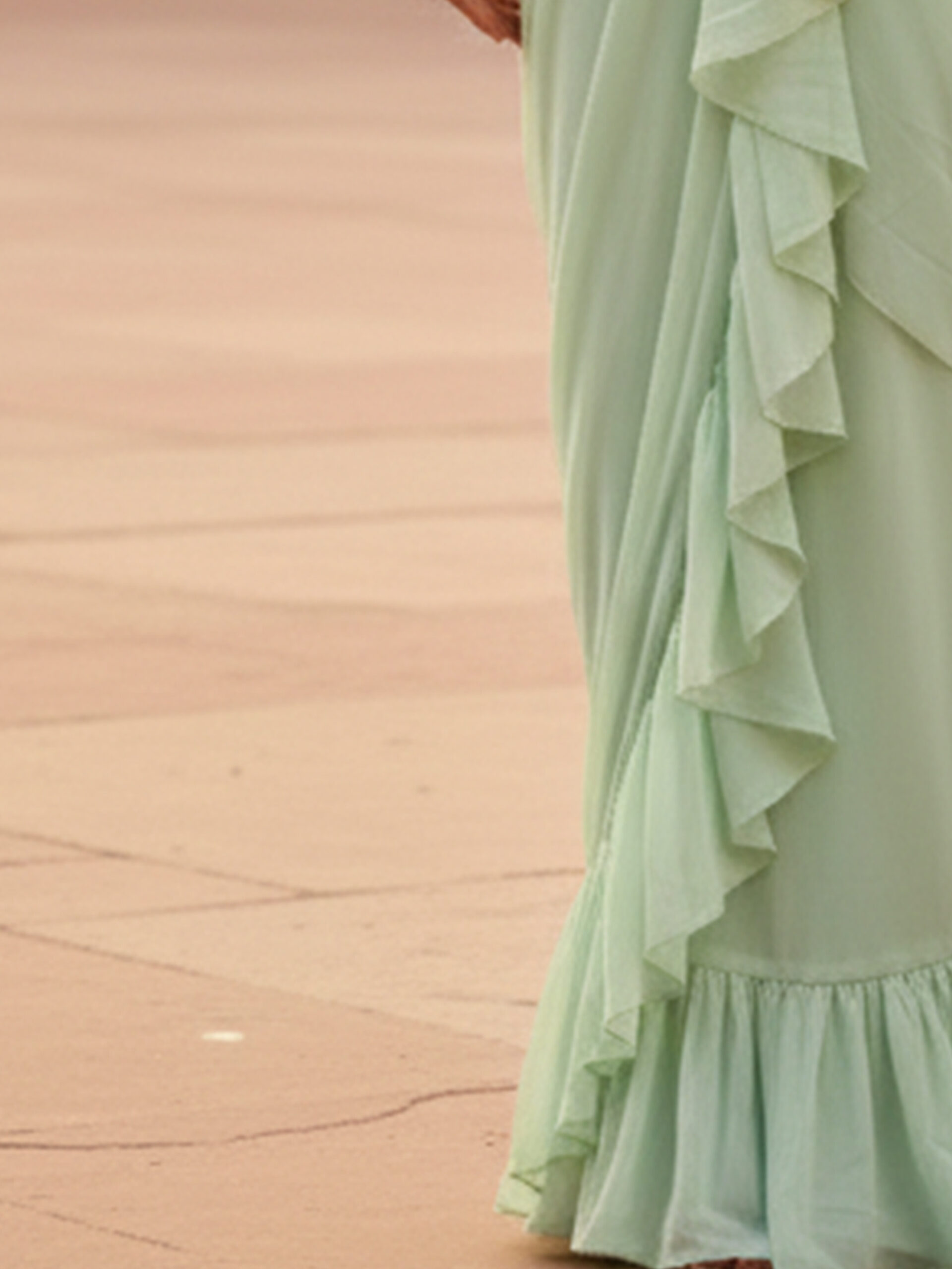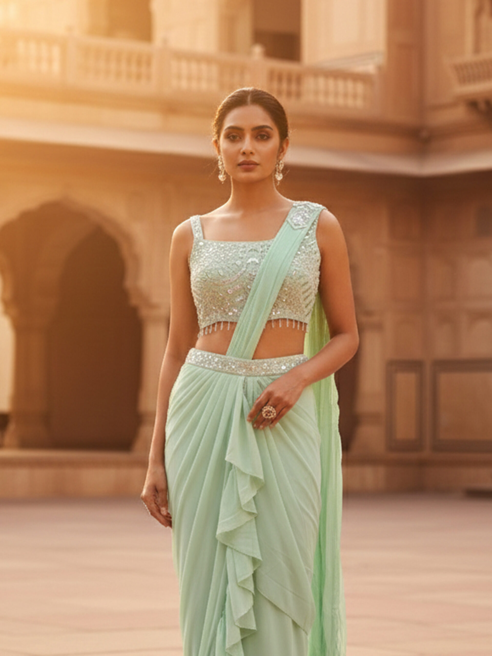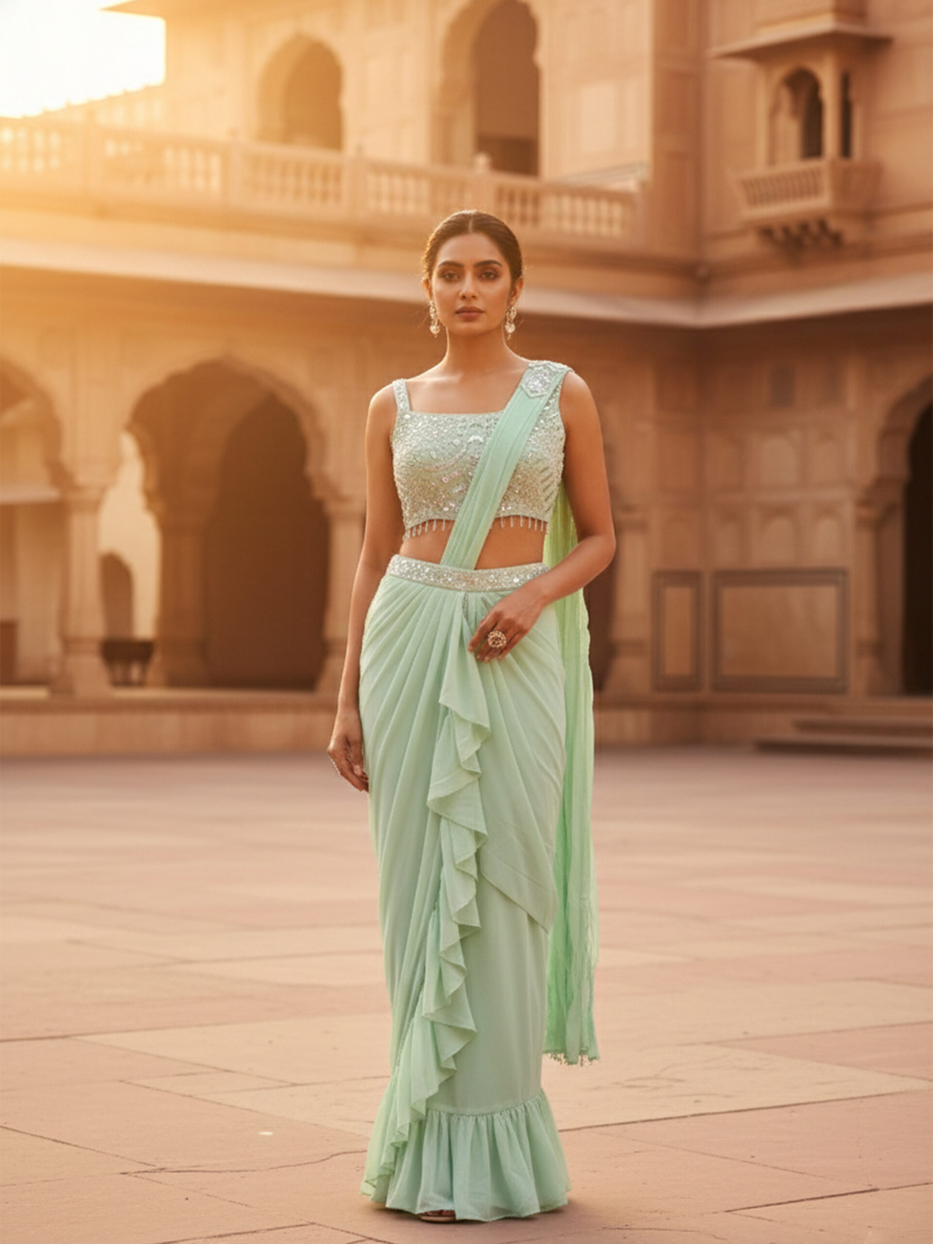 Mint Green Ruffle Pre-Draped Saree with Embellished Sleeveless Blouse