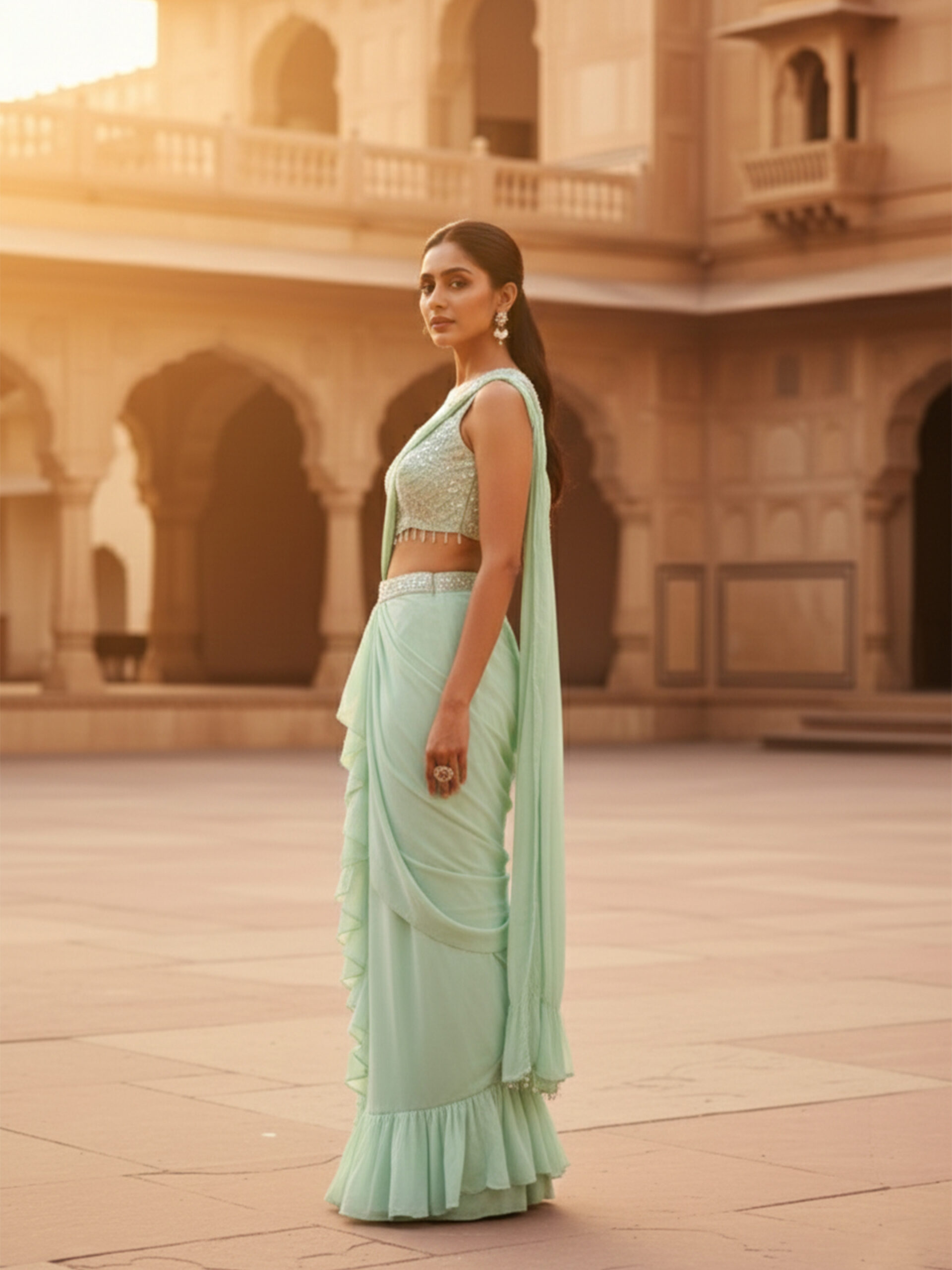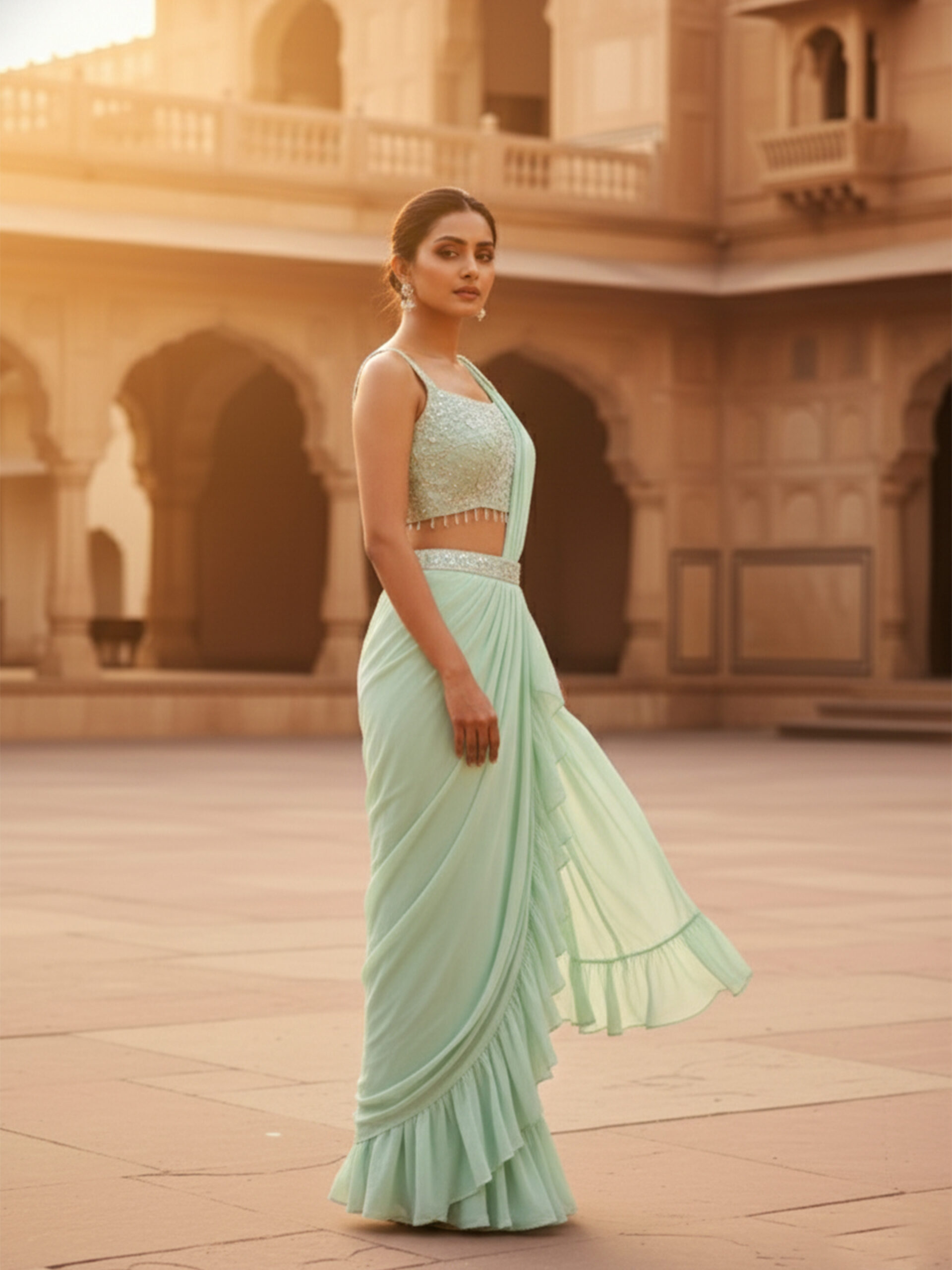 Exude serene elegance with this mint green pre-draped saree, crafted for modern celebrations with a royal backdrop. Featuring soft cascading ruffles and a delicately embellished blouse, this ensemble blends contemporary draping with timeless Indian charm. Lightweight and fluid, itโ€™s designed for effortless grace and all-day comfort.