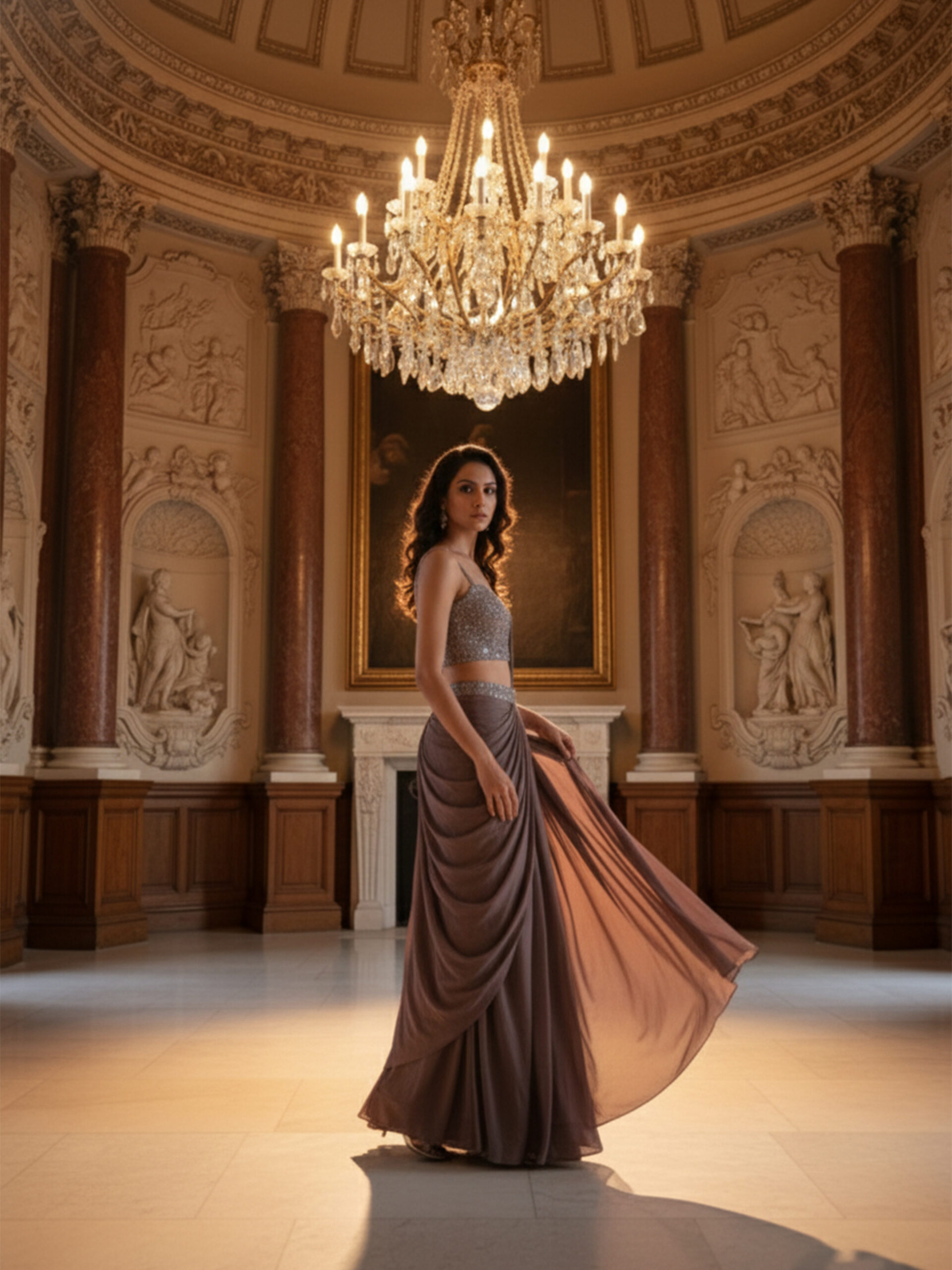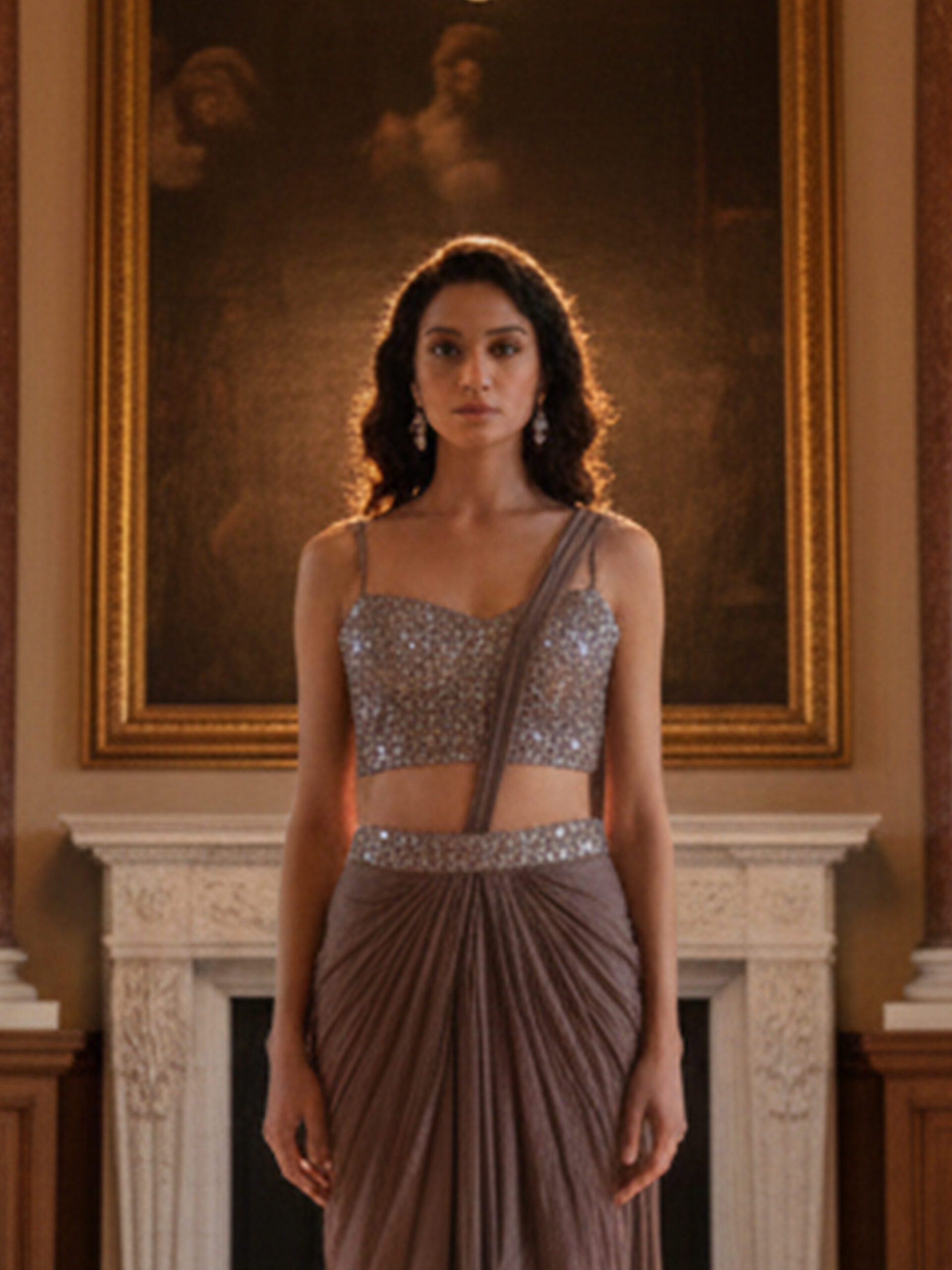 Be the first to review “Mocha Bronze Pre-Draped Saree with Crystal-Embellished Blouse”
