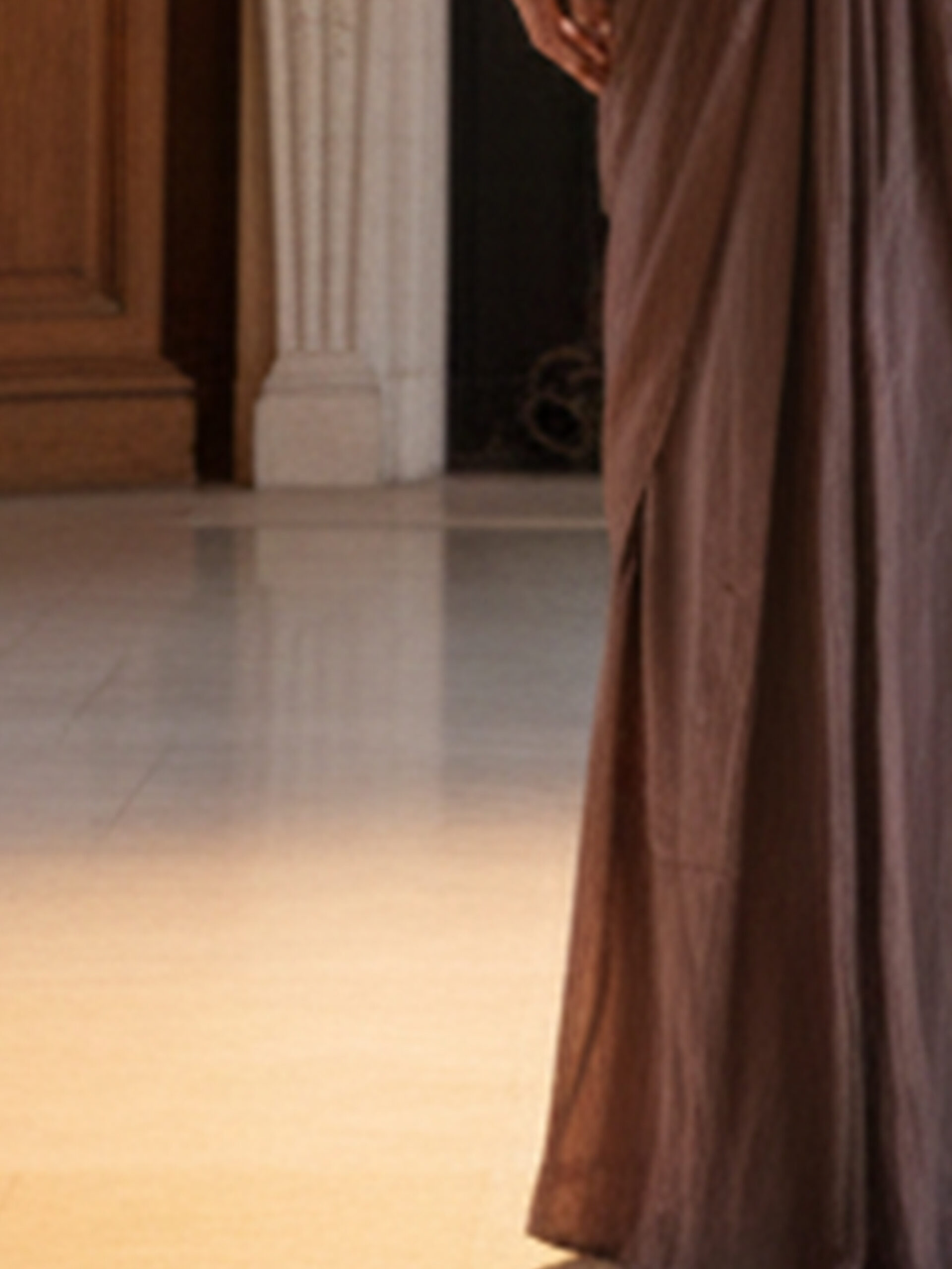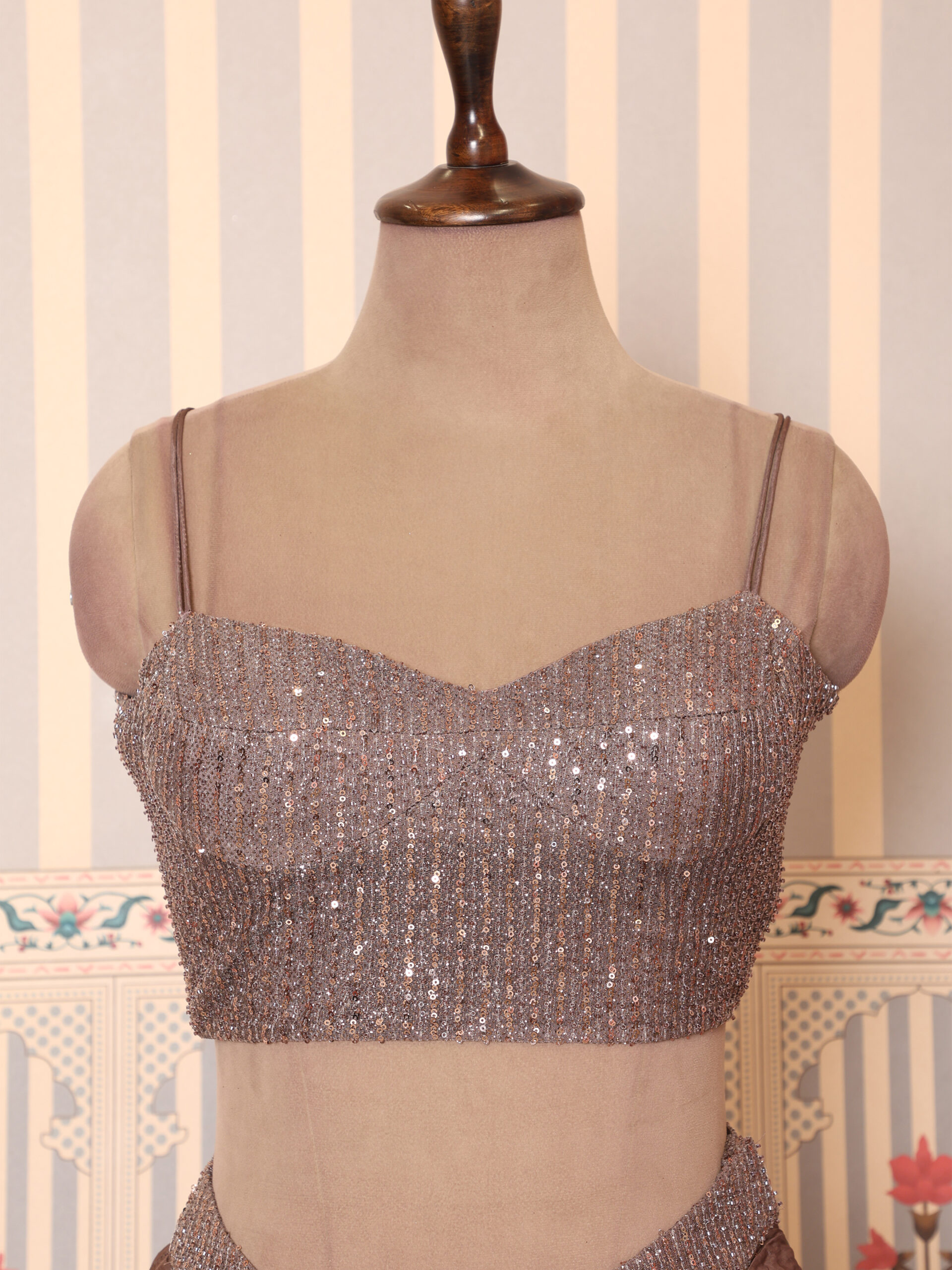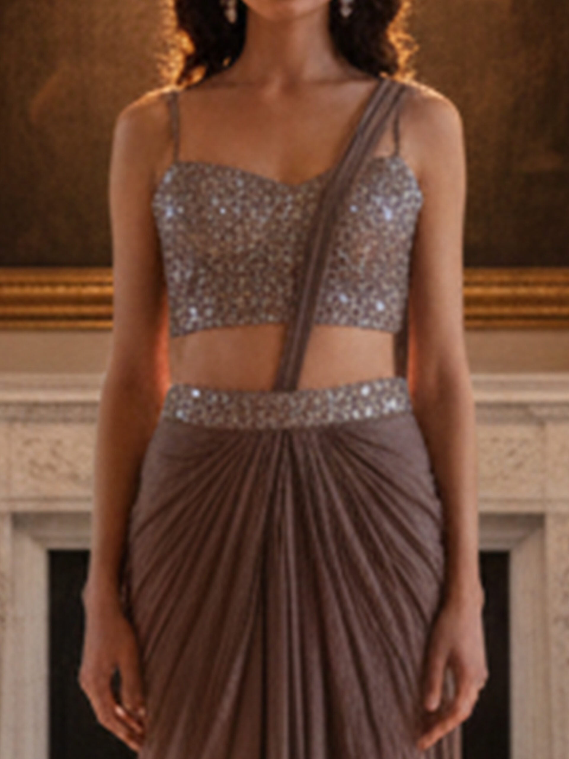 Mocha Bronze Pre-Draped Saree with Crystal-Embellished Blouse