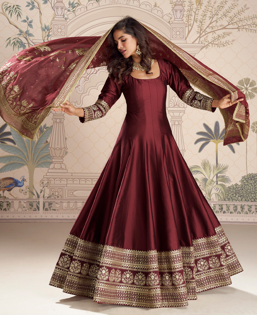 New Indian Heavy Wedding Wear Maroon Silk Anarkali Suit For Women