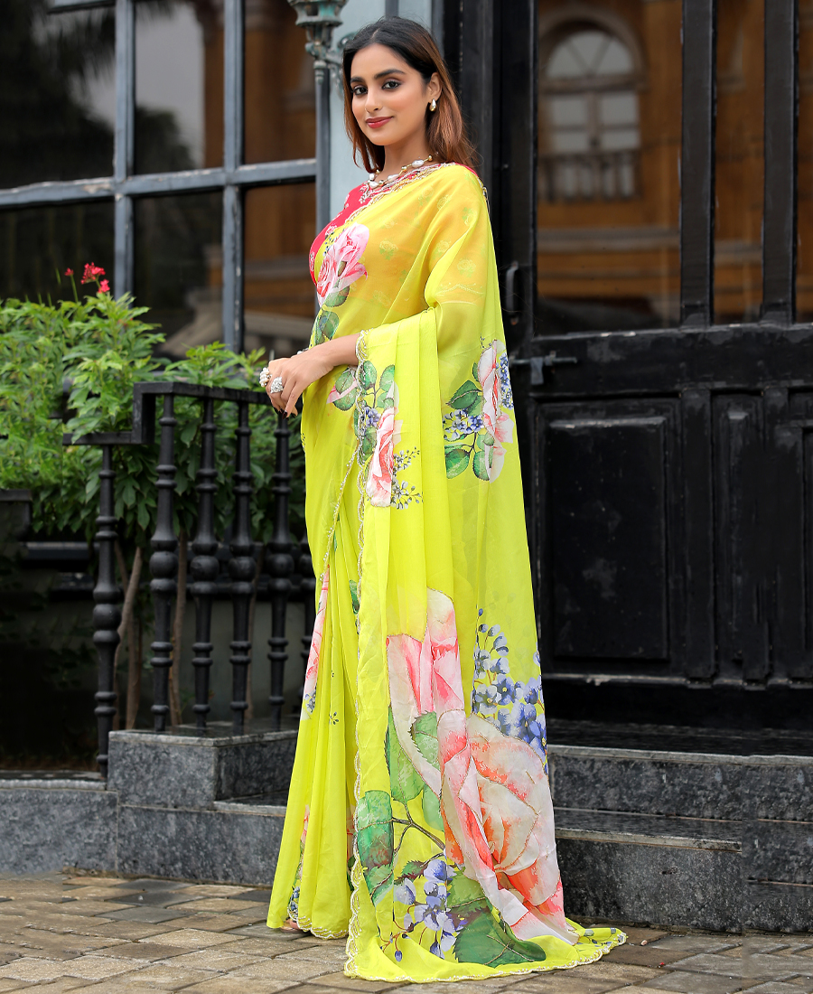 New Tabby Silk Yellow Hand Work Saree With Contrast Blouse