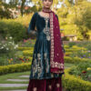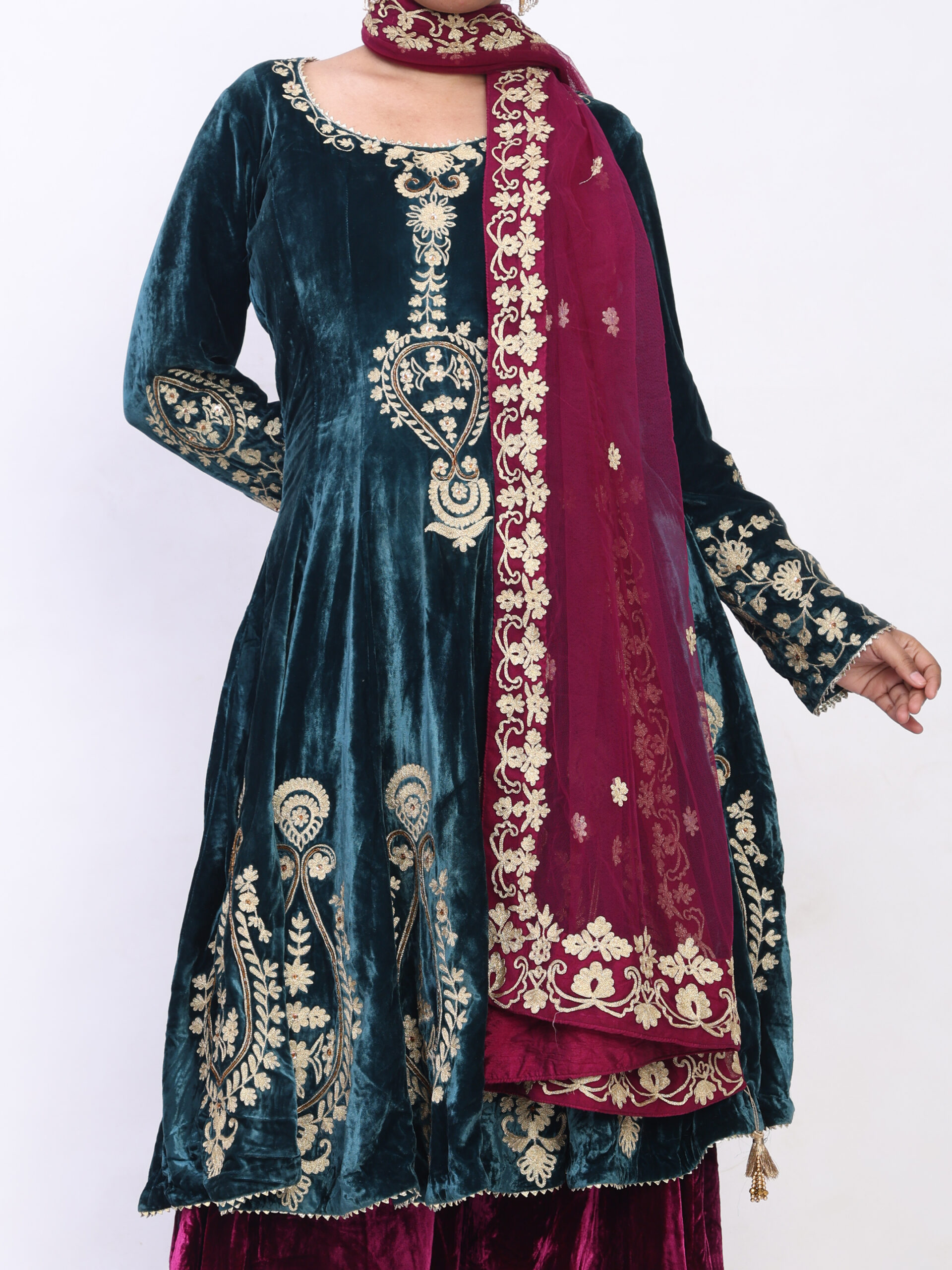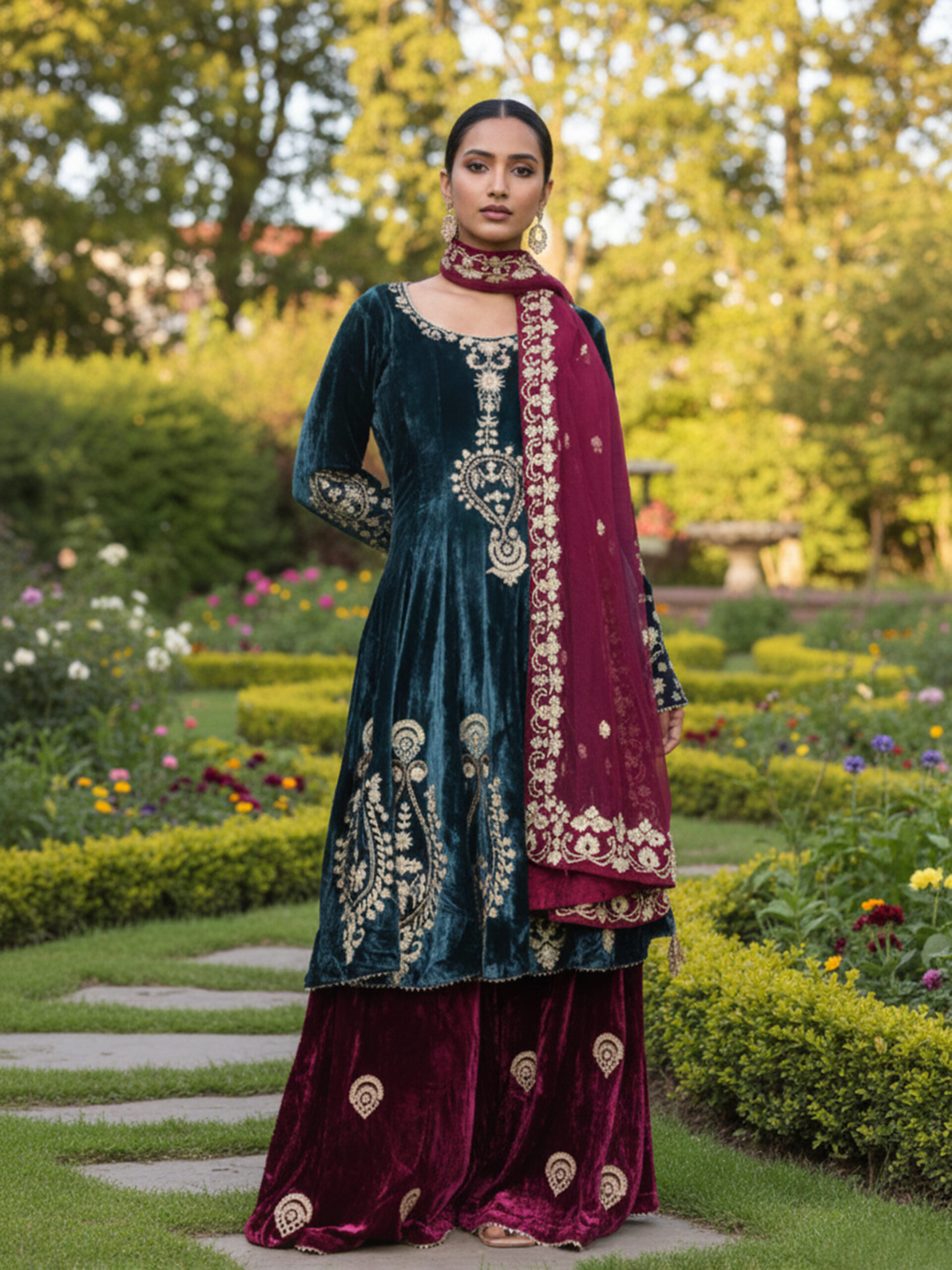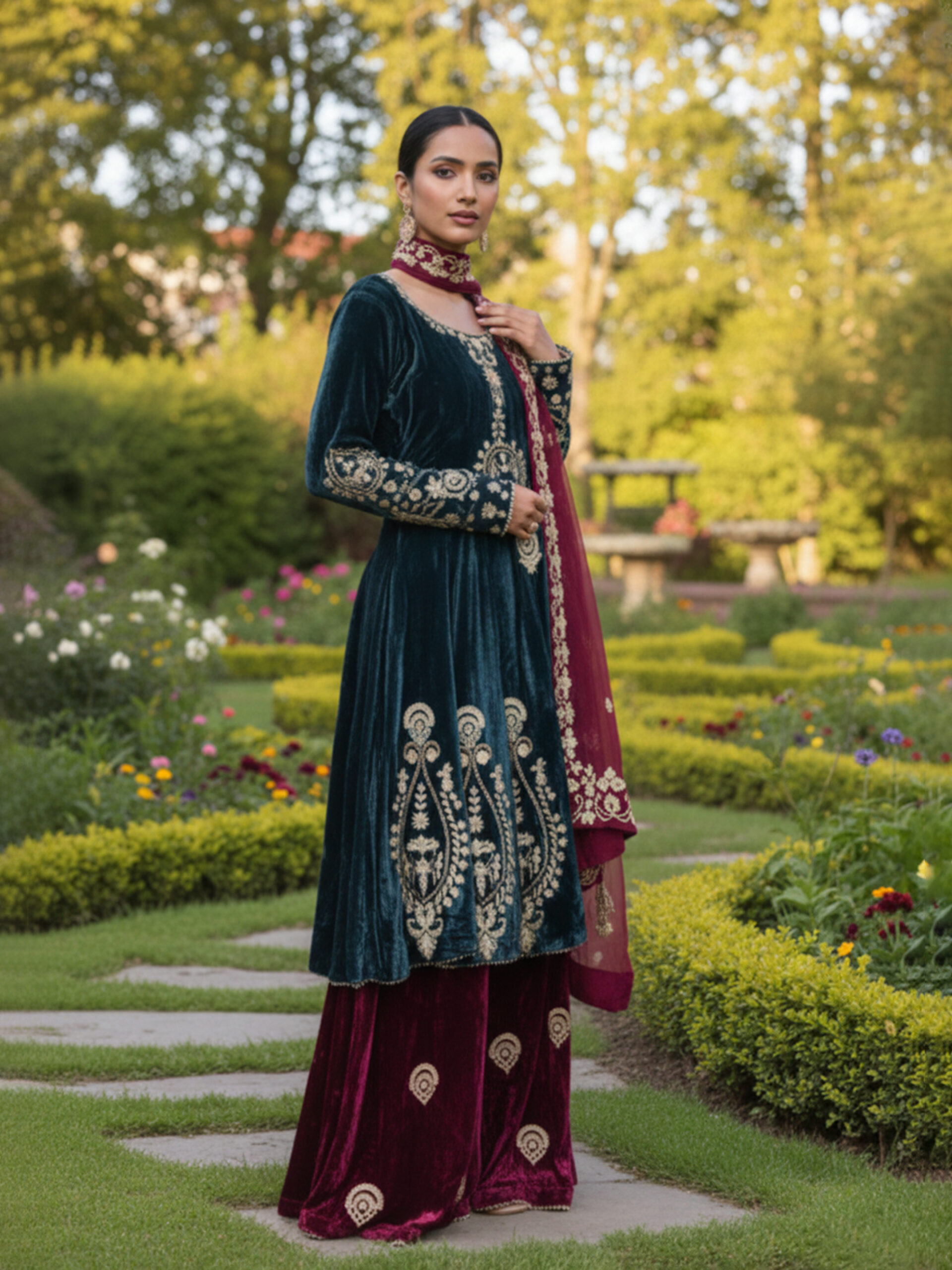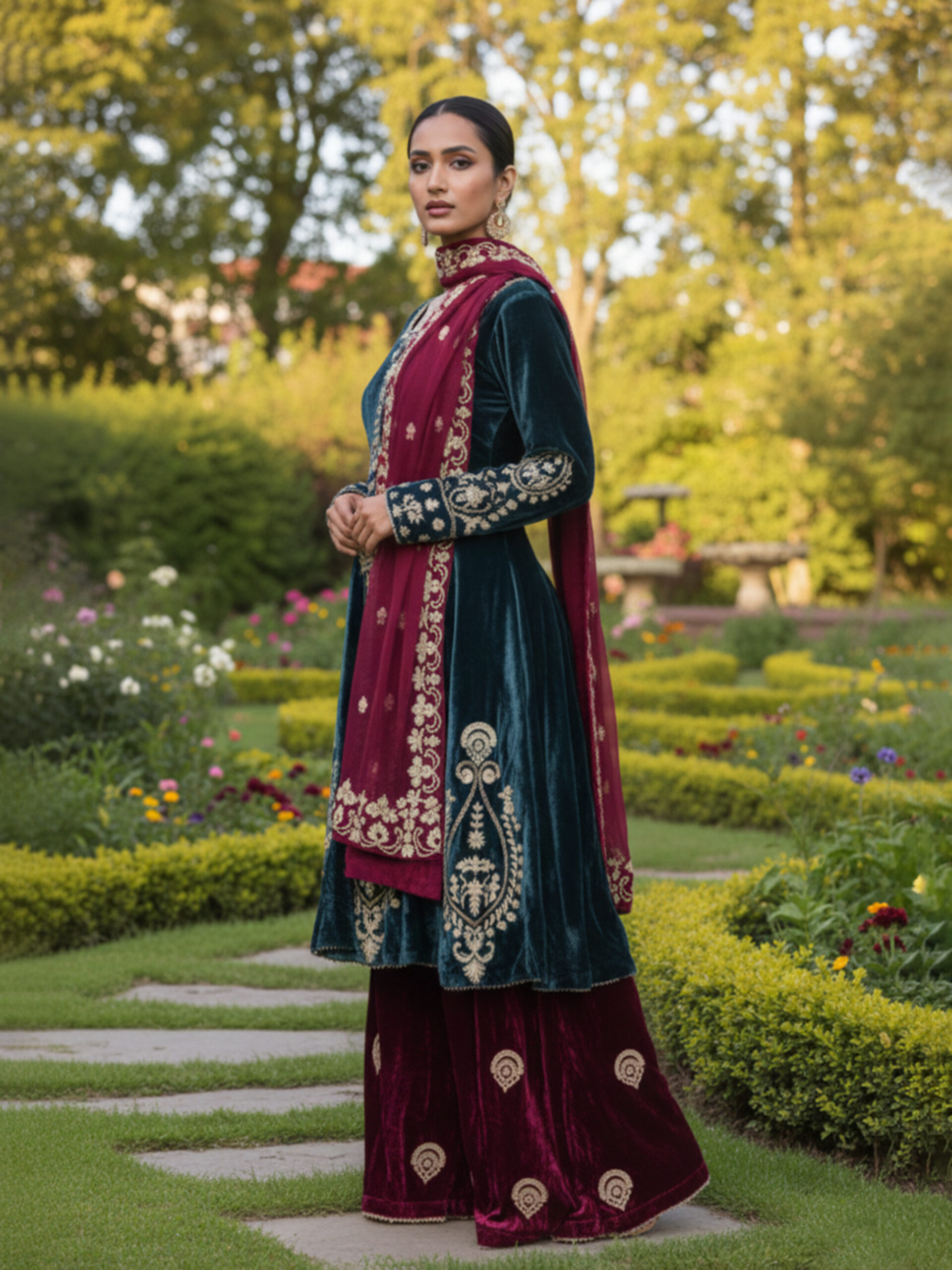 Elevate your festive wardrobe with the timeless charm of the Noor-e-Bagh Hand-Embroidered Velvet Kurta Sharara Set. Crafted for women who appreciate luxury and tradition, this elegant ensemble blends rich textures with exquisite craftsmanship. The deep teal velvet kurta is beautifully adorned with intricate handmade embroidery, featuring graceful floral and paisley motifs that add depth and regal appeal.