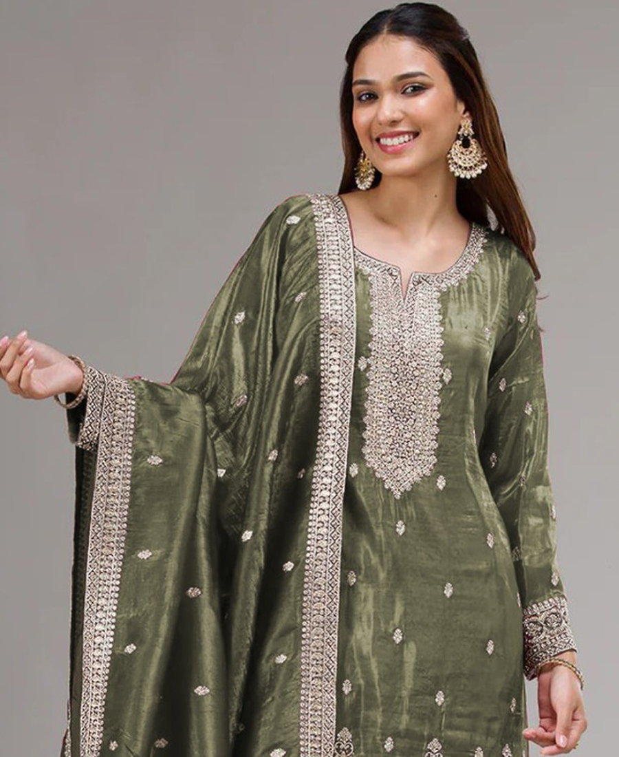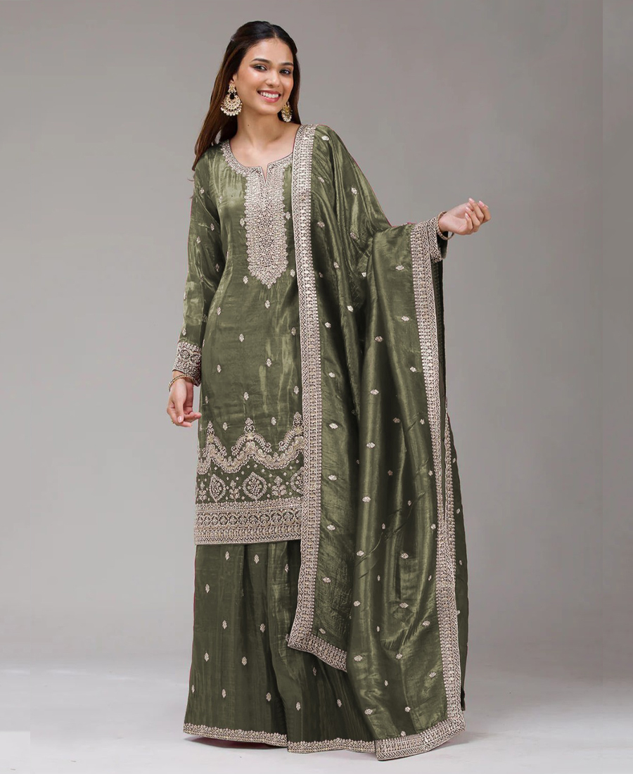 Pakistani Style Mahendi Gold Crush Palazzo Suit For Women