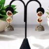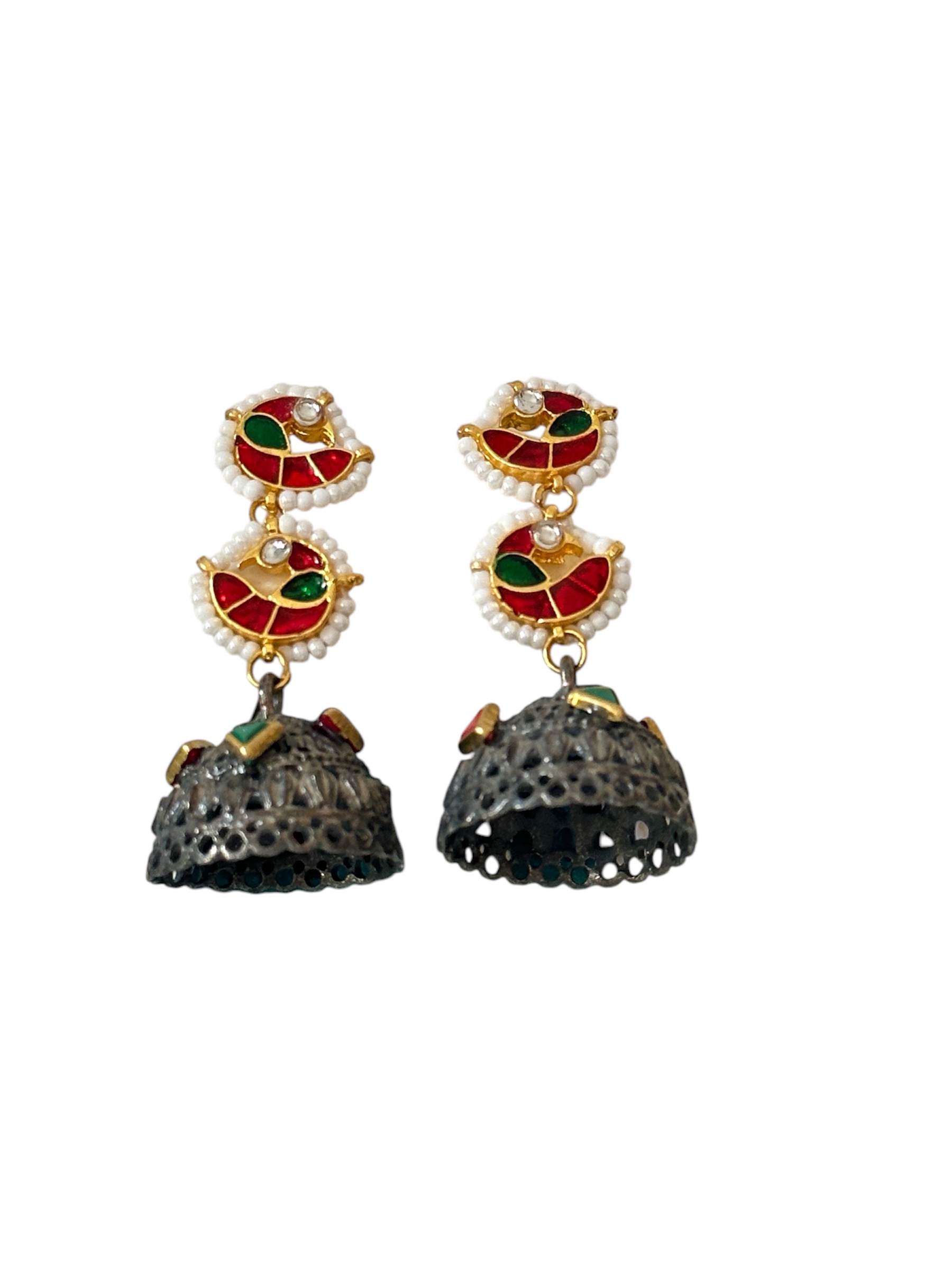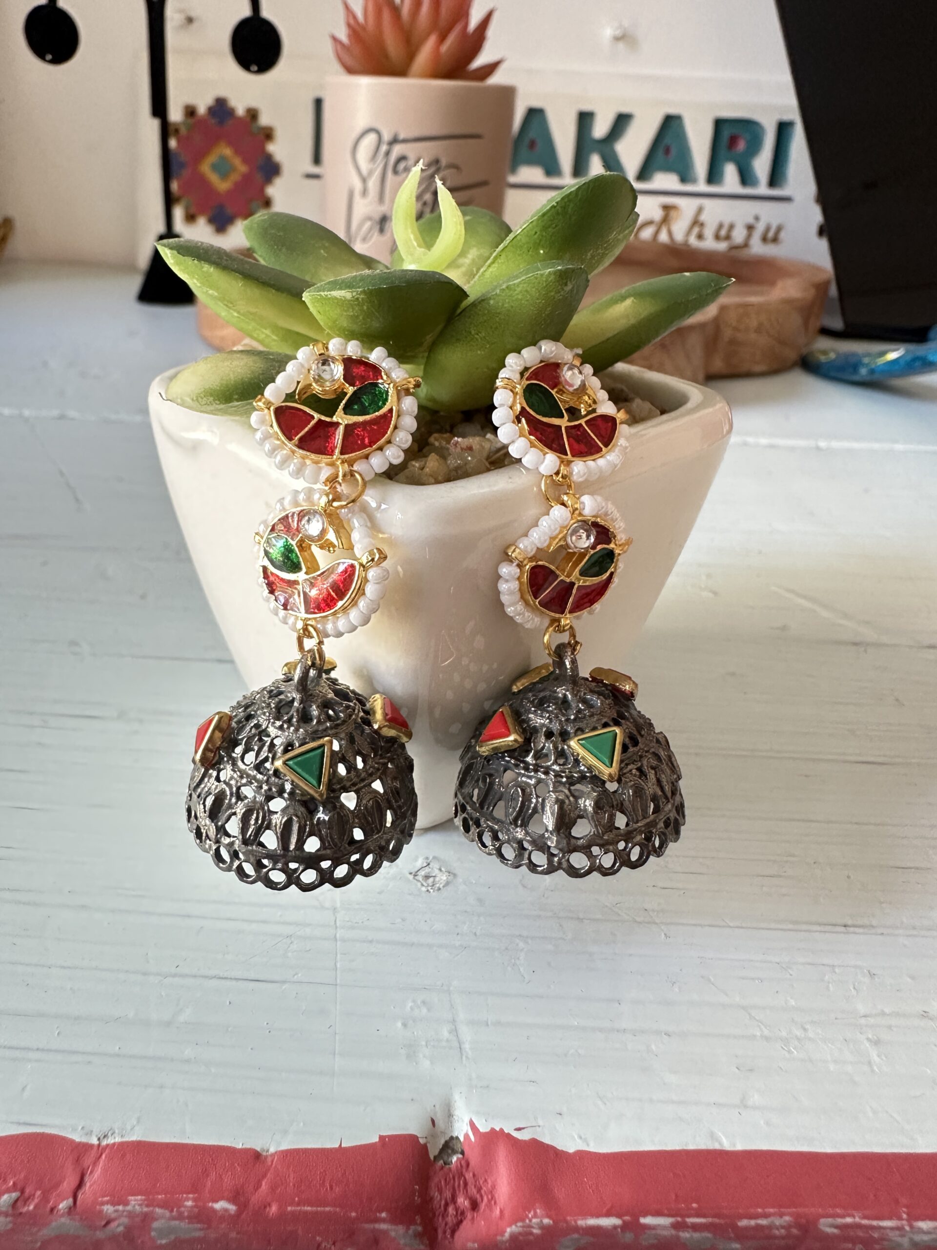 Lightweight and classy dual toned jhumkas perfect to uplift your ethnic look. It features high quality kundans with peacock motif and oxidized jhumkas.