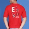 A vibrant red t-shirt with a playful, retro-inspired graphic on the back.