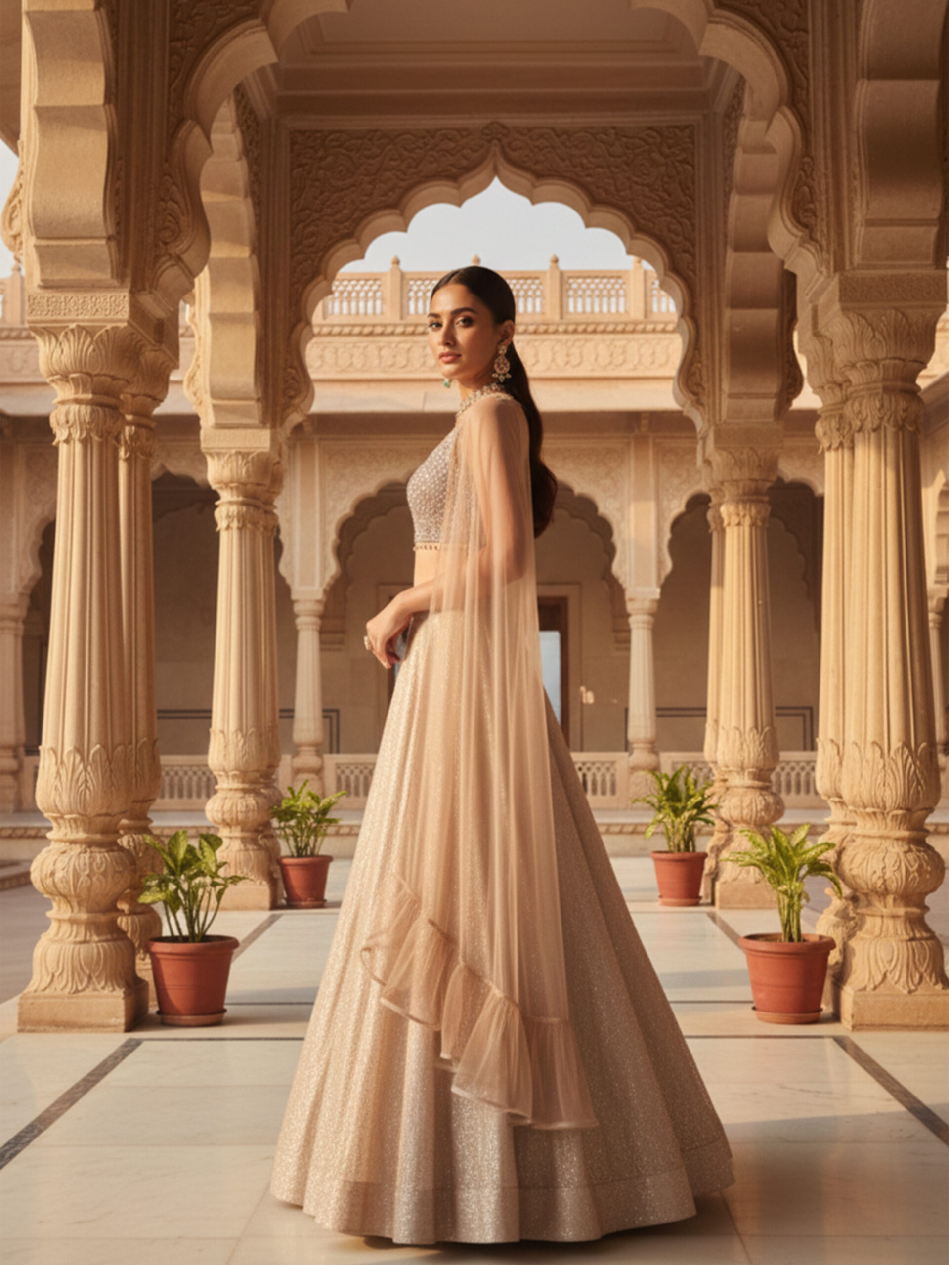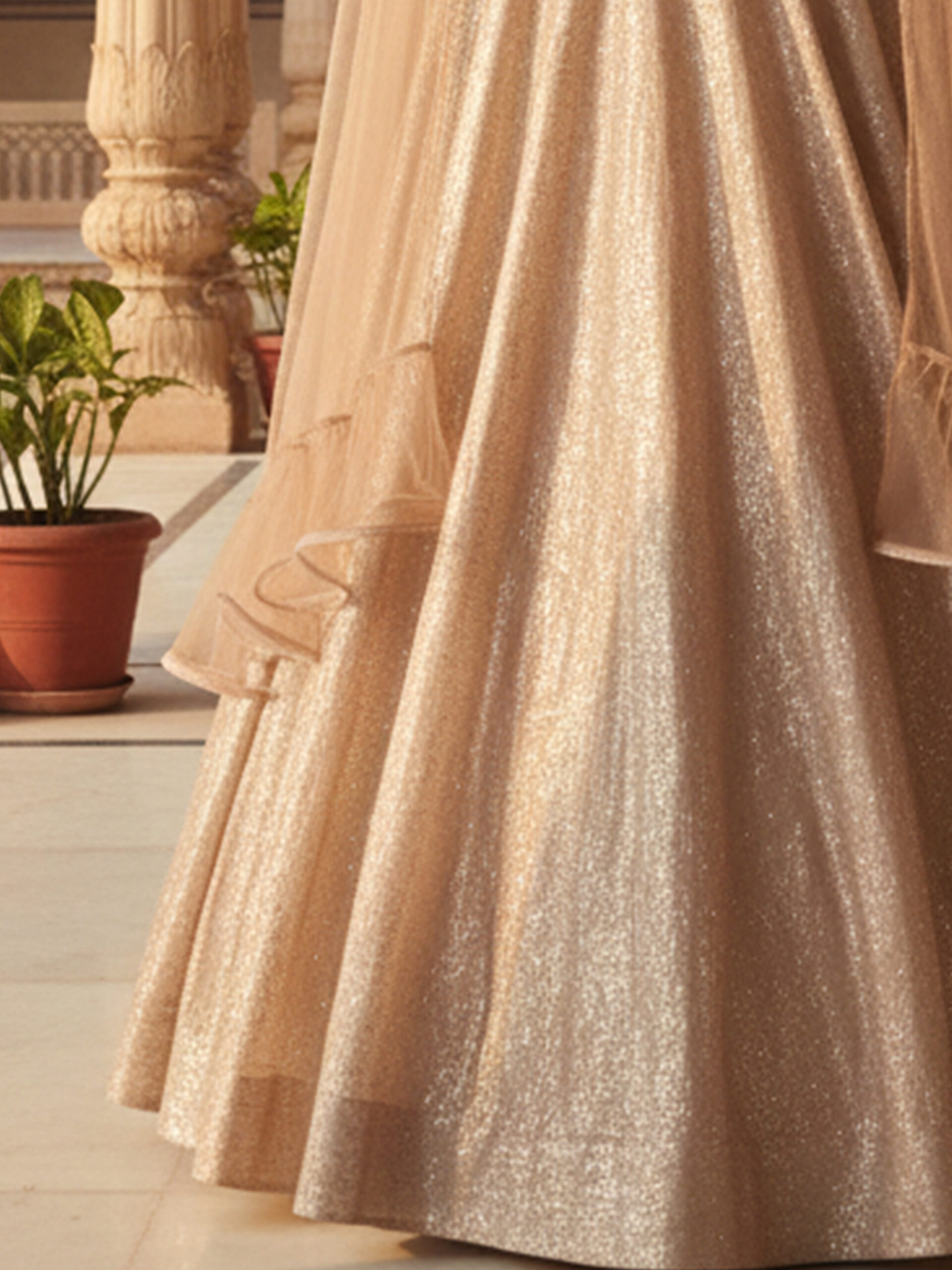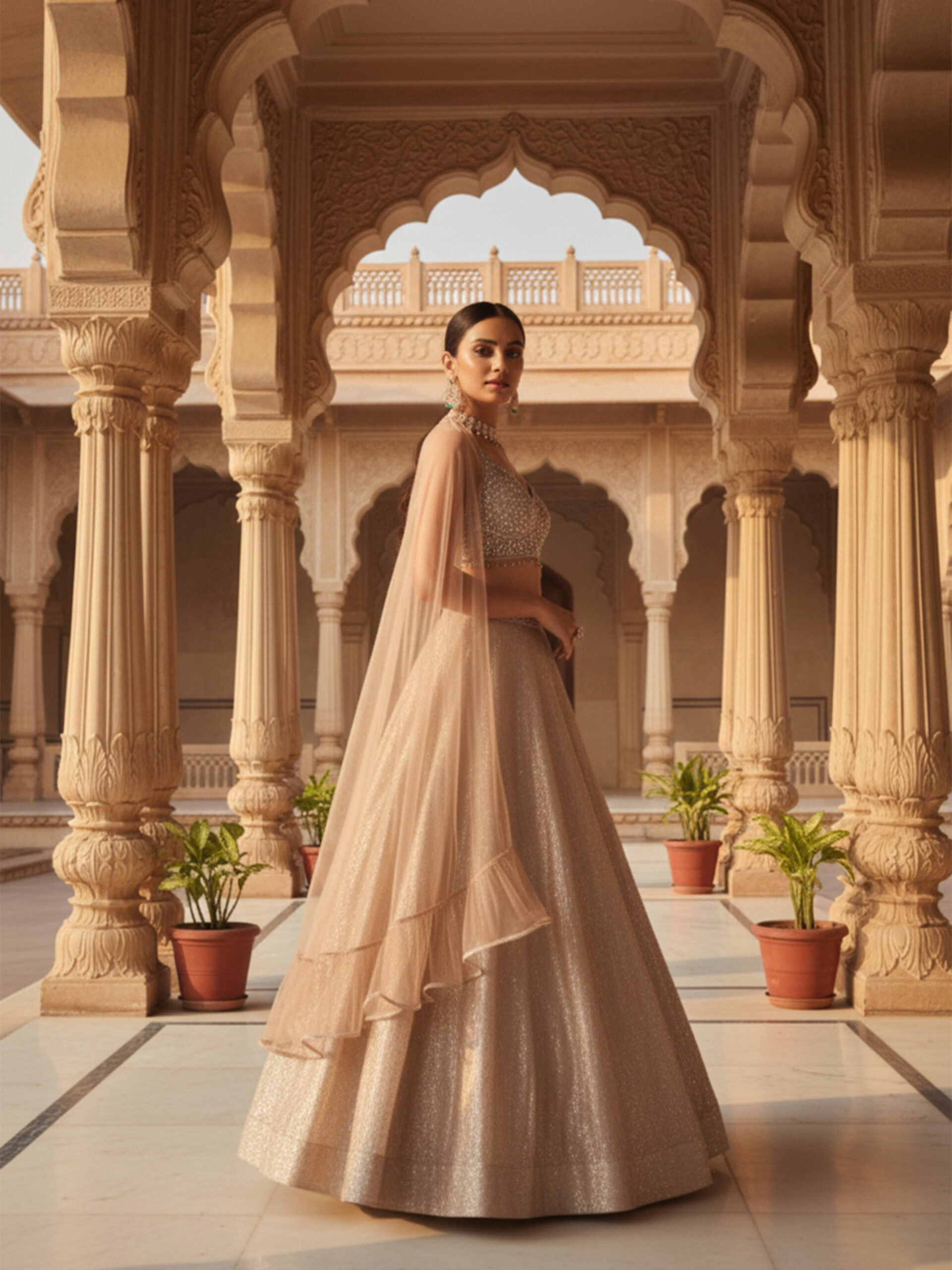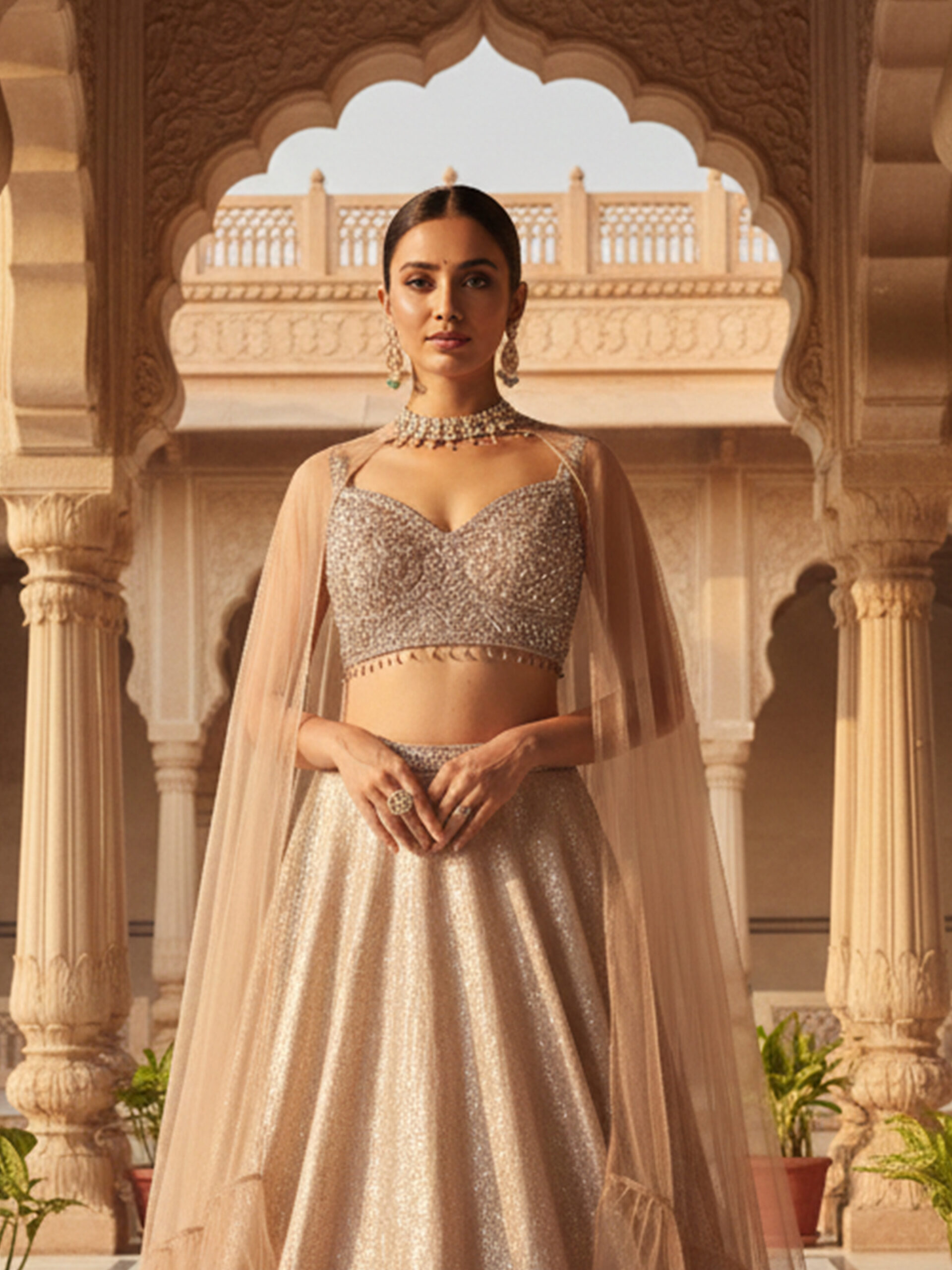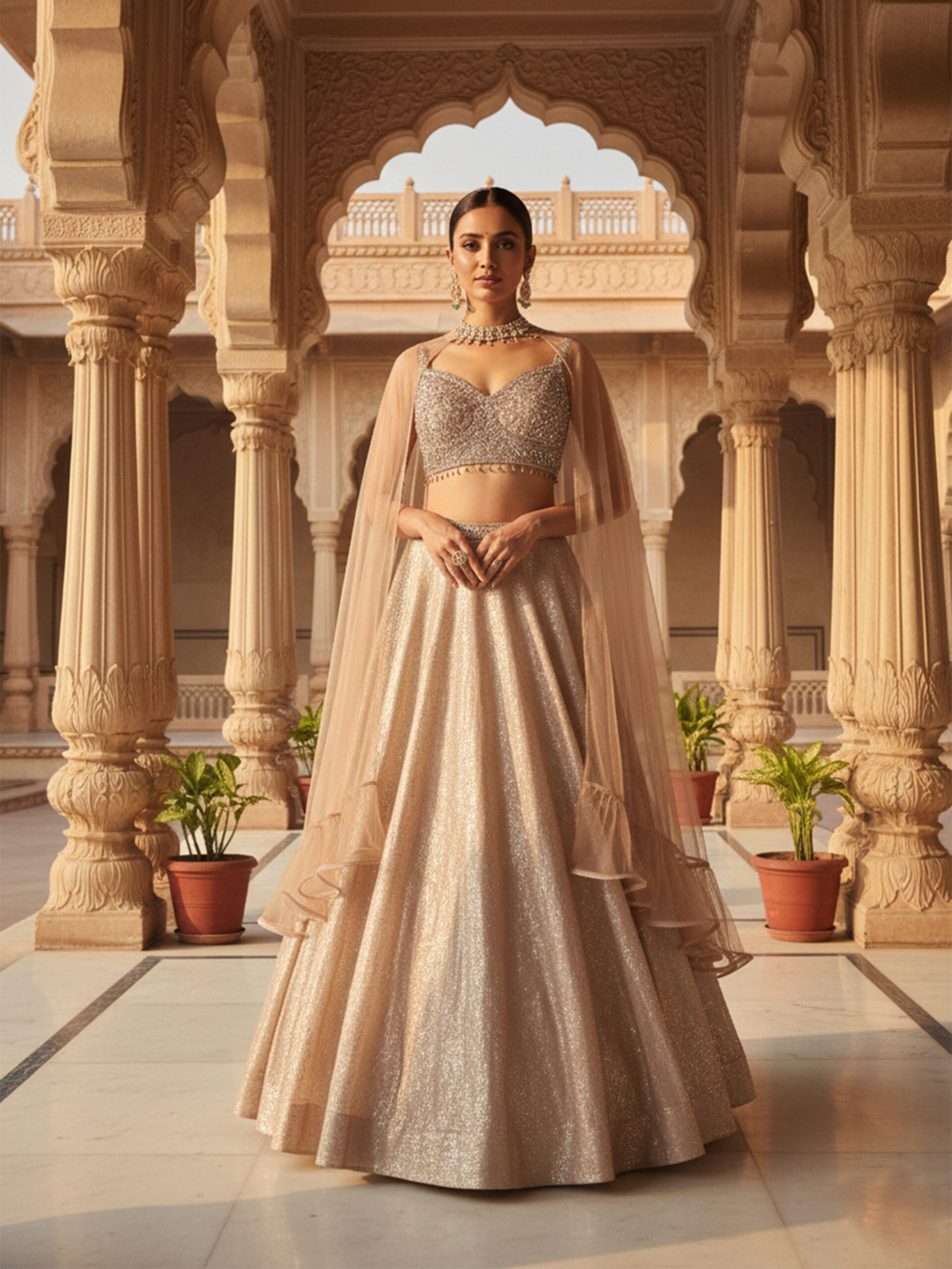 Step into regal elegance with this Royal Champagne Shimmer Lehenga Set, designed for modern bridesmaids and festive divas. Crafted in a luxurious shimmer fabric, this lehenga features a finely embellished blouse paired with a flowing flared skirt that catches the light with every step. The look is completed with a soft sheer cape-style dupatta, adding graceful movement and contemporary charm. Perfect for weddings, receptions, and grand celebrations, this ensemble blends royal tradition with modern sophistication.