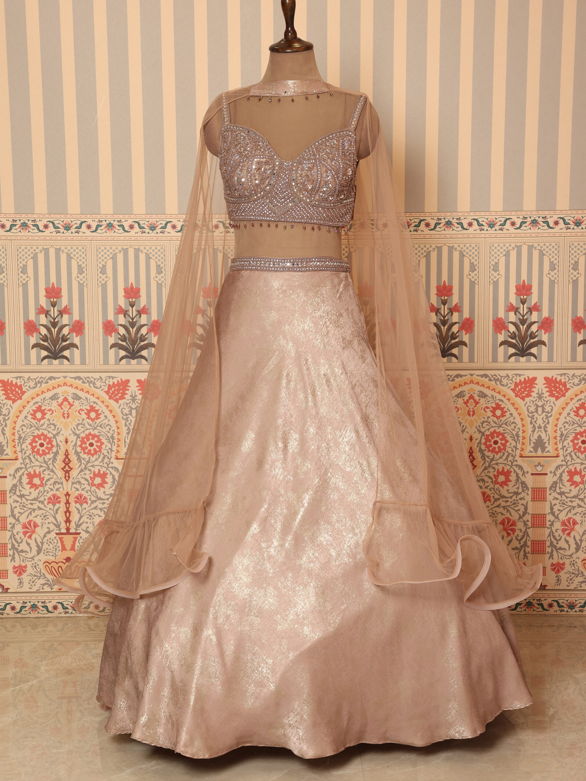 Royal Champagne Shimmer Lehenga Set with Sheer Cape
