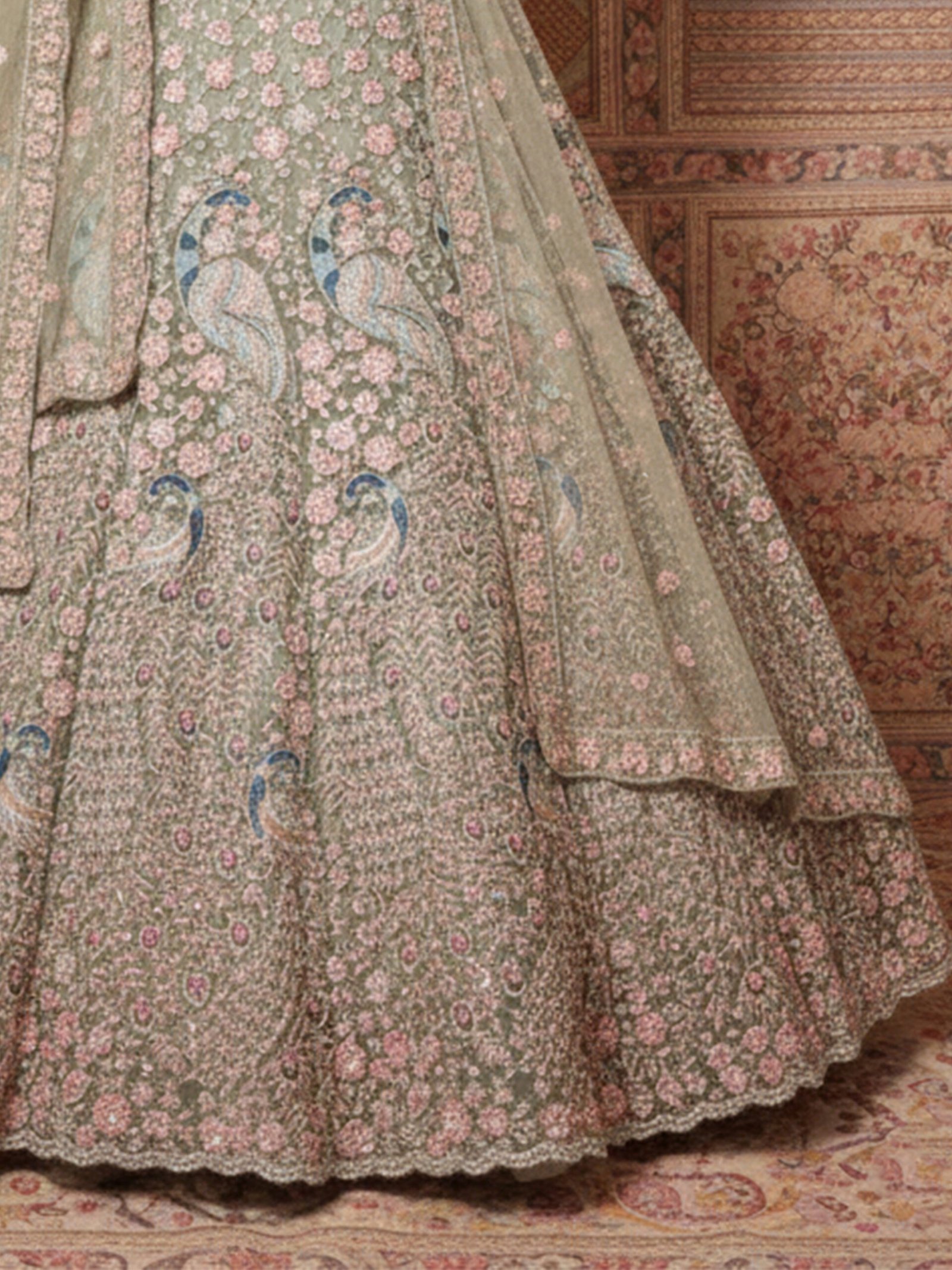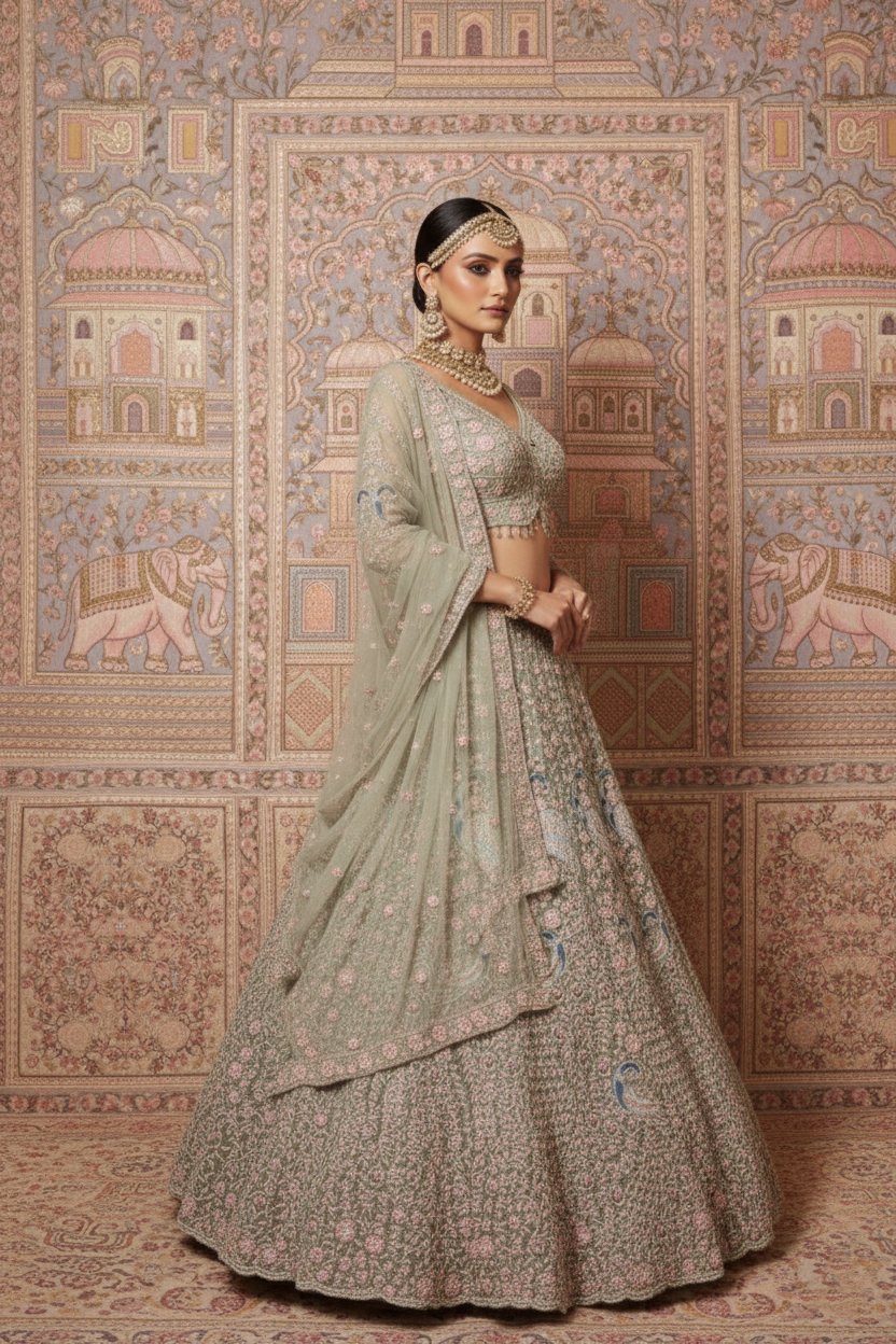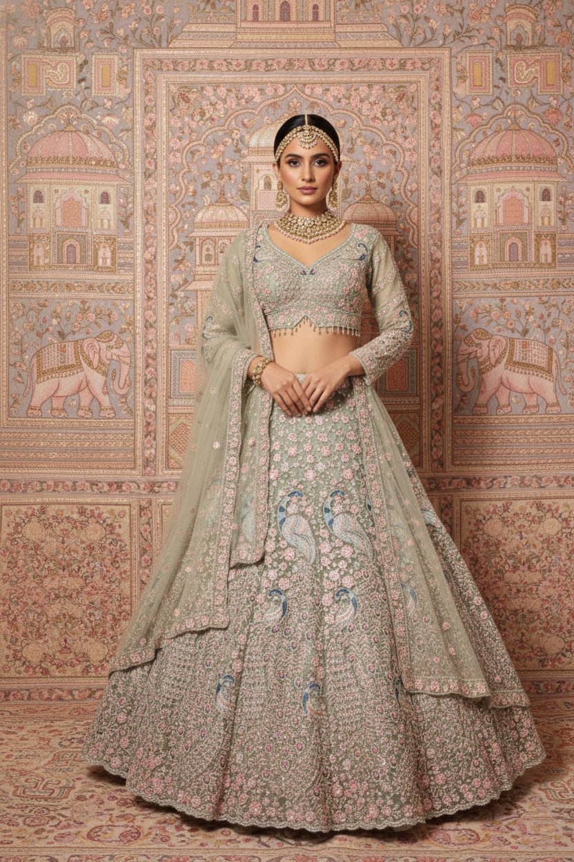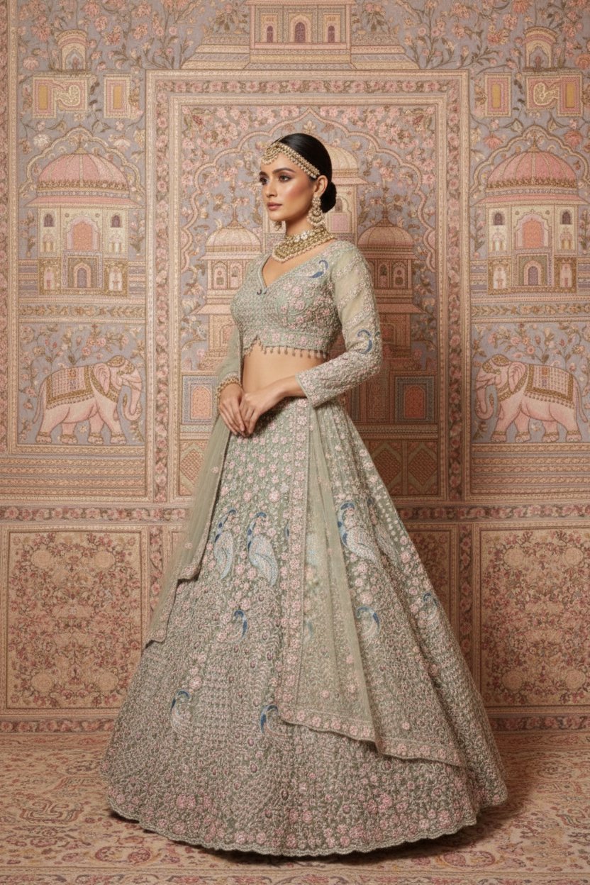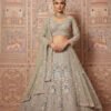 The matching blouse is beautifully embellished to enhance the lehengaโs intricate detailing, while the sheer embroidered dupatta adds lightness, movement, and sophistication to the ensemble. Every element reflects skilled artistry, making this lehenga a timeless choice for brides who appreciate refined luxury.