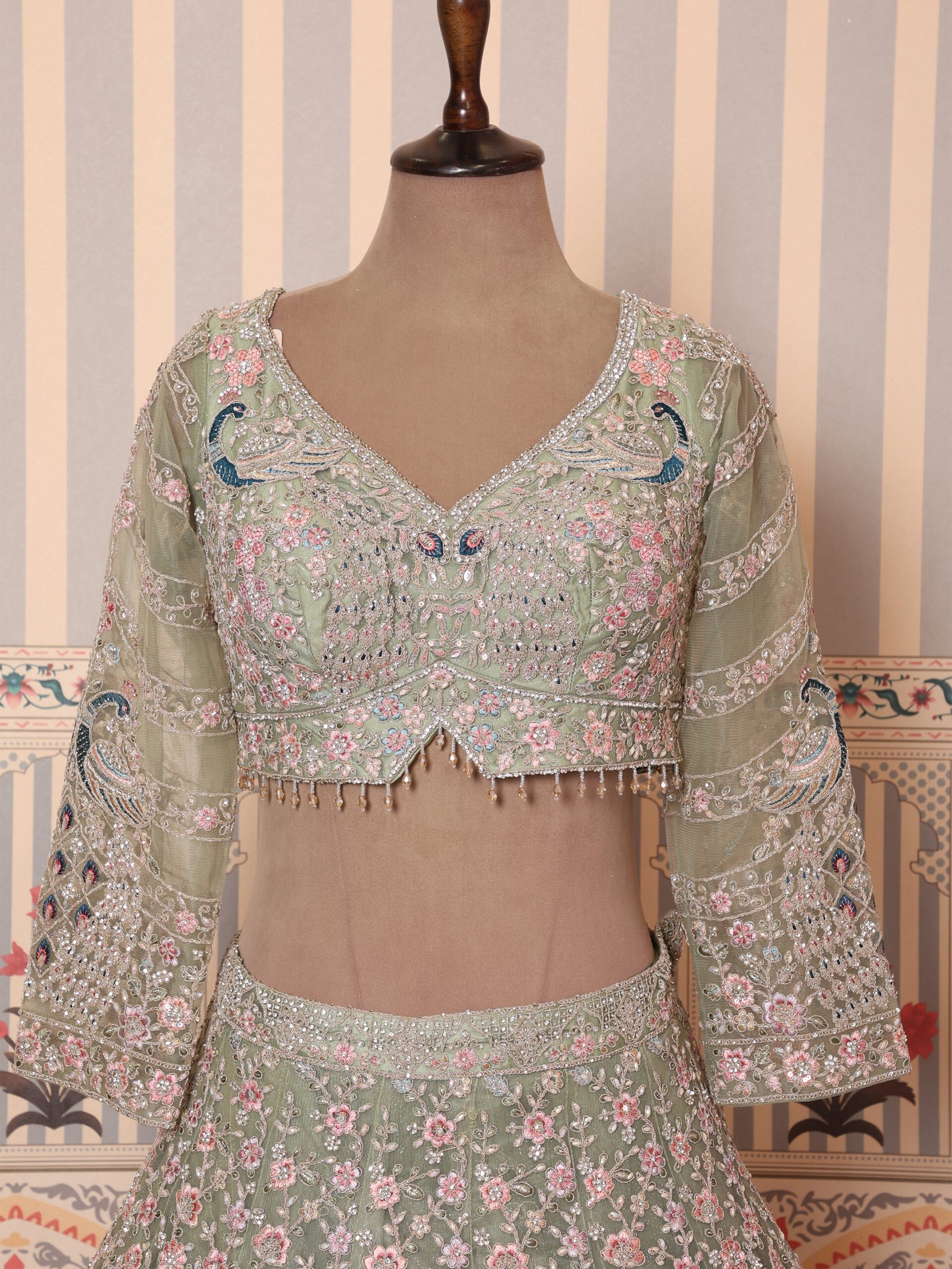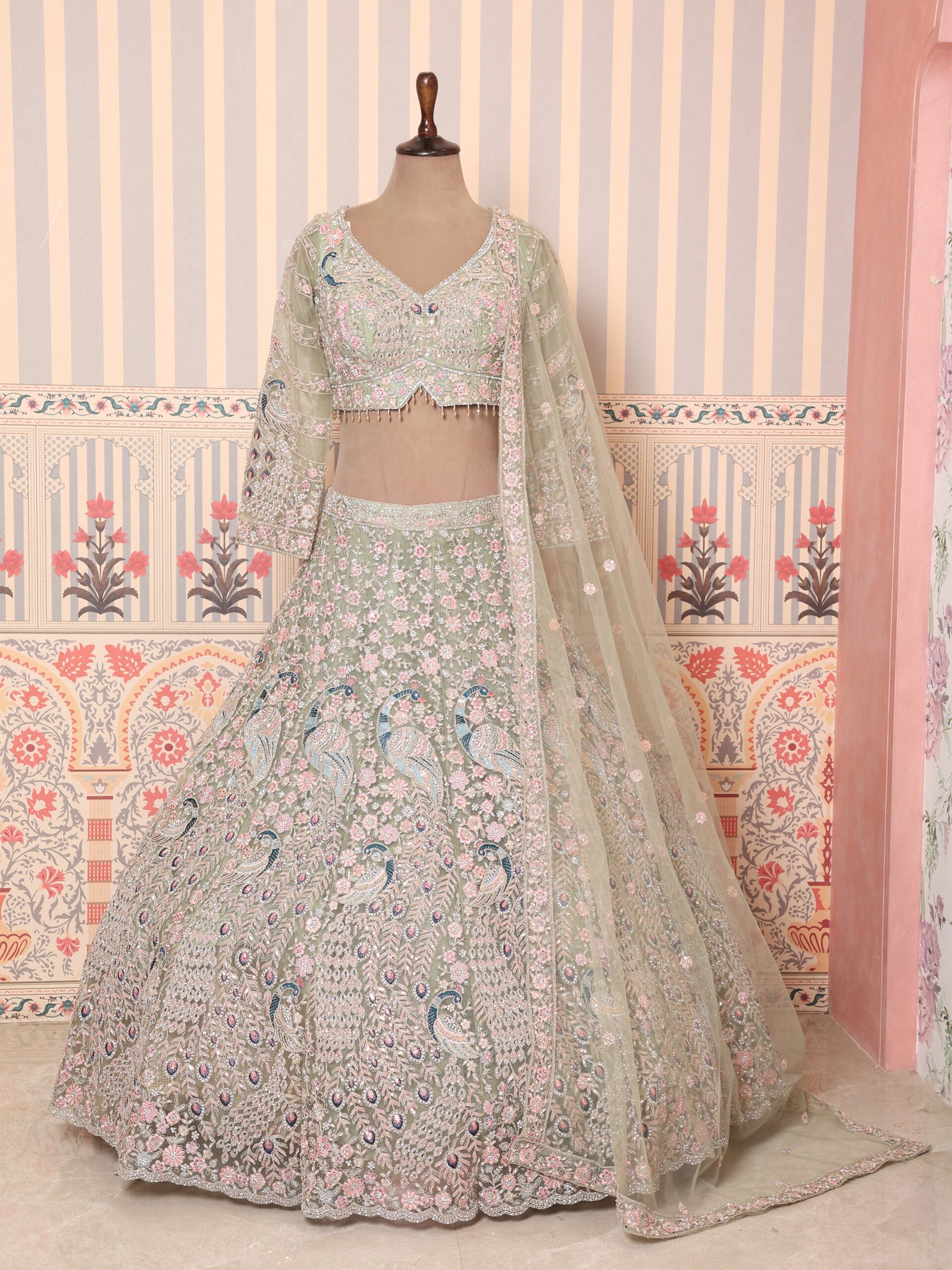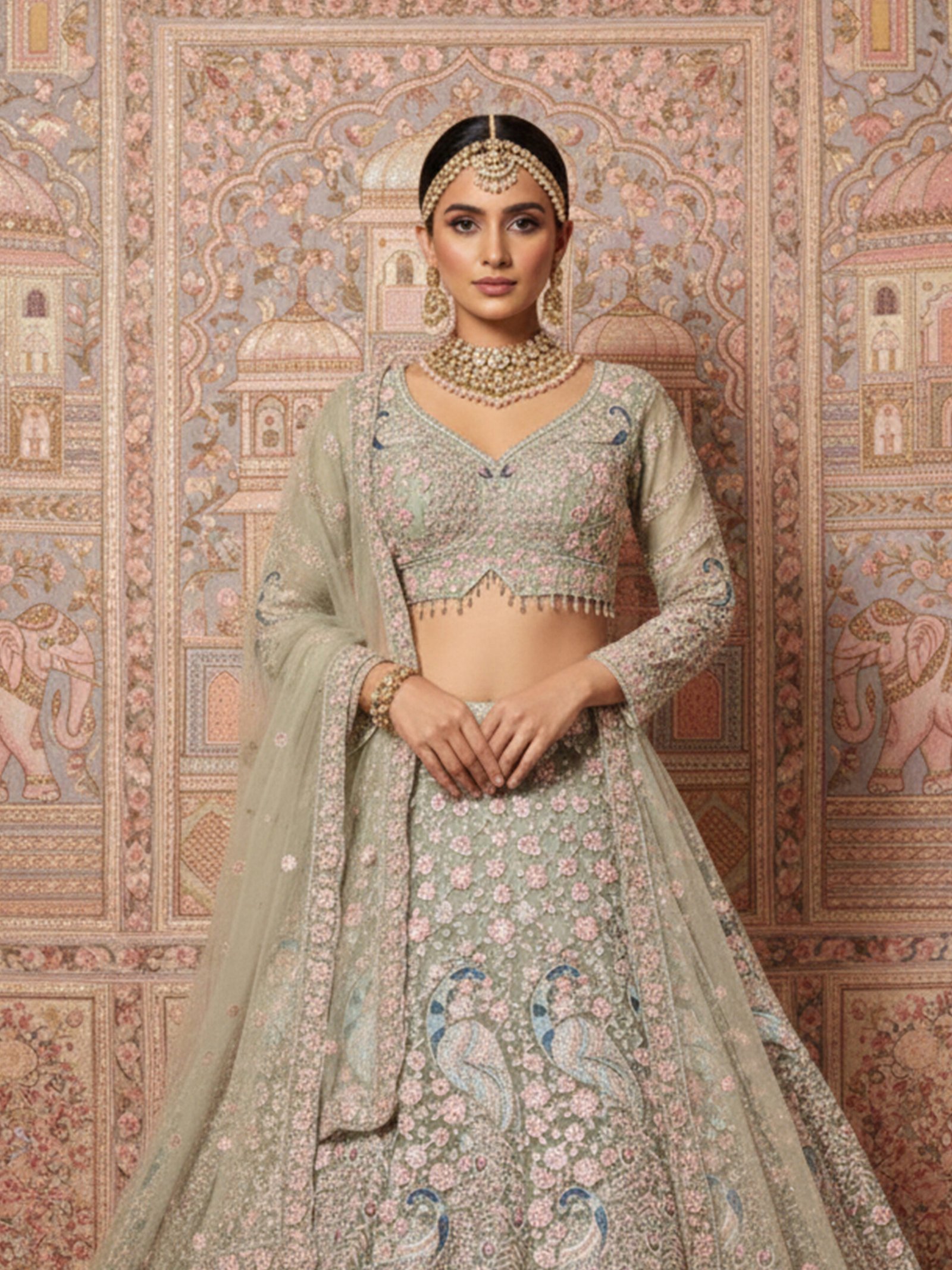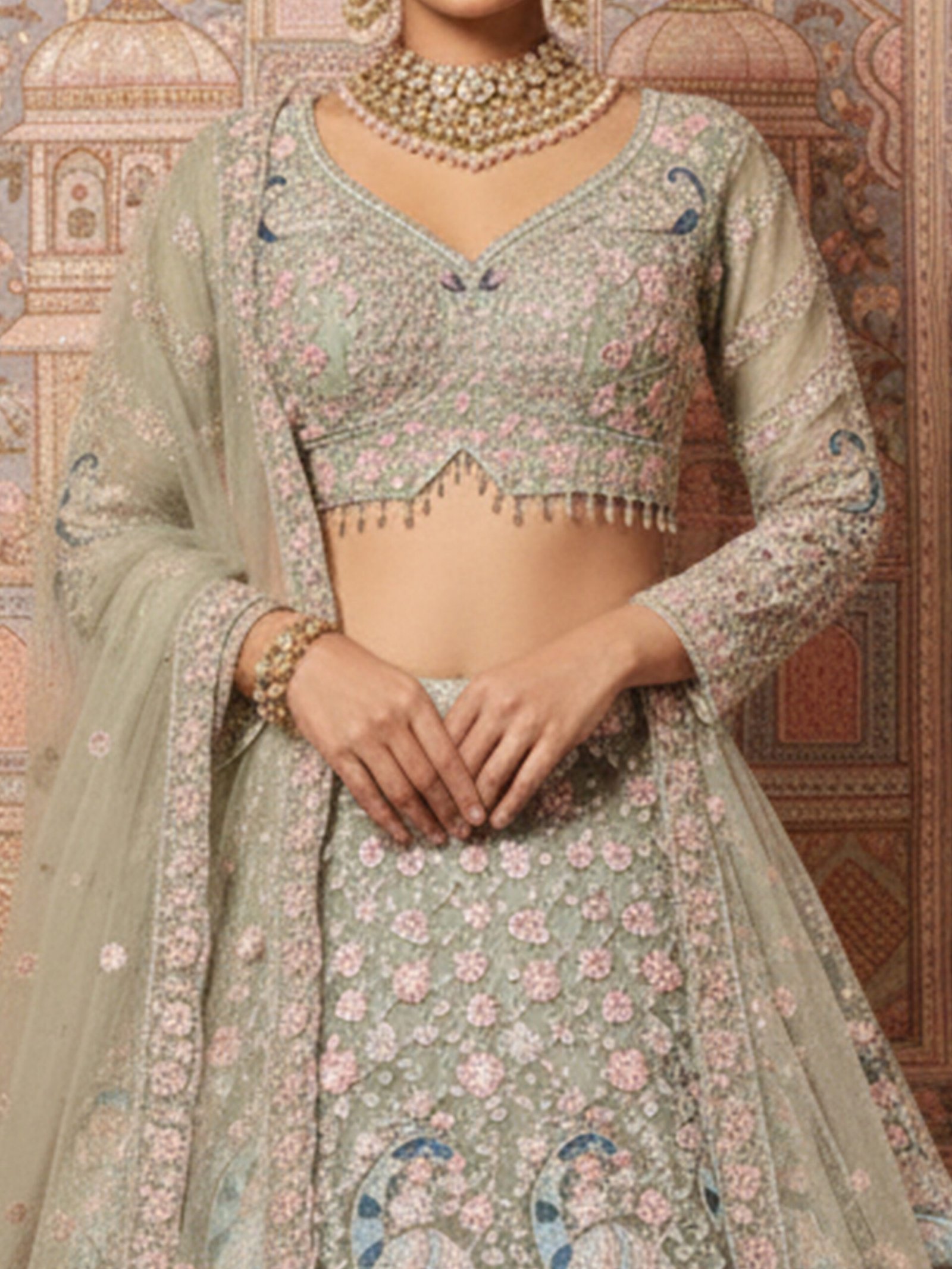 The matching blouse is beautifully embellished to enhance the lehengaโs intricate detailing, while the sheer embroidered dupatta adds lightness, movement, and sophistication to the ensemble. Every element reflects skilled artistry, making this lehenga a timeless choice for brides who appreciate refined luxury.
