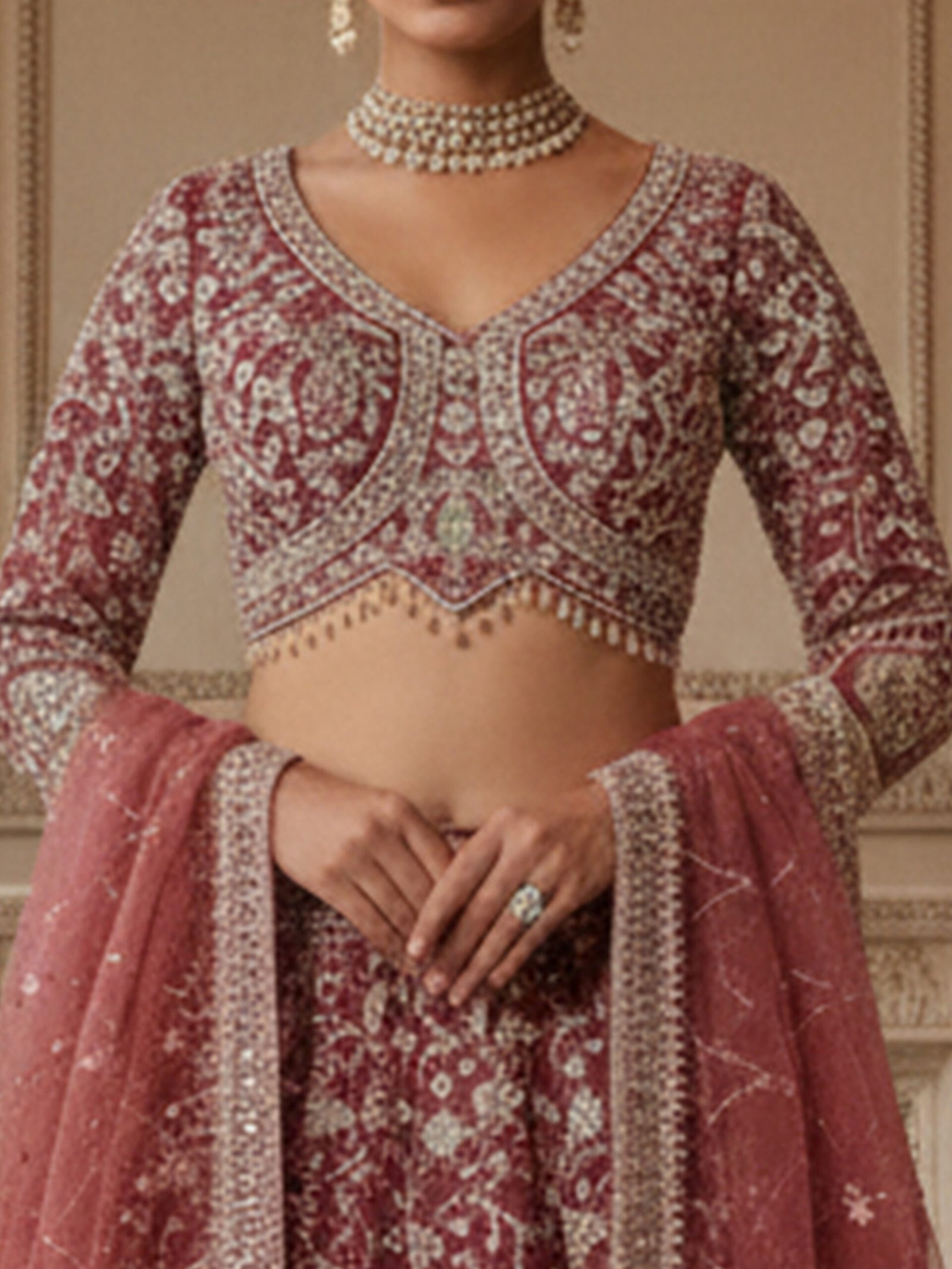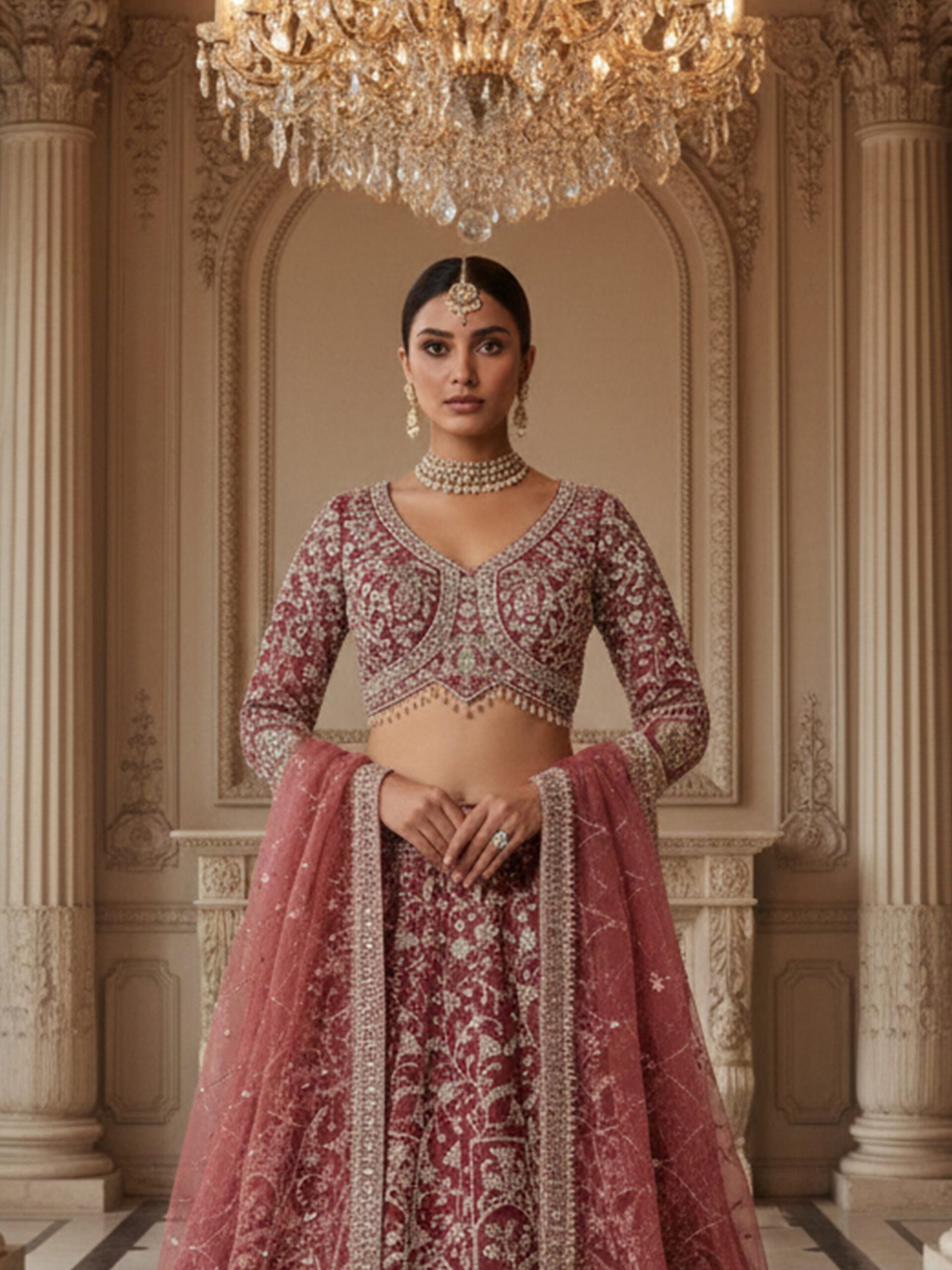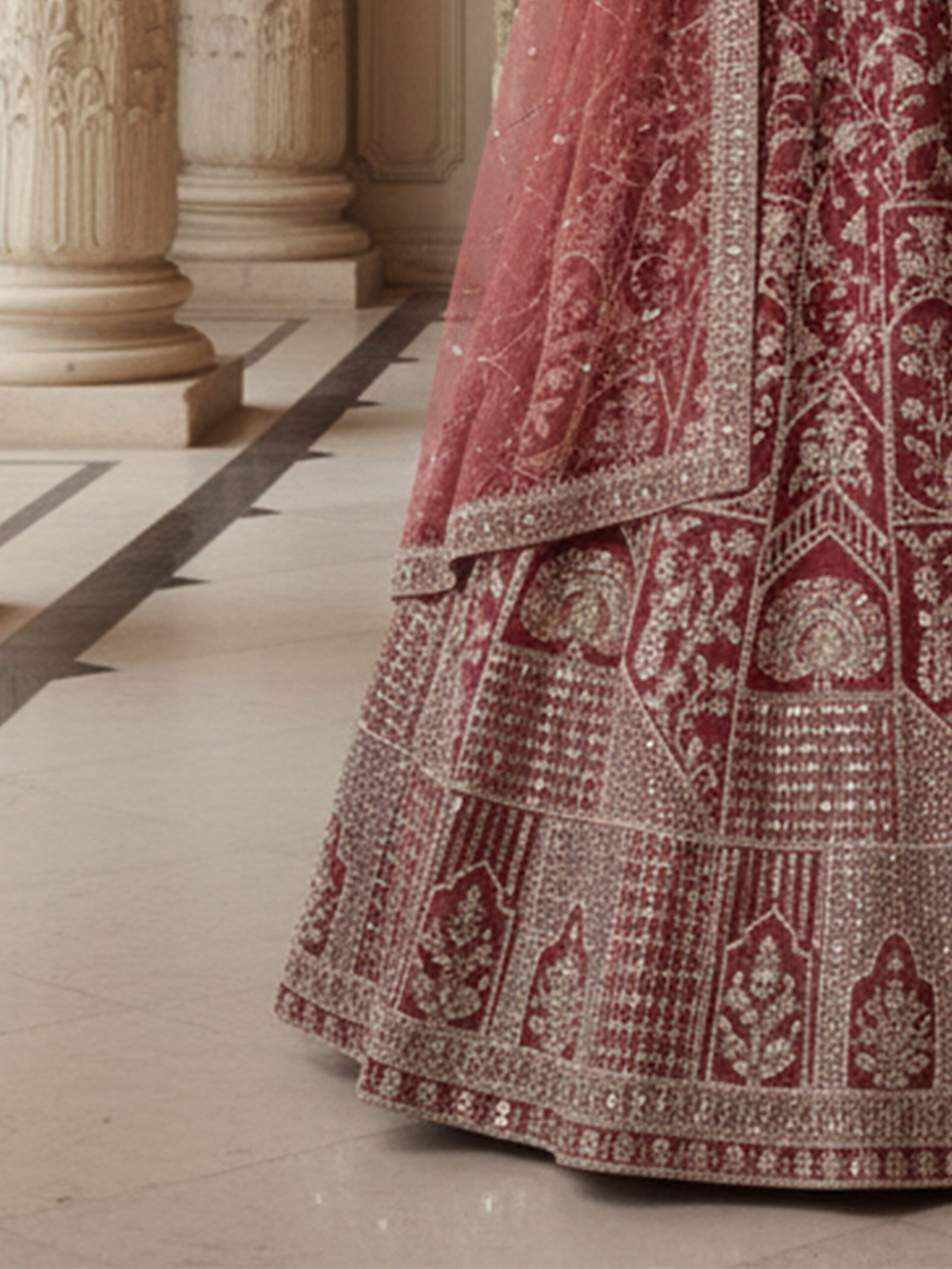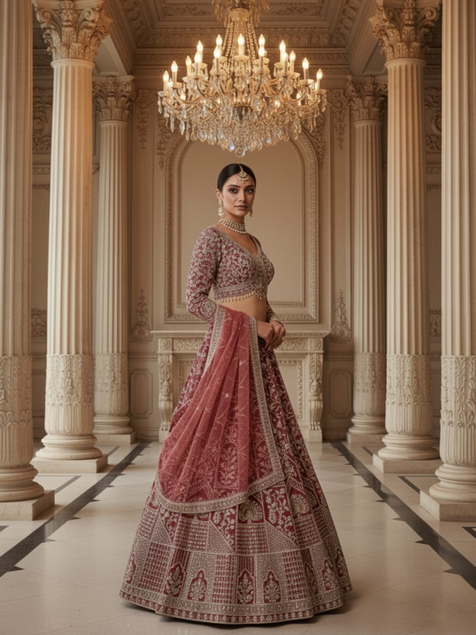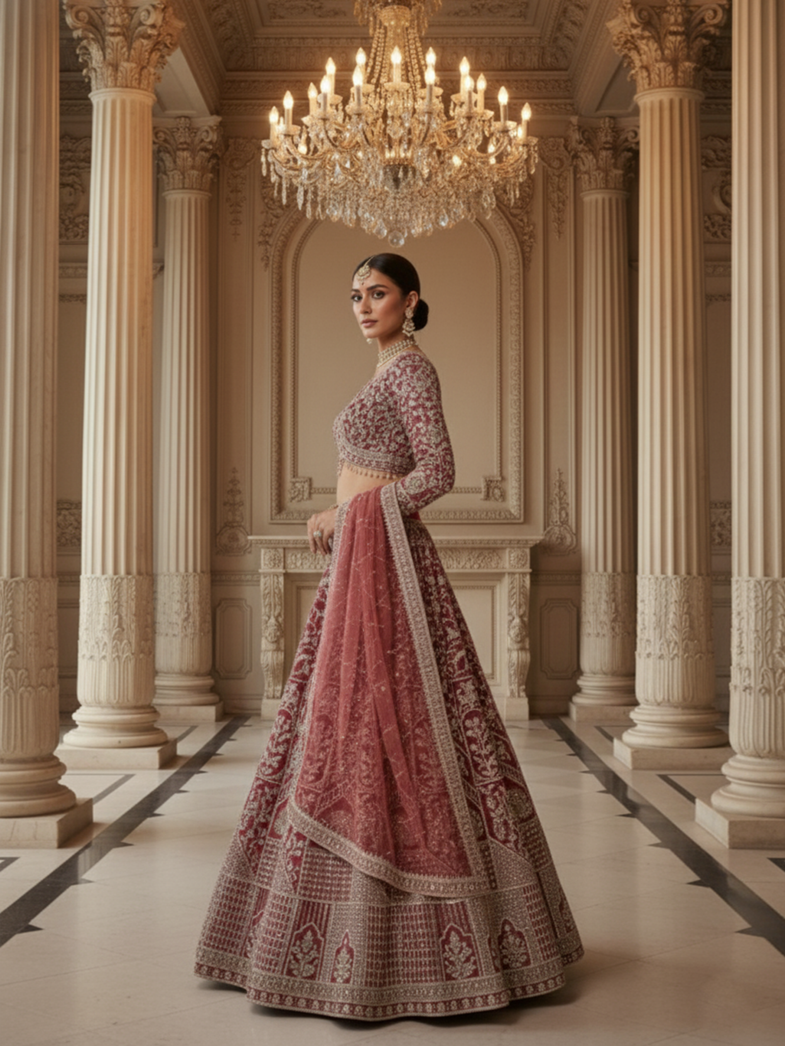 The Vintage Wine Palace Hand-Embroidered Bridal Lehenga Set captures timeless royal elegance inspired by heritage palace interiors. Crafted in a rich vintage wine hue, the lehenga features elaborate hand embroidery with traditional motifs and finely detailed borders that create a majestic and structured silhouette.
