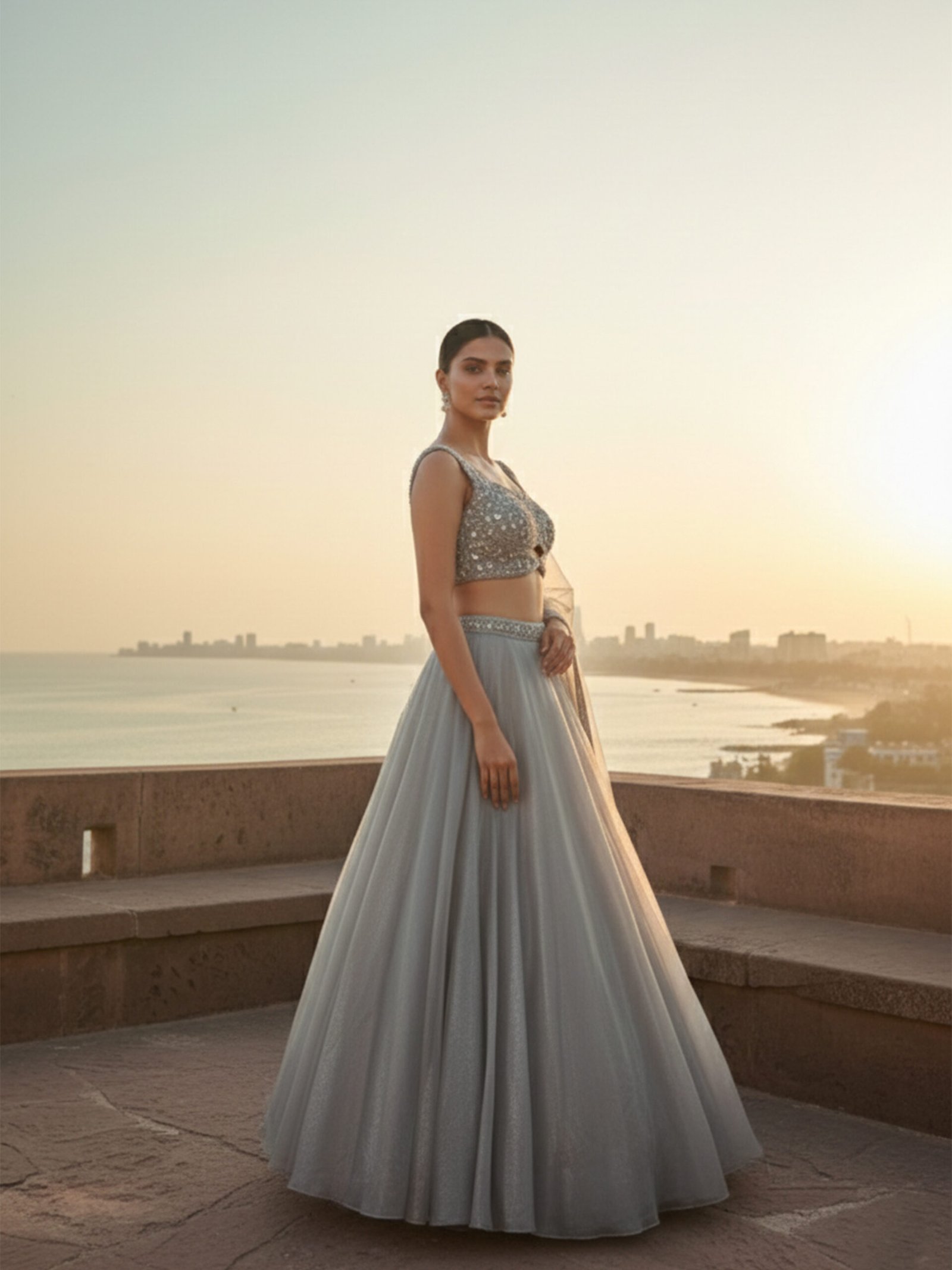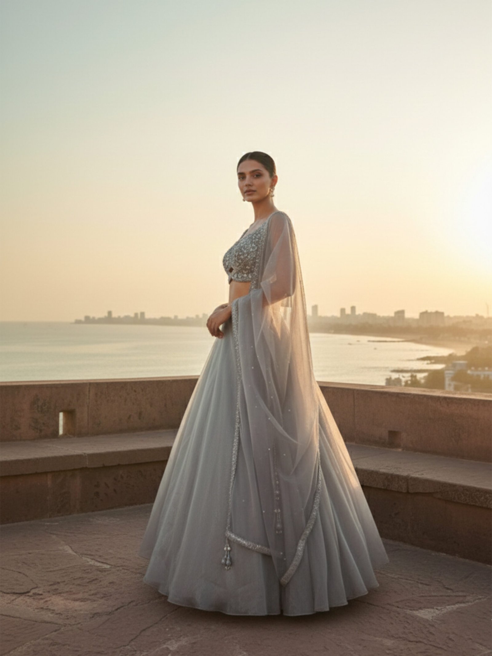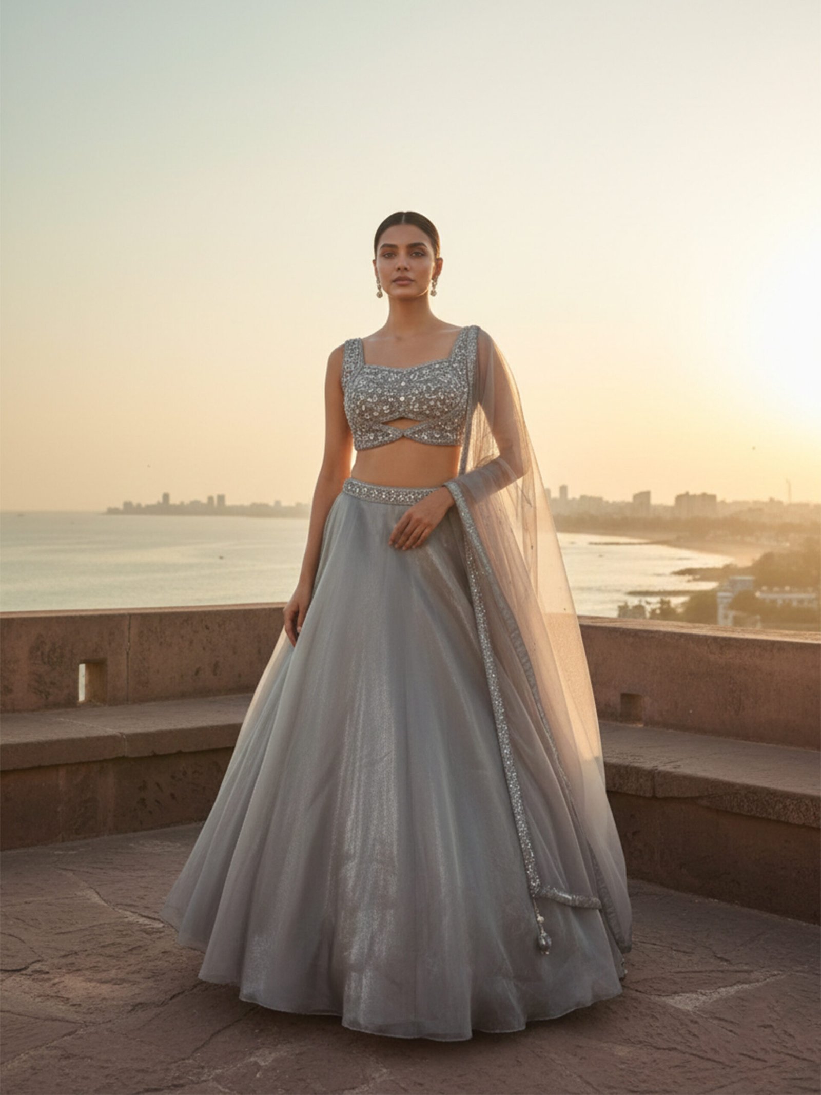 The Silver Mist Embellished Bridal Lehenga Set is a refined blend of modern elegance and understated luxury. Crafted in a luminous silver-grey tone, this lehenga showcases delicate sequin and thread embroidery that adds subtle sparkle while maintaining a clean, sophisticated aesthetic.