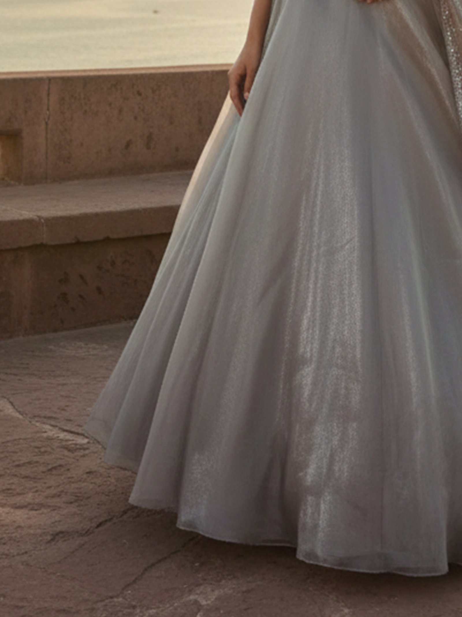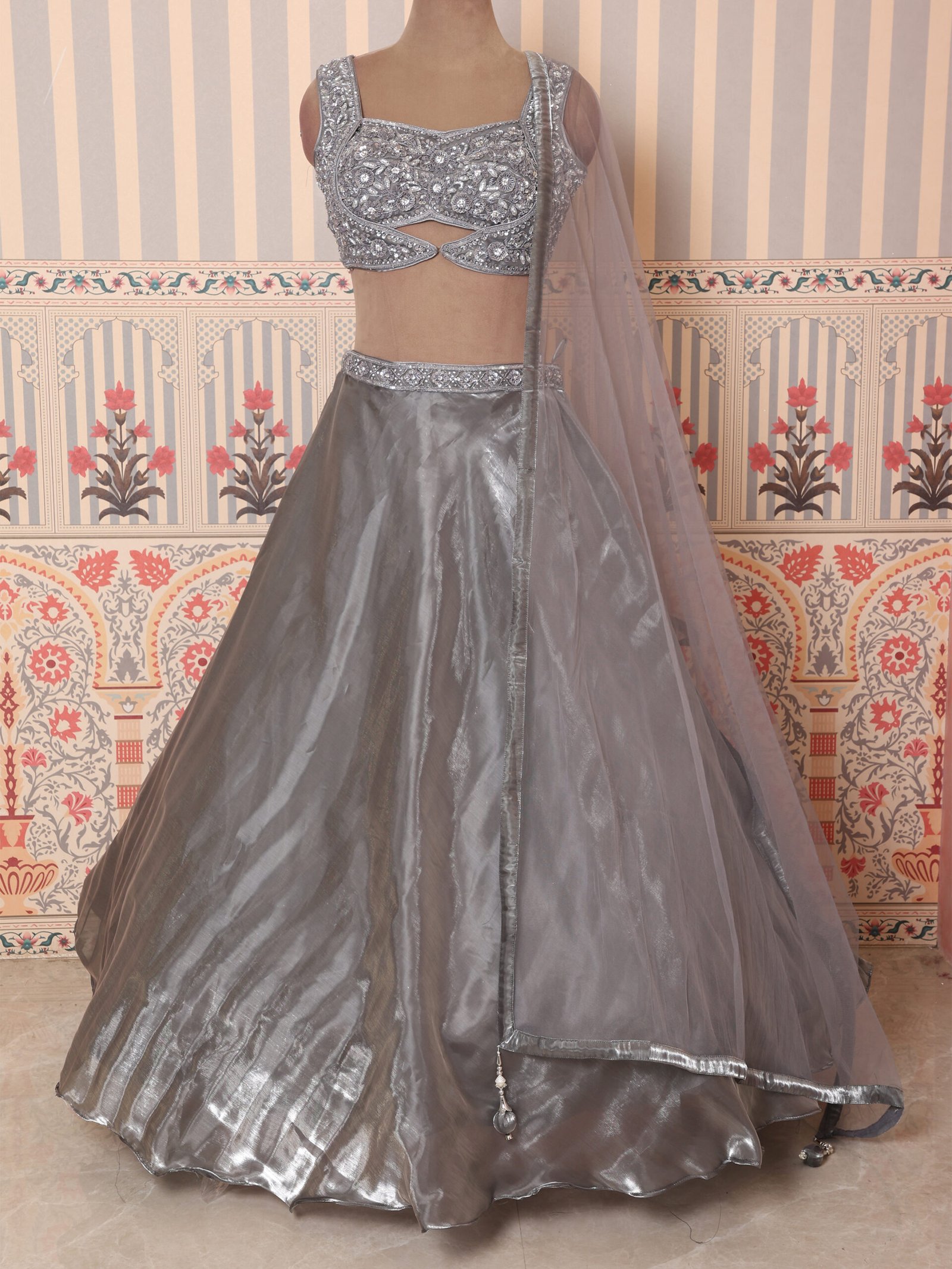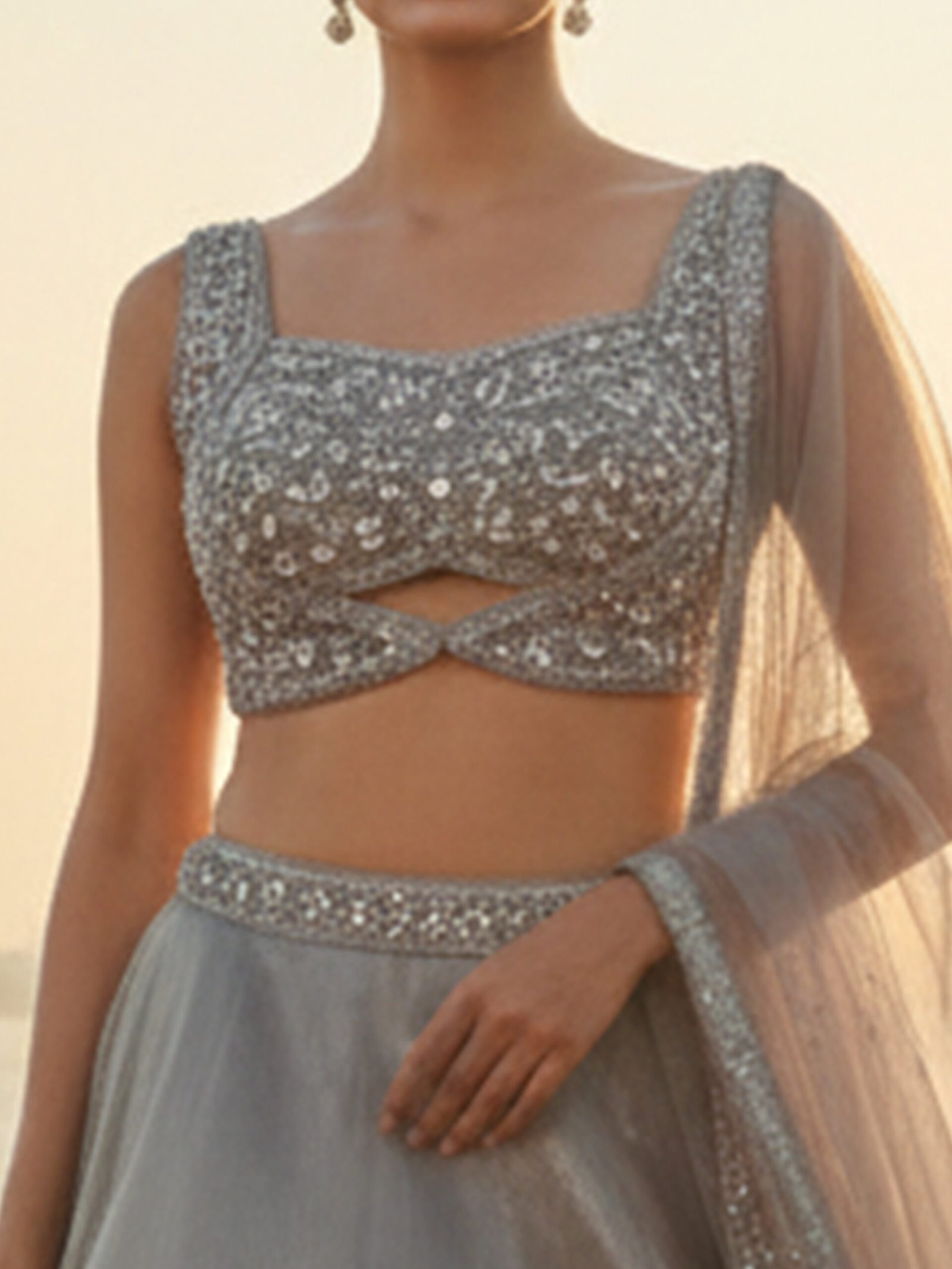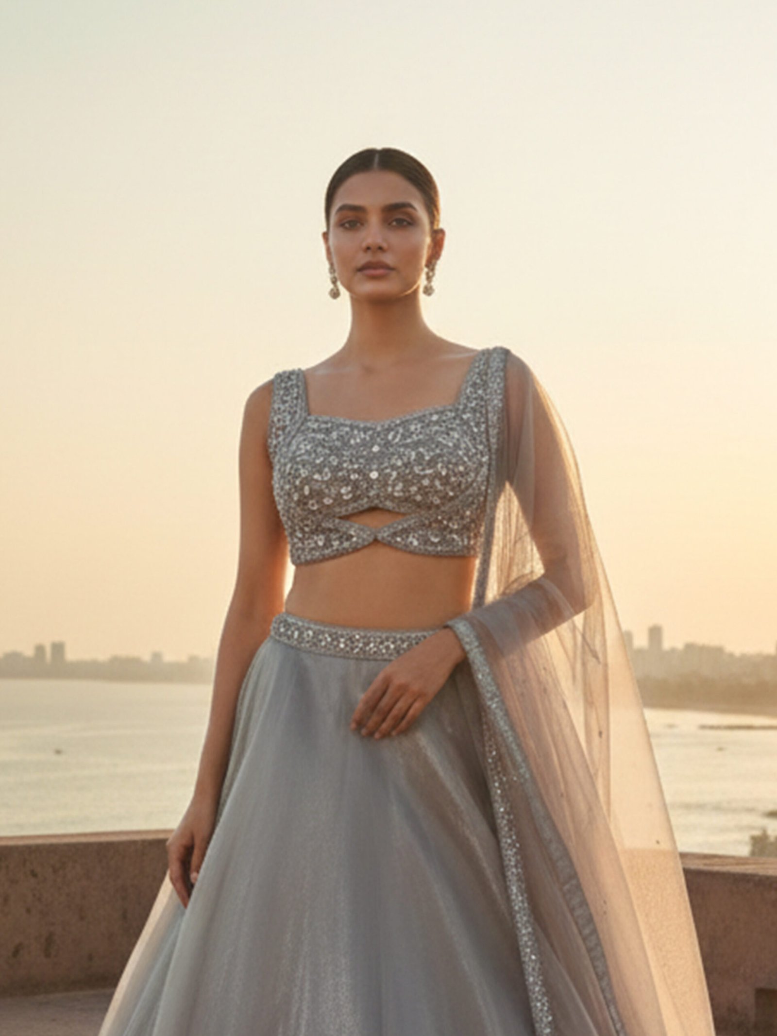 The Silver Mist Embellished Bridal Lehenga Set is a refined blend of modern elegance and understated luxury. Crafted in a luminous silver-grey tone, this lehenga showcases delicate sequin and thread embroidery that adds subtle sparkle while maintaining a clean, sophisticated aesthetic.