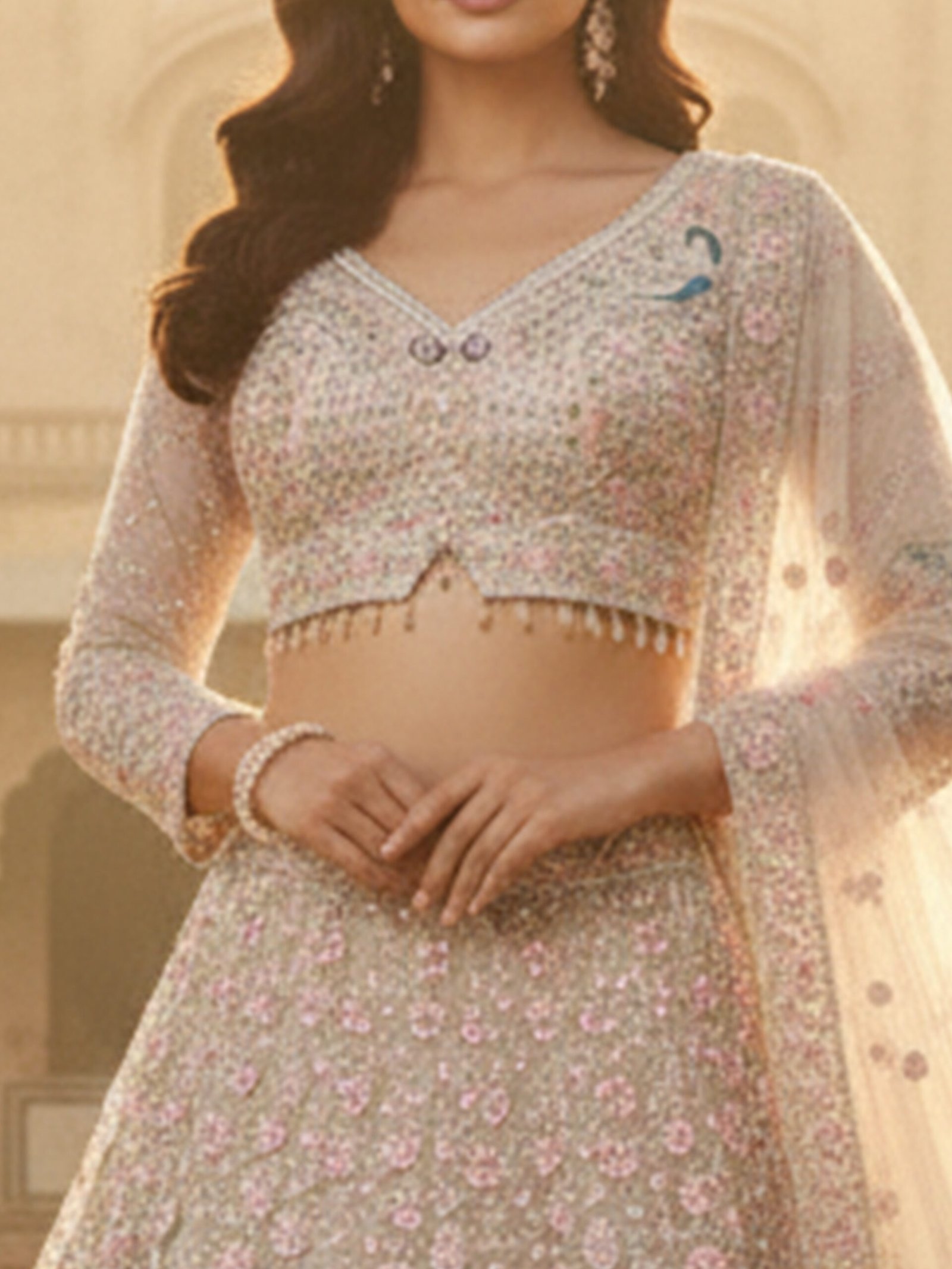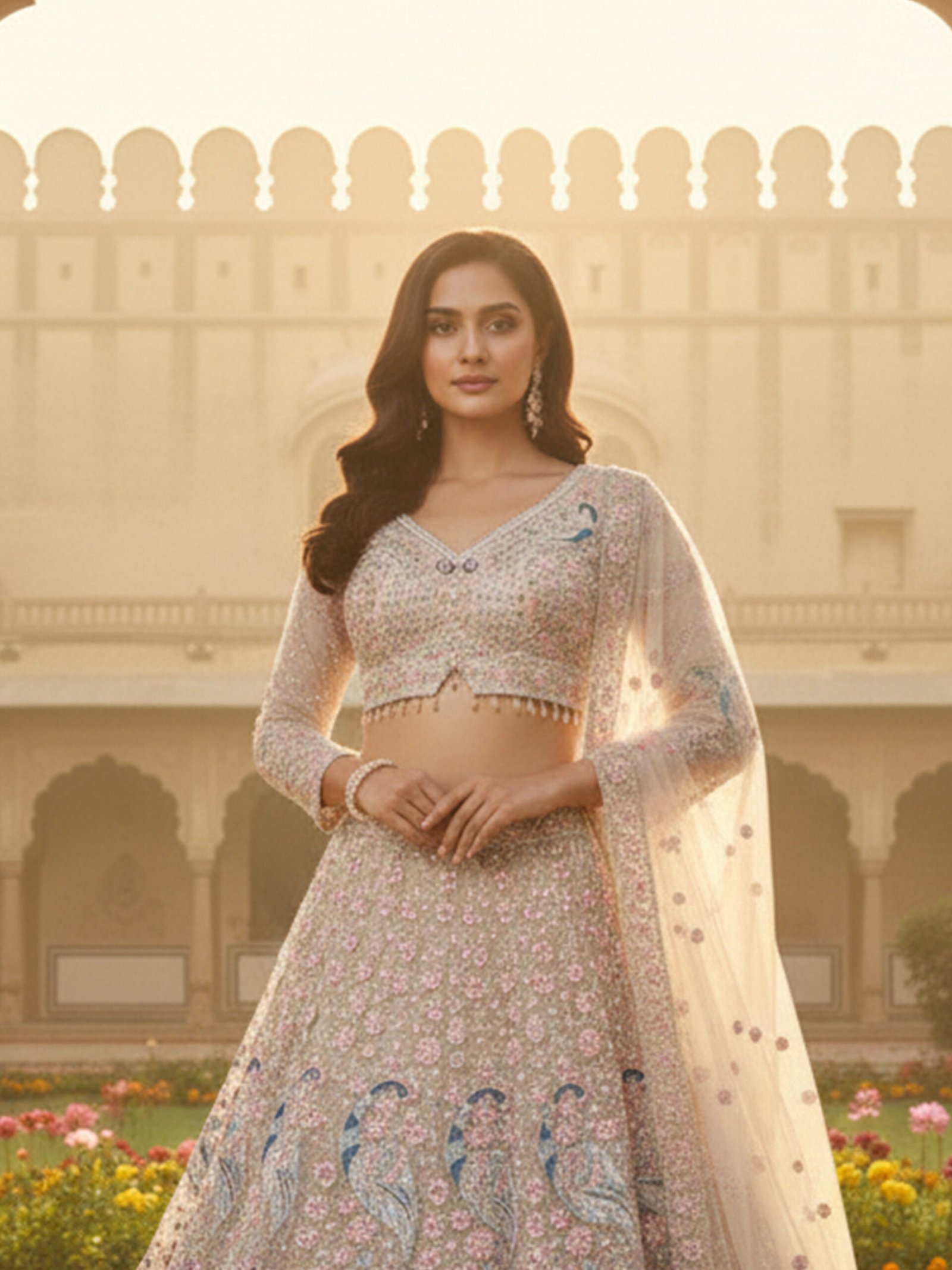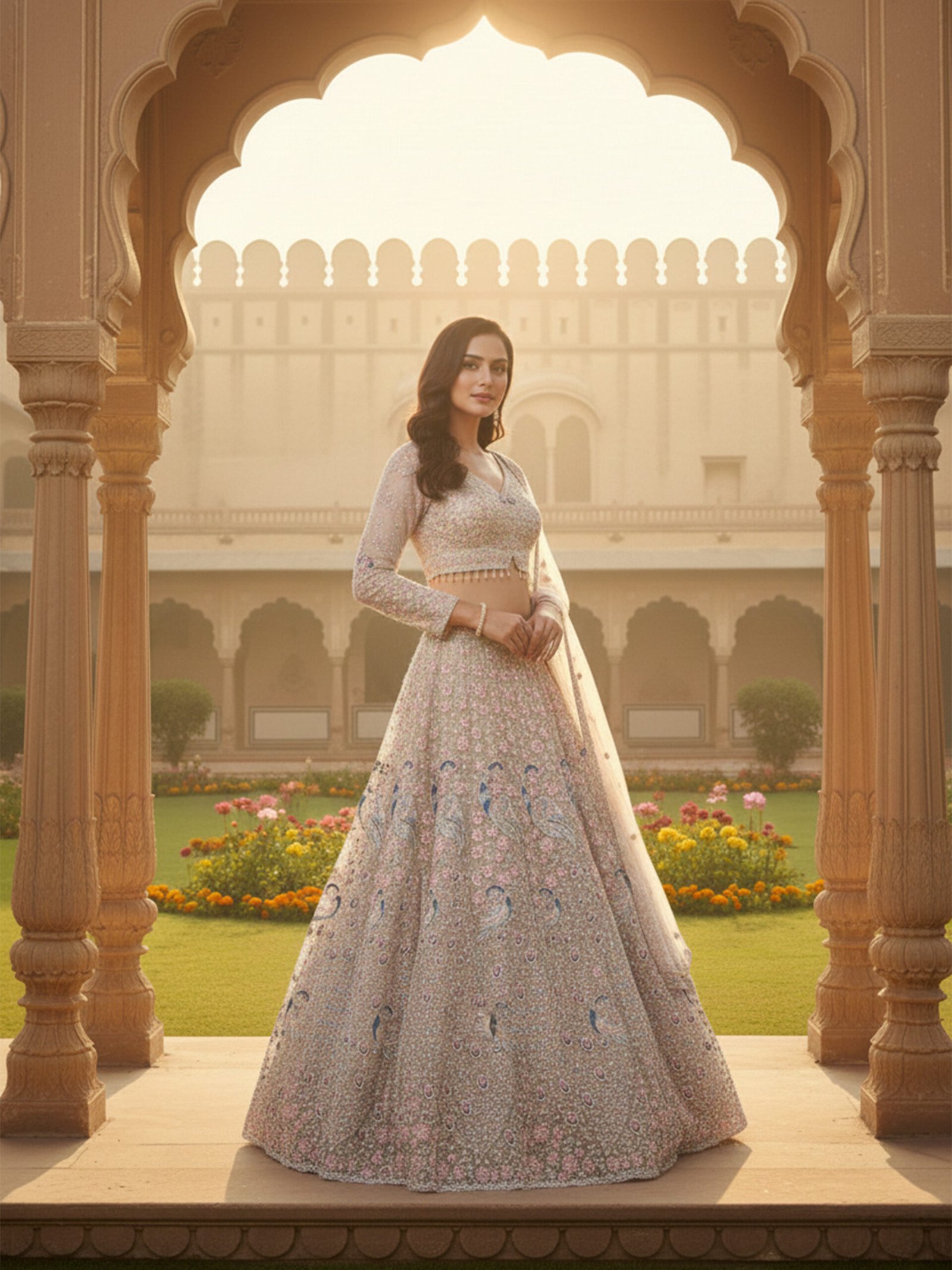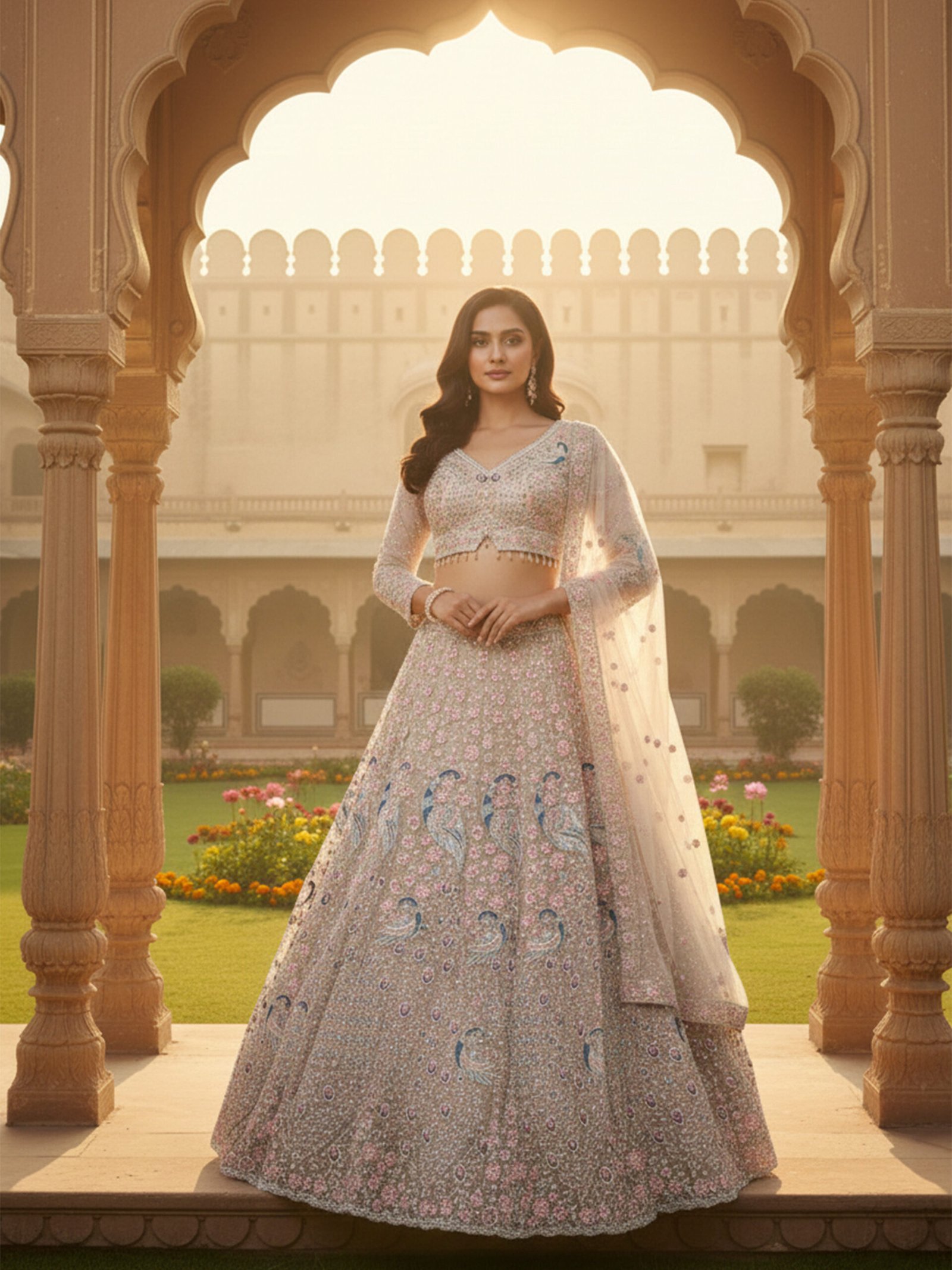 The coordinated blouse is exquisitely embellished to mirror the lehengaโs fine craftsmanship, while the sheer embroidered dupatta adds an airy softness and regal flow. Set against a palace courtyard backdrop, this ensemble captures the essence of timeless Indian royalty with a modern, understated charm.