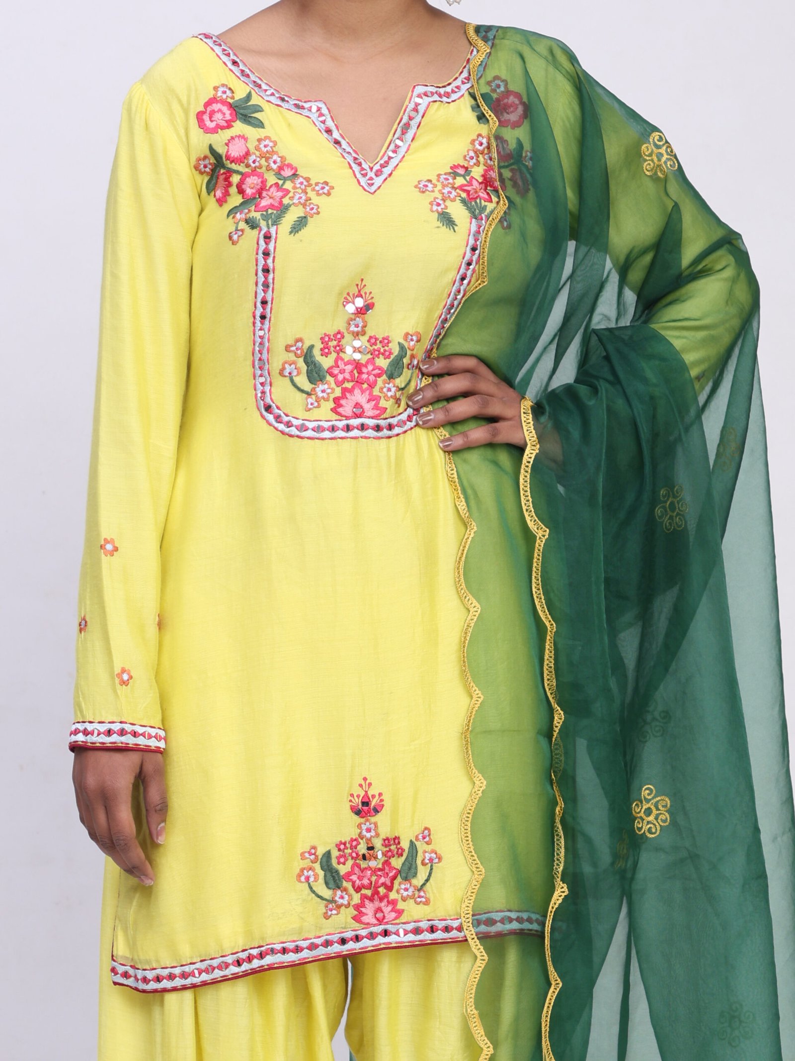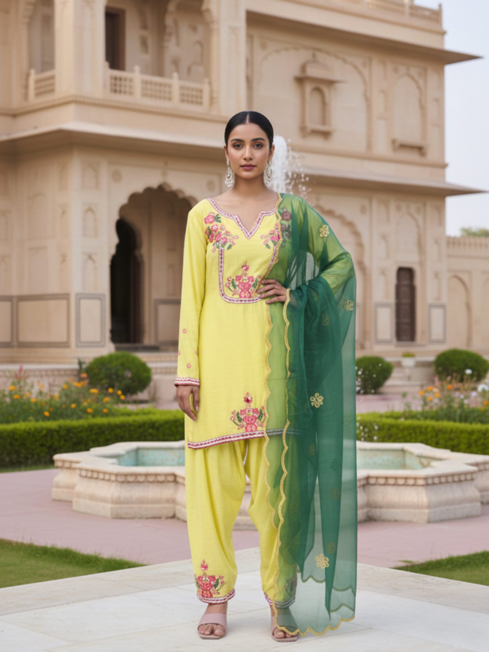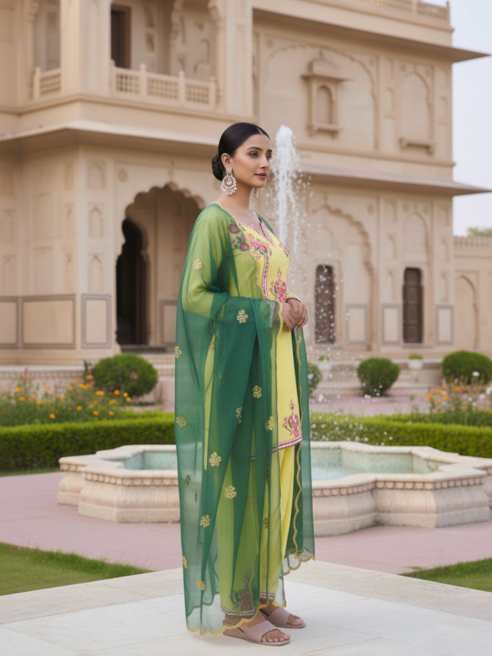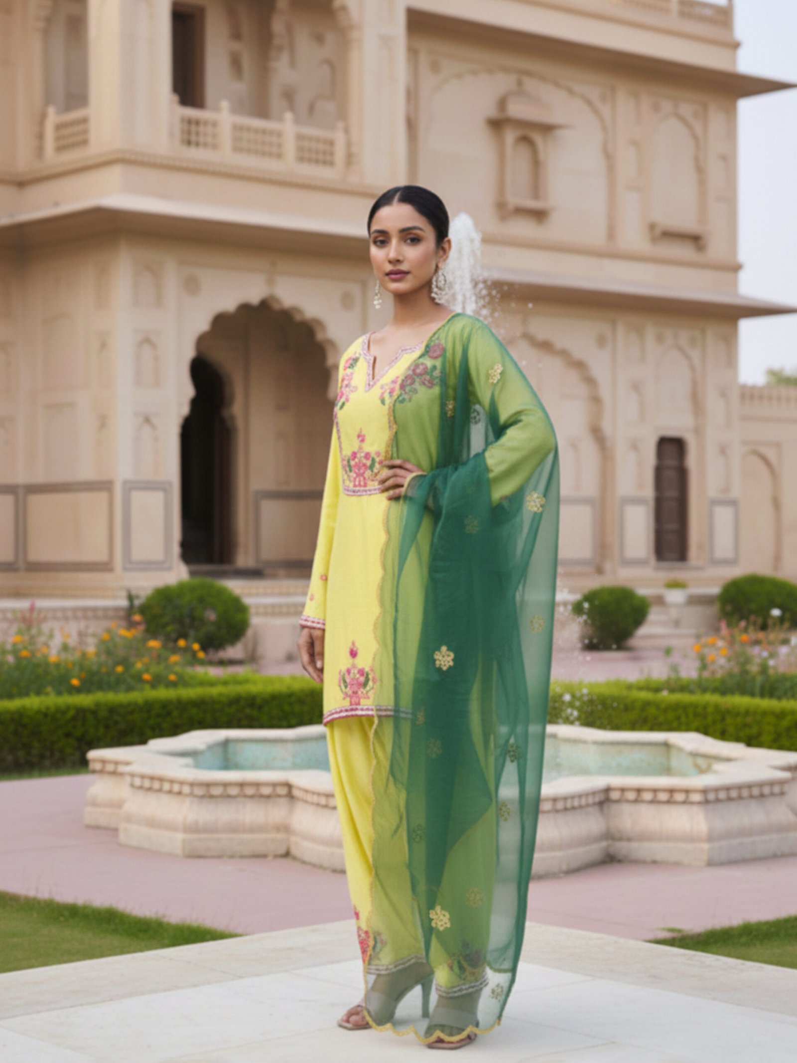 The Haldi Noor Handmade Kurta Set is a radiant celebration of tradition, craftsmanship, and festive elegance. Crafted in a refreshing haldi-yellow hue, this ensemble embodies joy and vibrance, beautifully balanced with intricate hand embroidery that reflects timeless Indian artistry. The kurta is tailored from a premium silk-blend fabric, offering a soft sheen and graceful fall, while delicate resham floral motifs and subtle zardosi accents enhance its refined appeal.