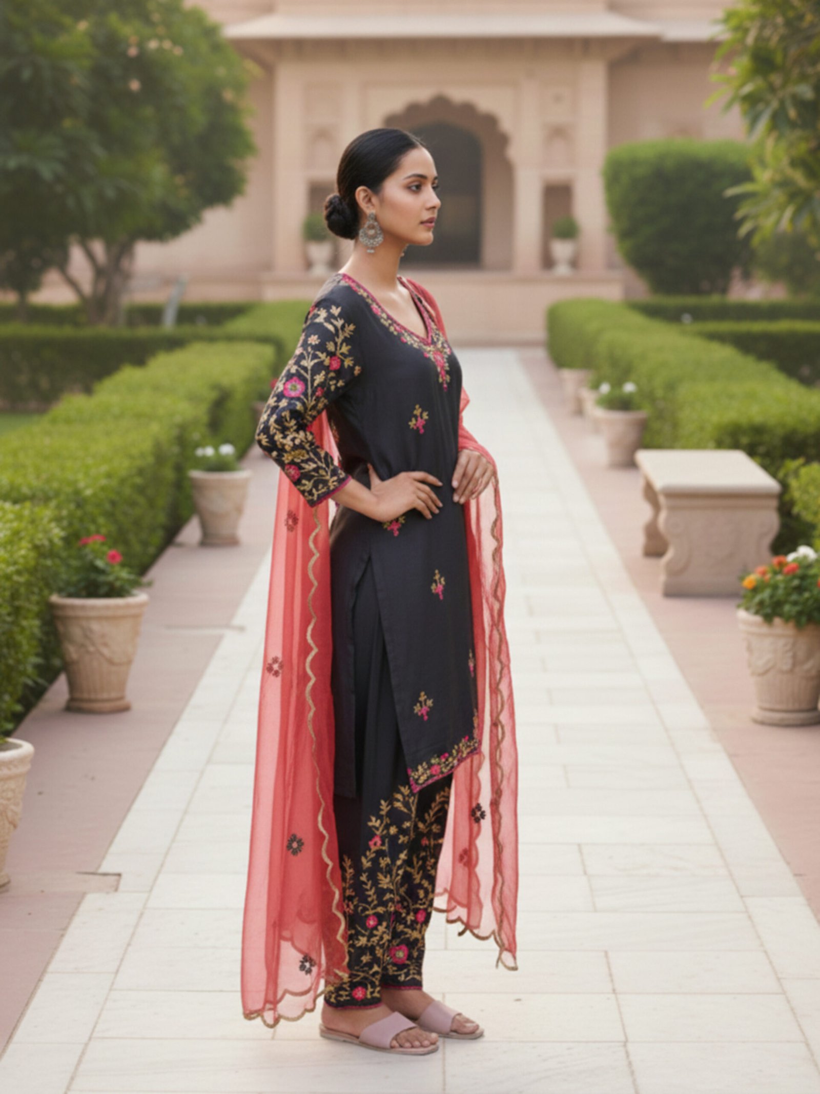 Bottom Style: Traditional tapered salwar with heavy artisanal embroidery on the ankles.